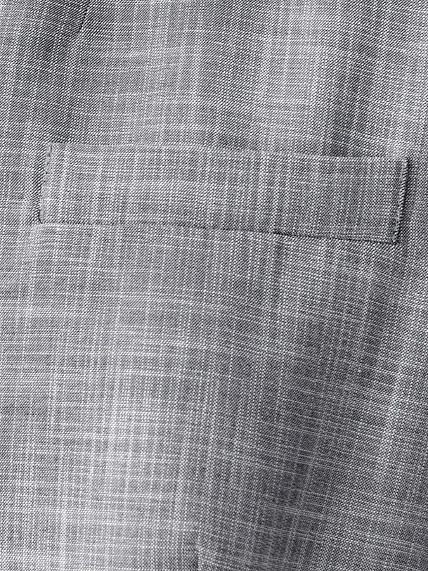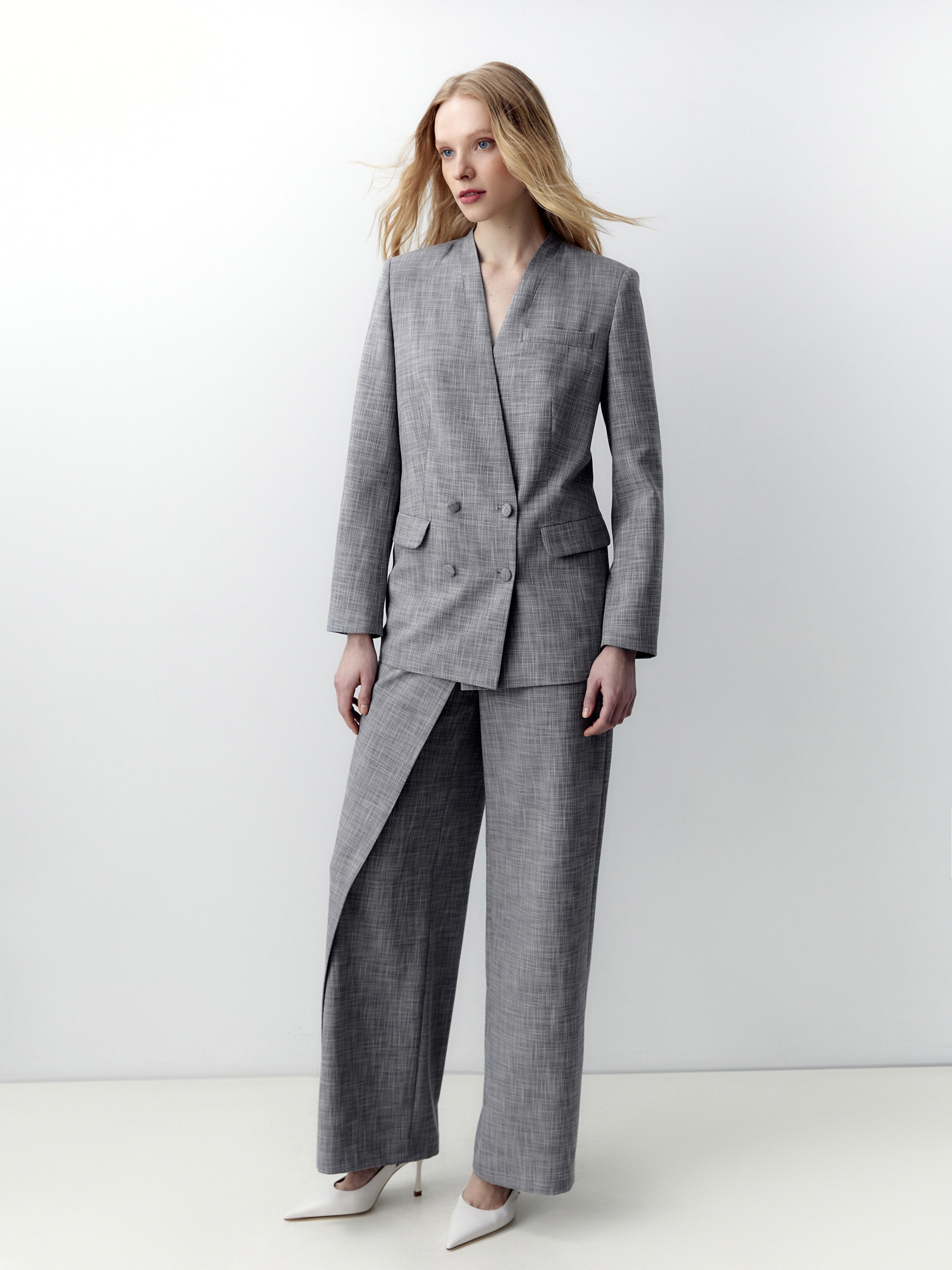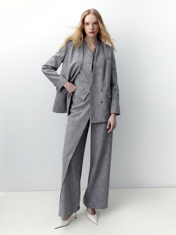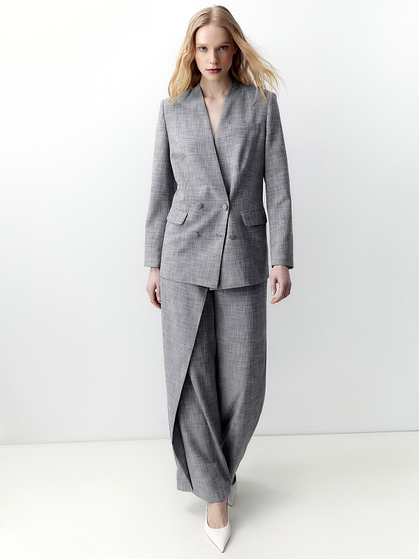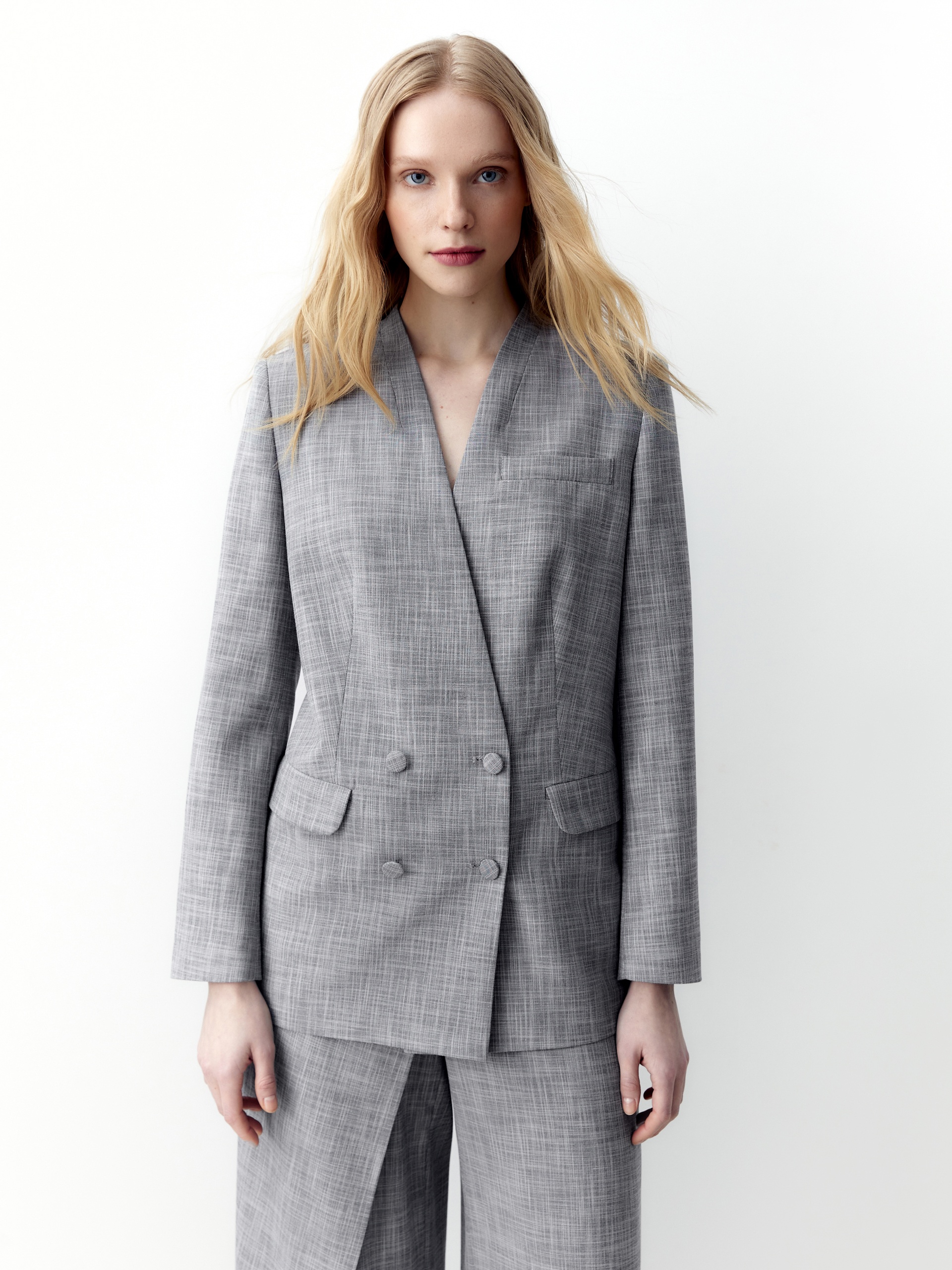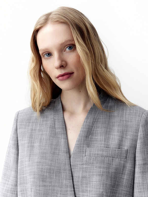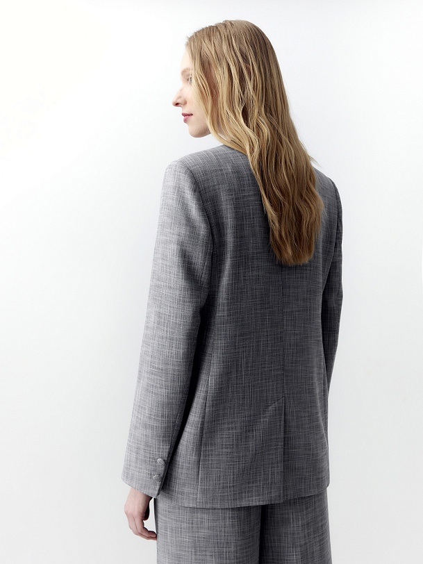 Прямой двубортный жакет свободного силуэта с небольшим цельнокроеным воротником стойкой и V-образным вырезом. Удлиненный жакет имеет прорезные карманы с клапанами и шлицу на спинке. Жакет выполнен из костюмной ткани серого меланжевого цвета.