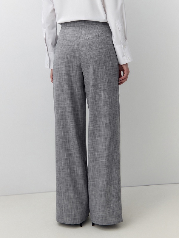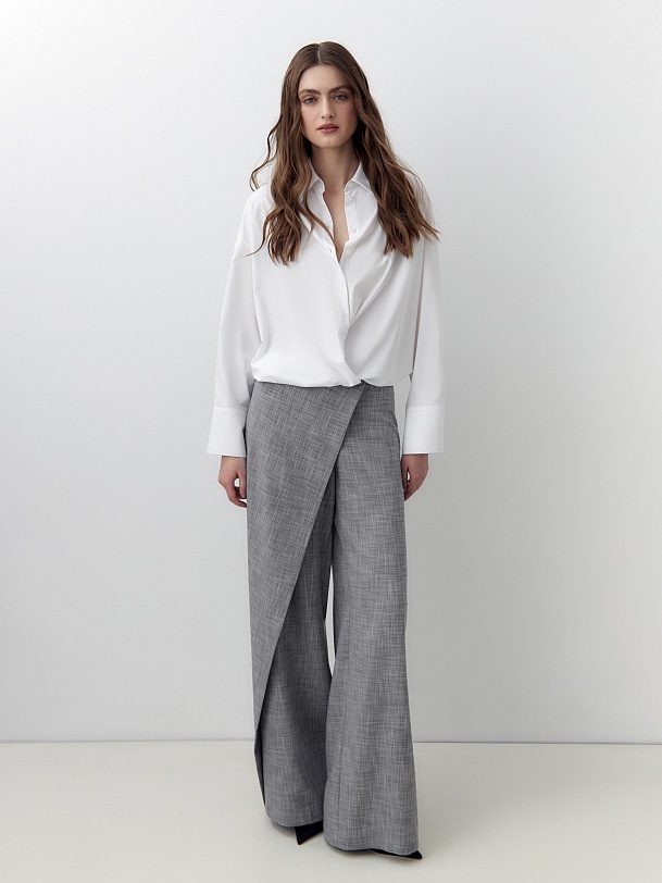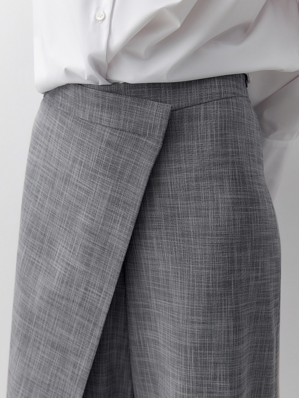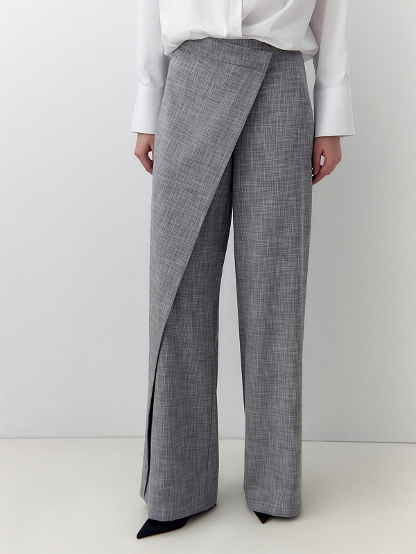 Широкие брюки с запахом на притачном поясе и потайной молнией в боковом шве. Запах закреплен. На спинке прорезные карманы листочки. Брюки выполнены из костюмной ткани серого меланжевого цвета.