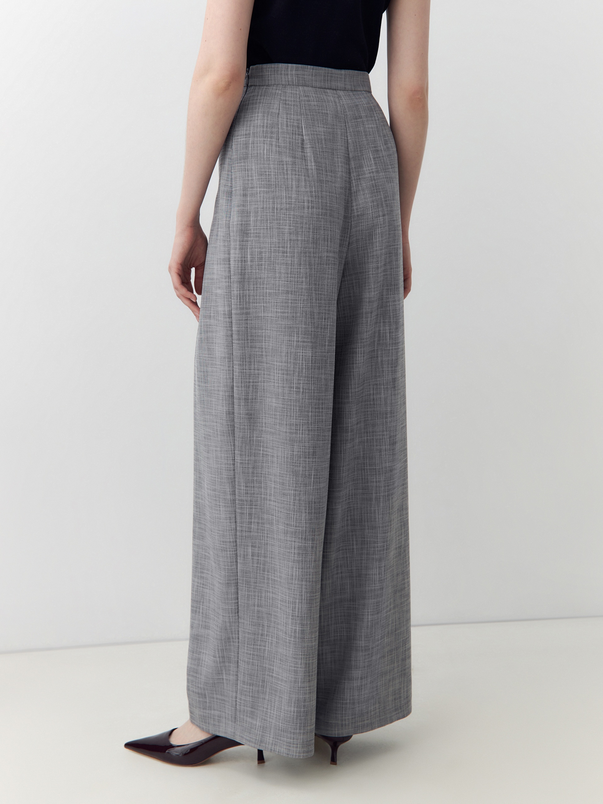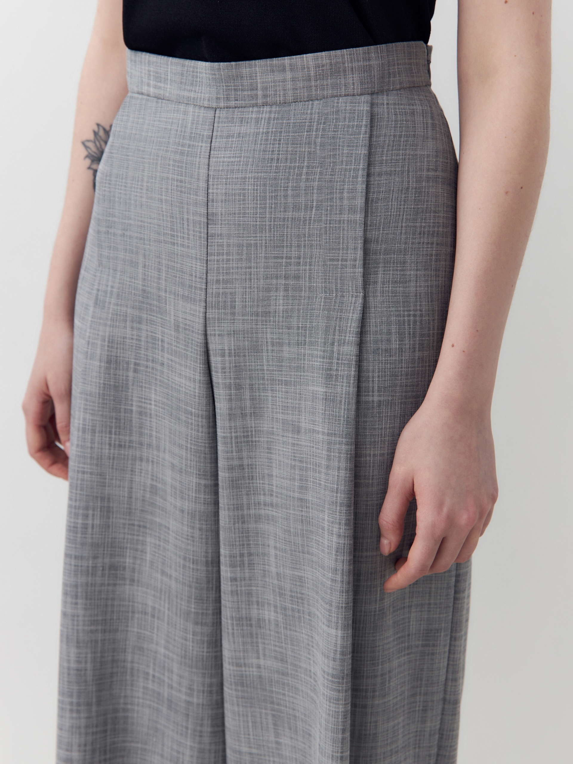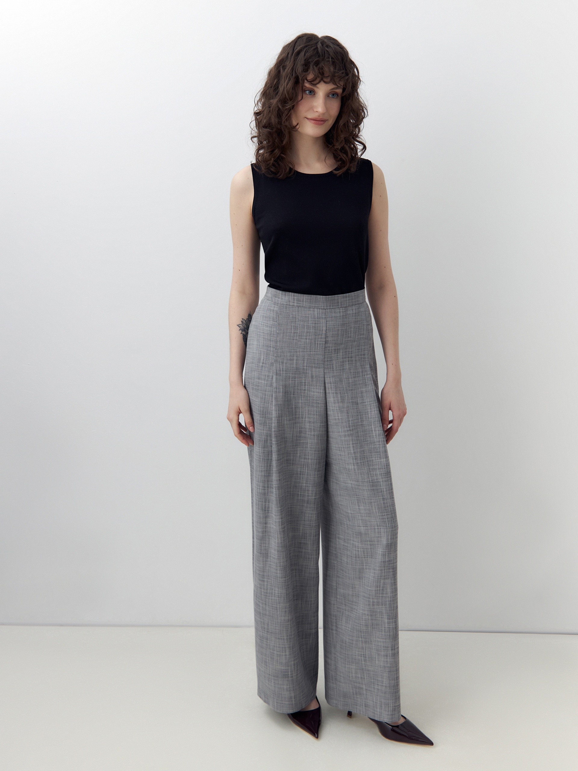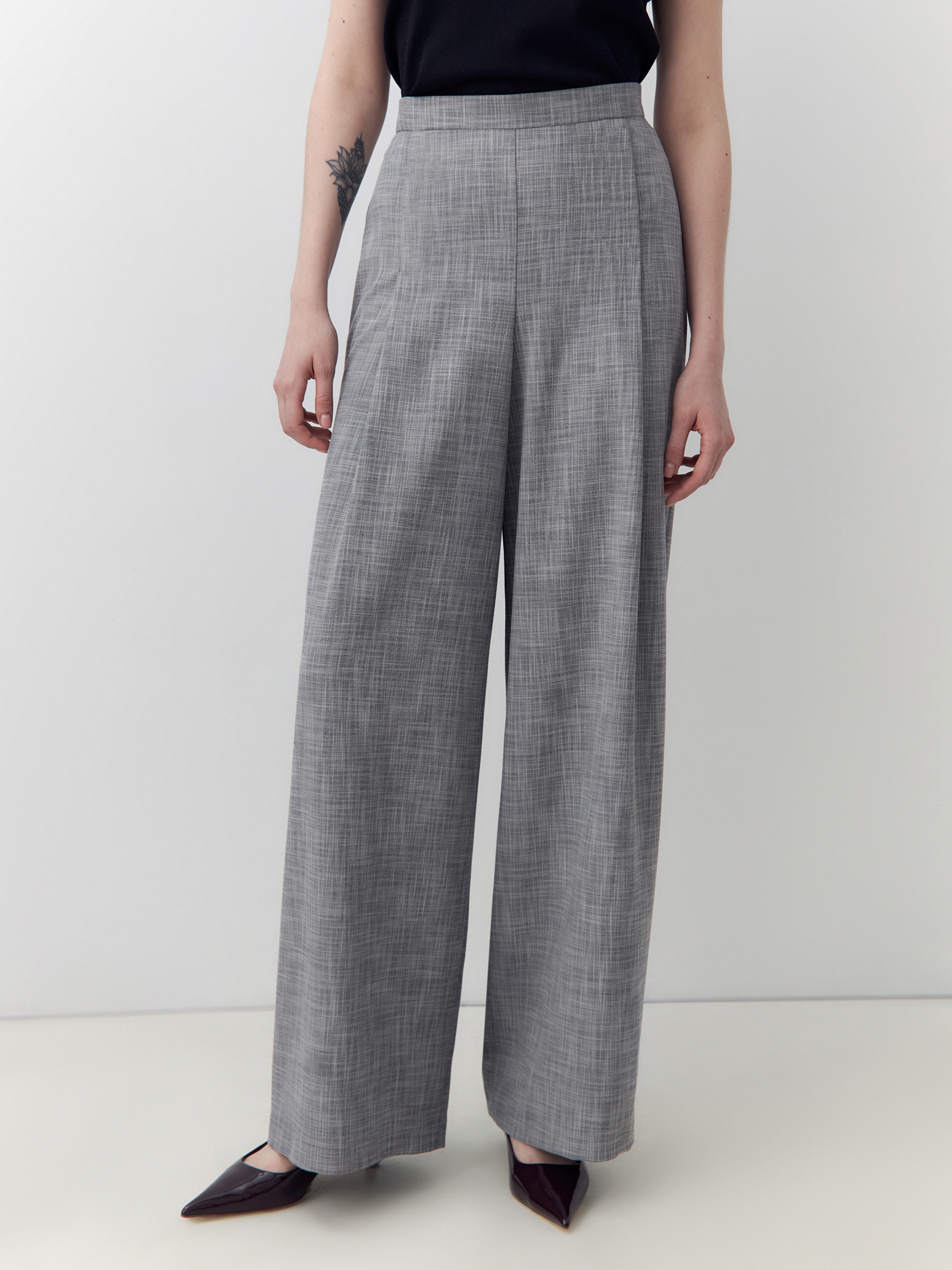 Широкие брюки на высокой посадке с застроченными складками из костюмной ткани серого меланжевого цвета с вискозой. С помощью различного верха данные брюки играют каждый раз в новом прочтении.