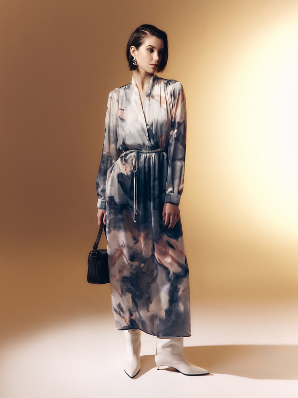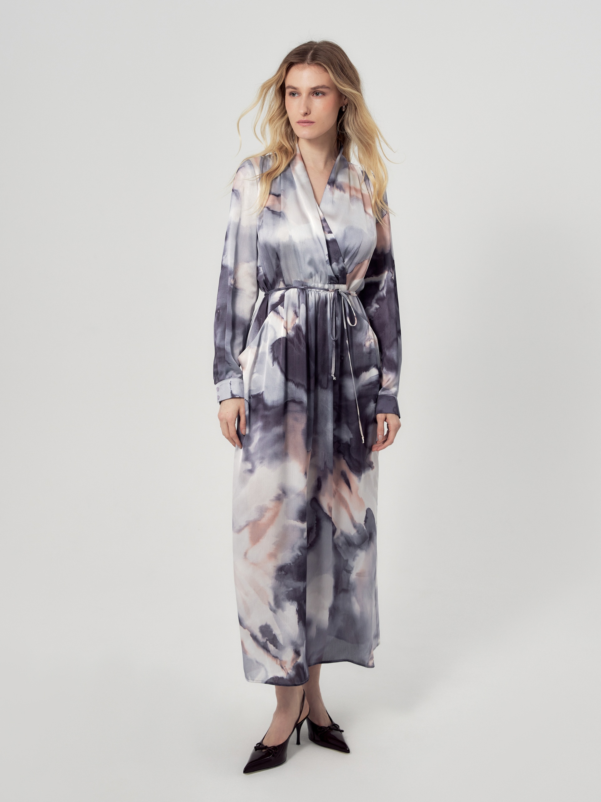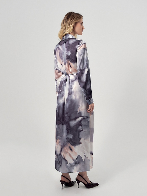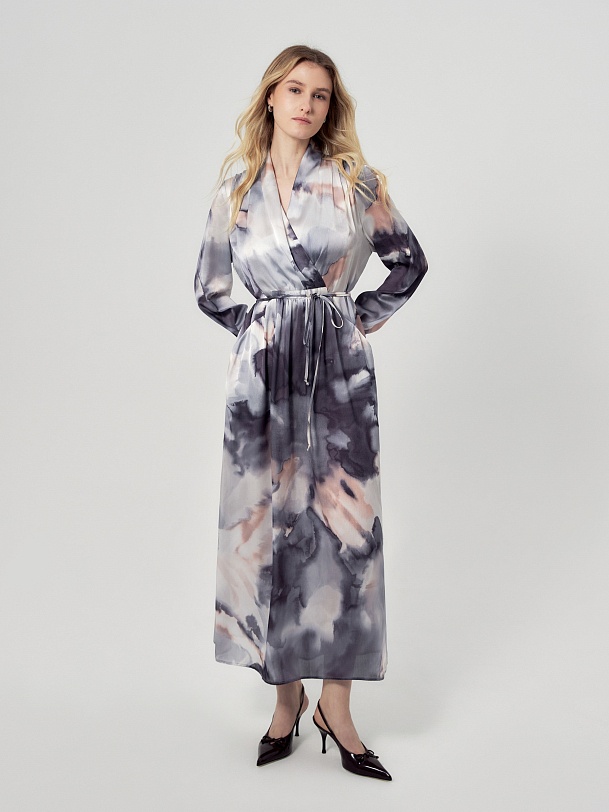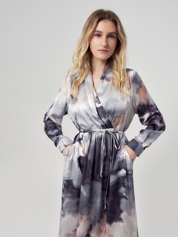 Свободное платье макси из атласной ткани в романтичном принте, по плечам складки, горловина с V-образным вырезом на запах. По переду есть кулиса и тонкая длиная завязка из основной ткани, для придания приталенного силуэта. По переду карманы. Рукав классический на манжете с пуговицей. В комплект входит нижняя юбка из подкладки.
