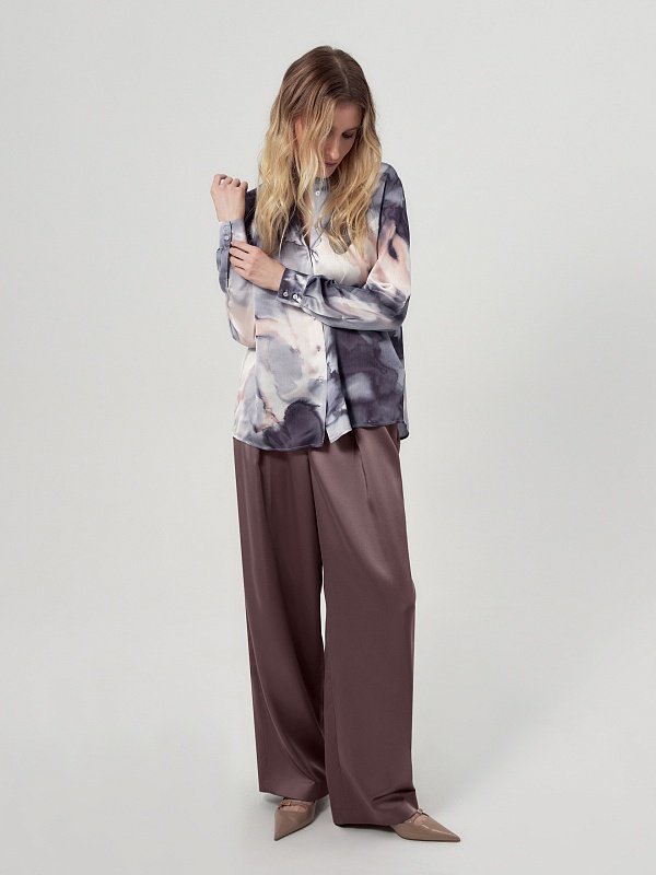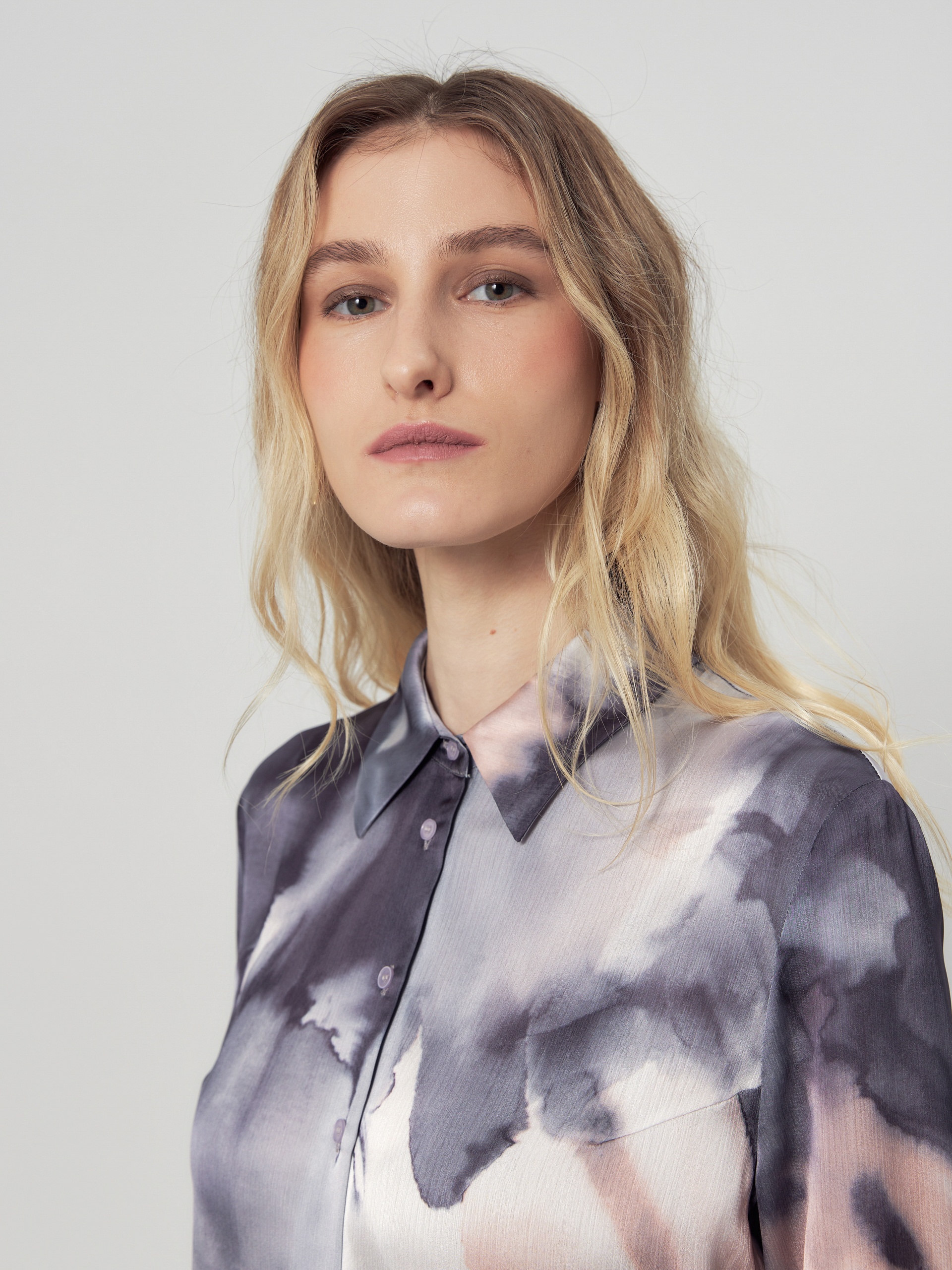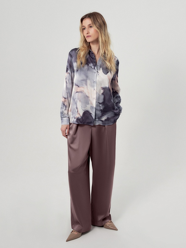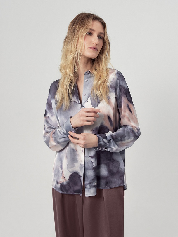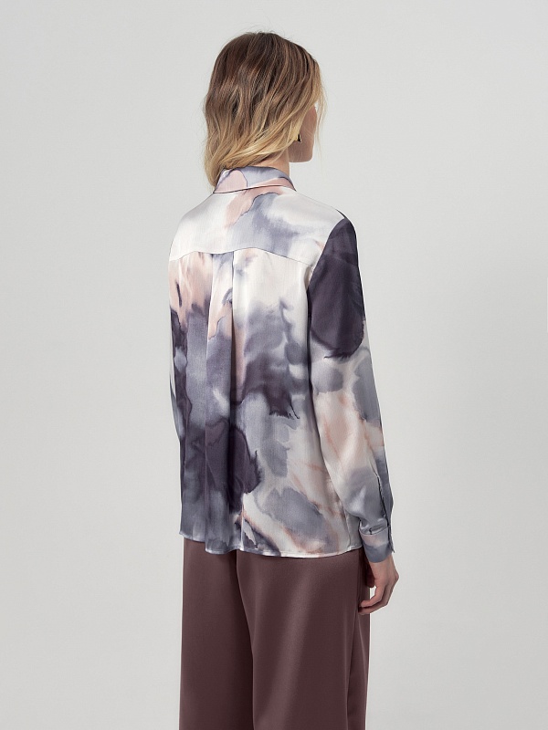 Романтичная прямая блуза с отложным воротником из атласной ткани в романтичном принте. На спинке блузы имеется кокетка.