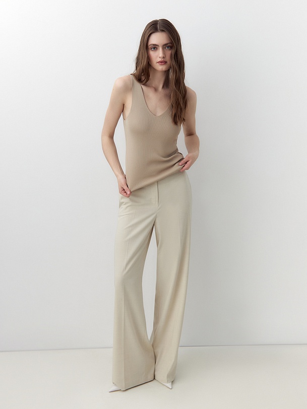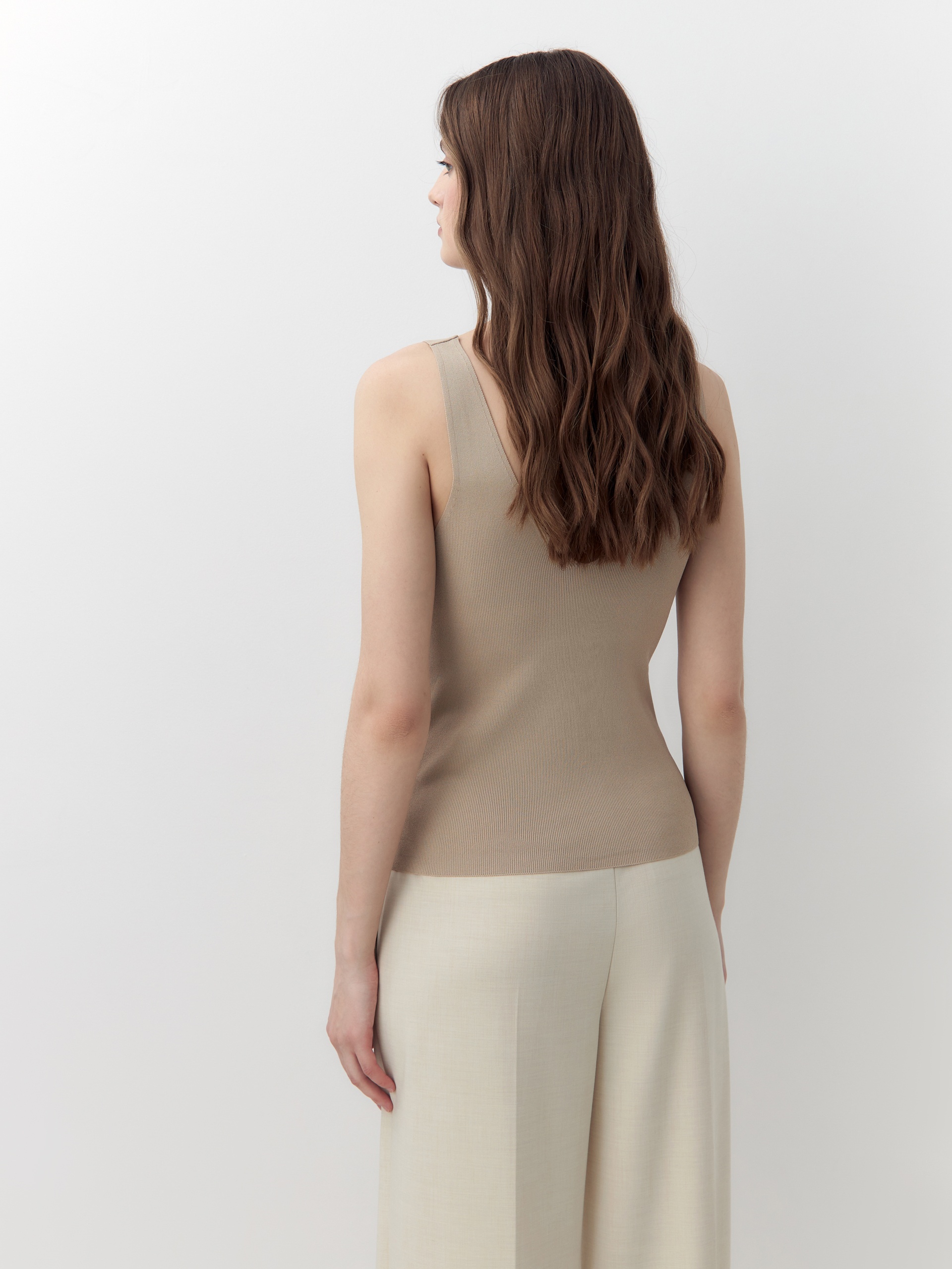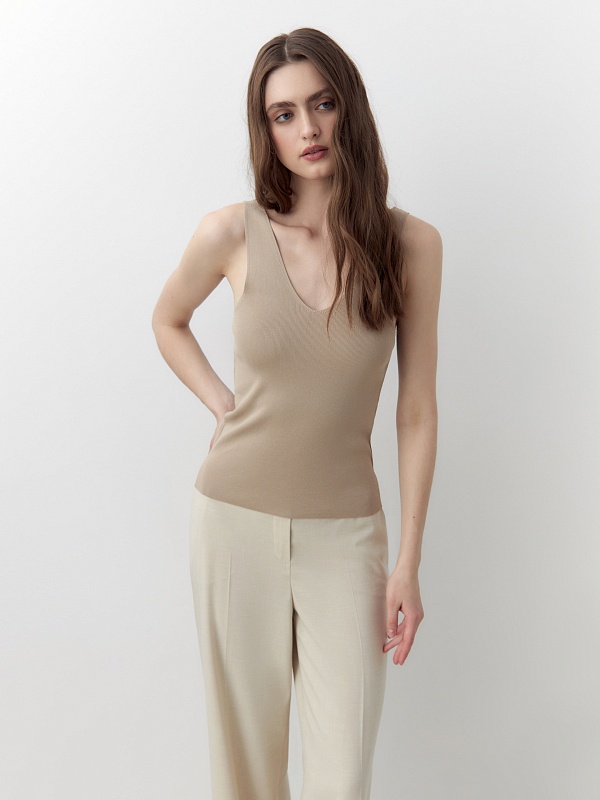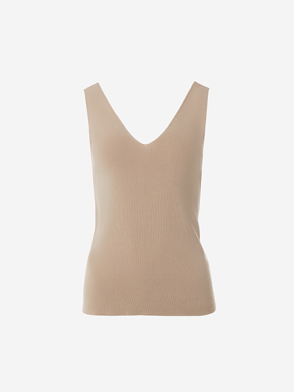 Прилегающий вязаный вискозный топ с V-образным вырезом бежевого цвета. Станет вам отличным повседневным топом под жакеты и кардиганы.