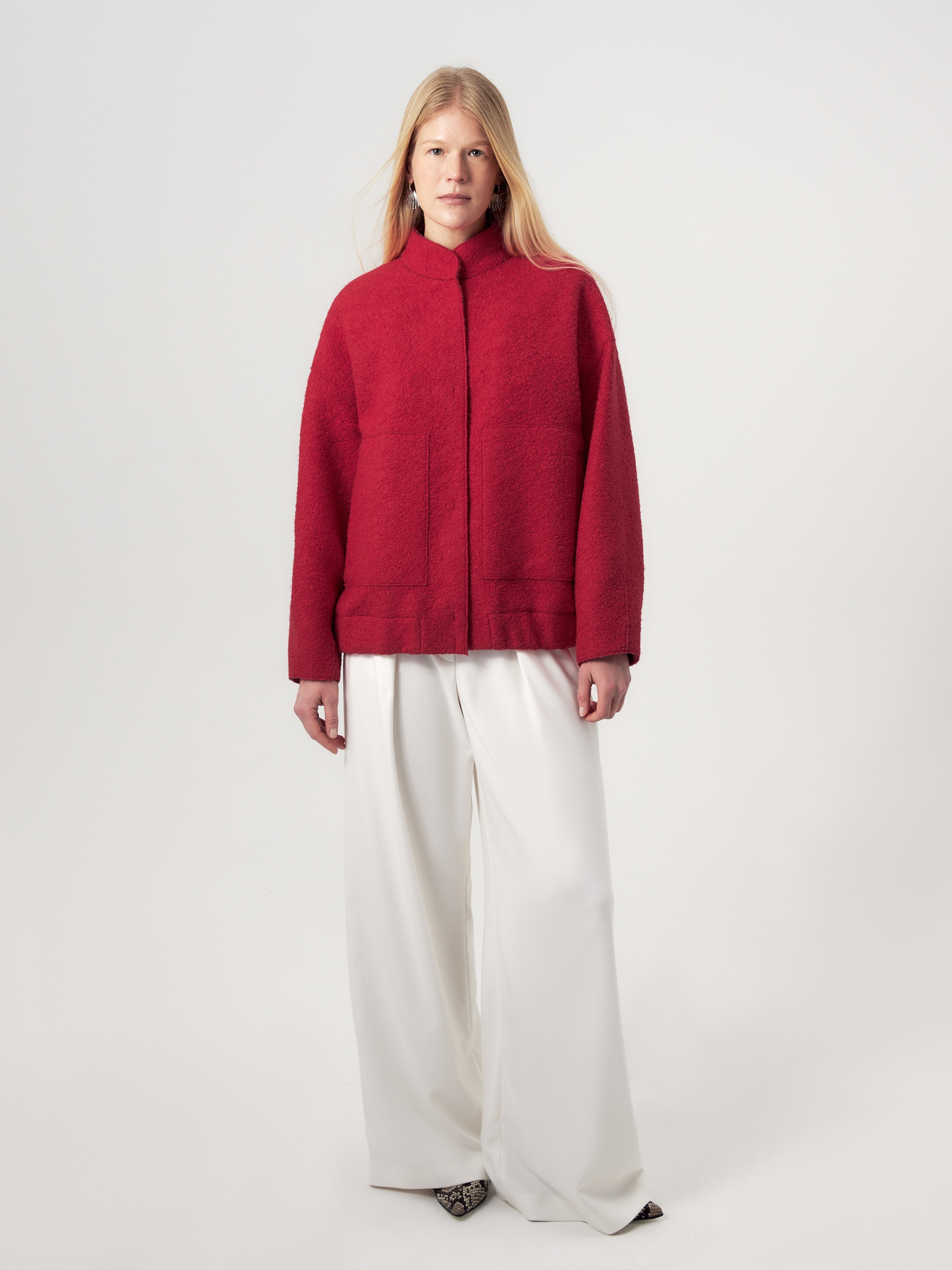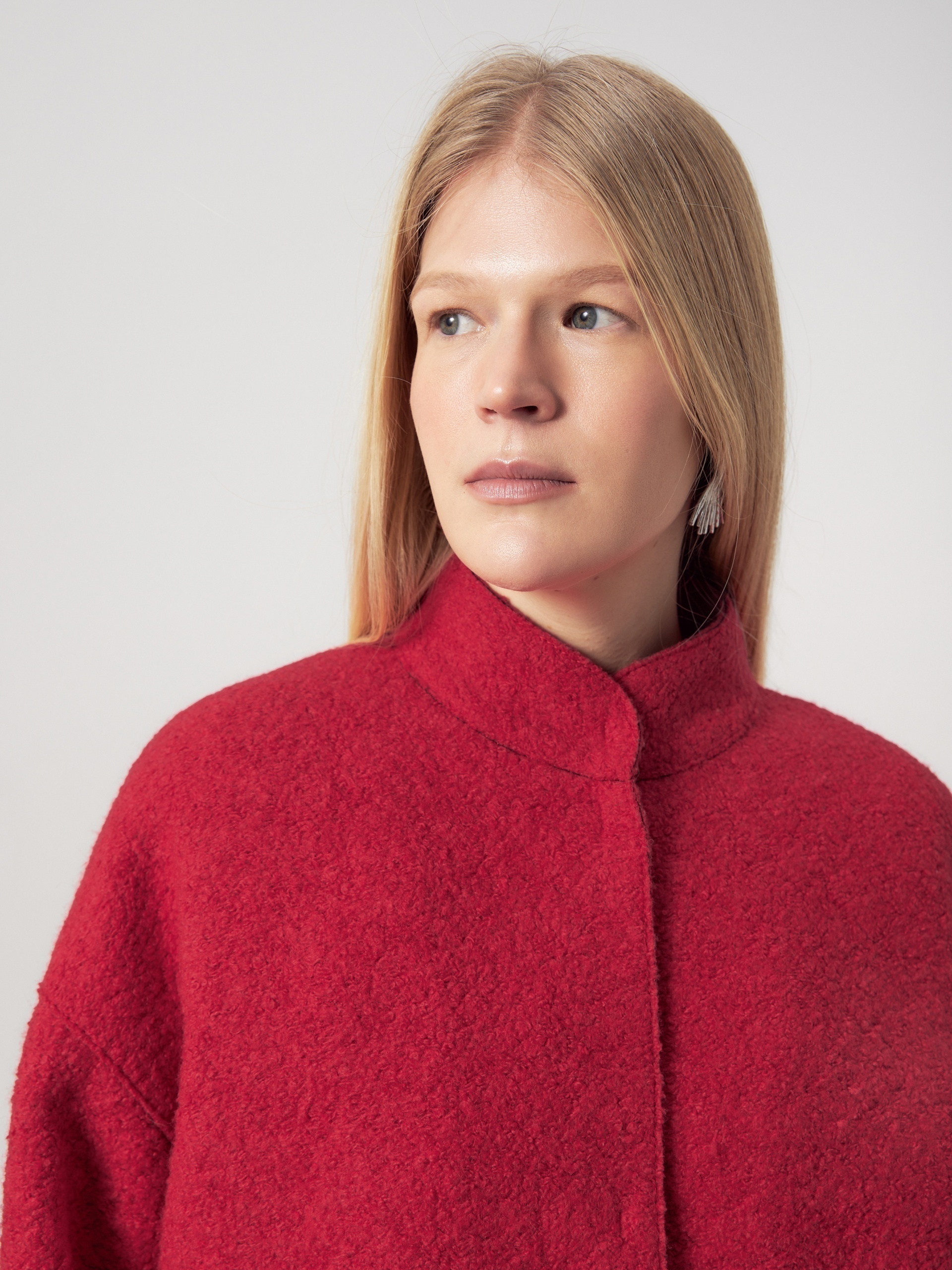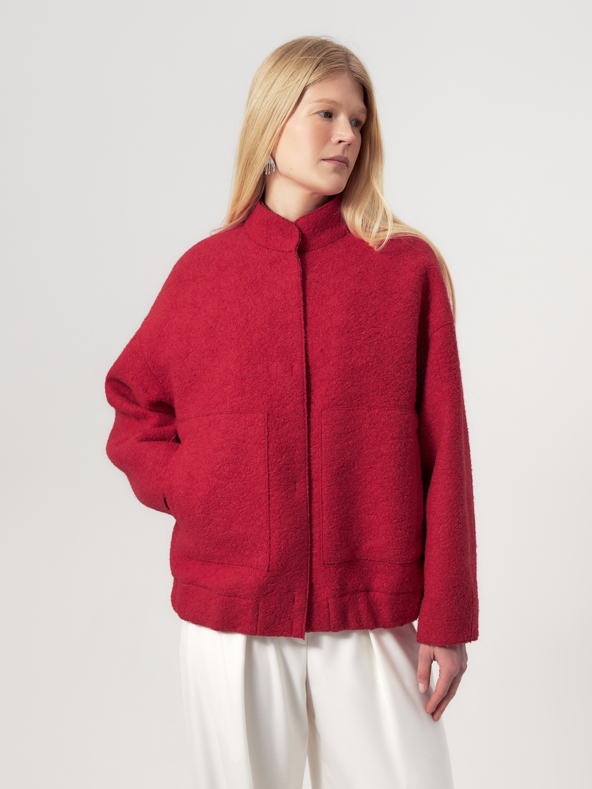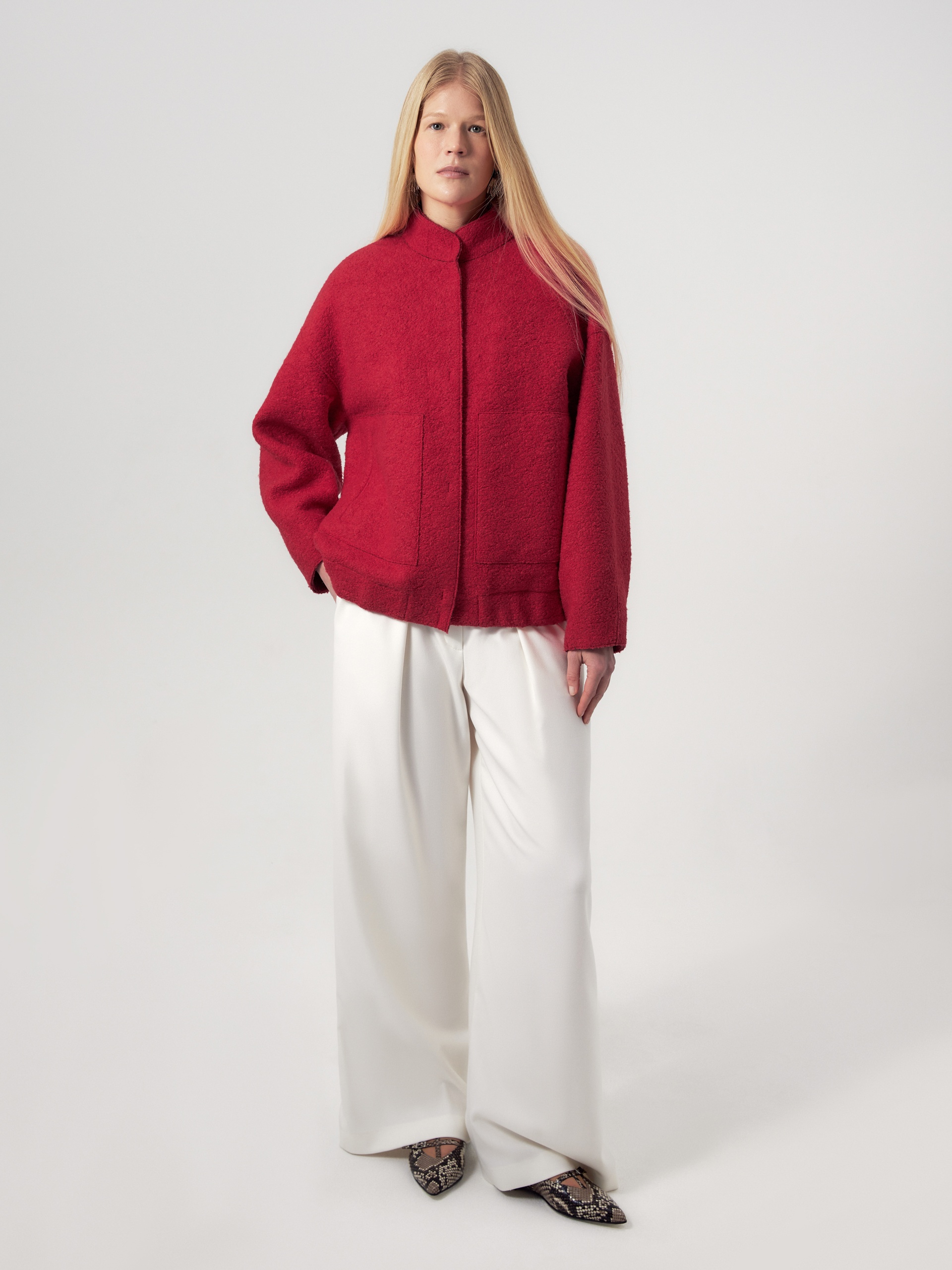 Женский бомбер из варёной шерсти яркого красного цвета длиной до середины бедра. Изделие с центральной застежкой на кнопки, воротником-стойкой, обьемными рукавами, карманами с листочками и манжетой с резинкой по низу изделия. Куртка изготовлена с использованием запатентованных технологий: высокотехнологичная мембрана RaftPro надежно защищает от ветра, холода и перепада температур. Произведено в Санкт-Петербурге.