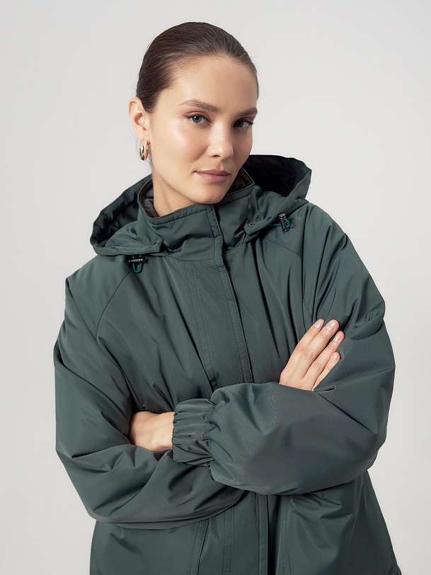 Куртка оверсайз из плотного и дышащего материала создана для динамичной жизни в городе — носите ее со спортивной обувью и джинсами или накиньте летом на легкое платье. Кулиска поможет собрать куртку по низу, а съемный капюшон защитит от ветра. Изделие застегивается на пуговицы, что делает куртку ещё более современной. По спинке кокетка со складками для придания образного силуэта, а по низу рукава элластичный мягкий манжет. Куртка изготовлена из качественной плащевой ткани с водоотталкивающим покрытием и с использованием запатентованных технологий: высокотехнологичная мембрана RaftPro и утеплитель DuPont Sorona надежно защищают от ветра, холода и перепада температур. Произведено в Санкт-Петербурге.