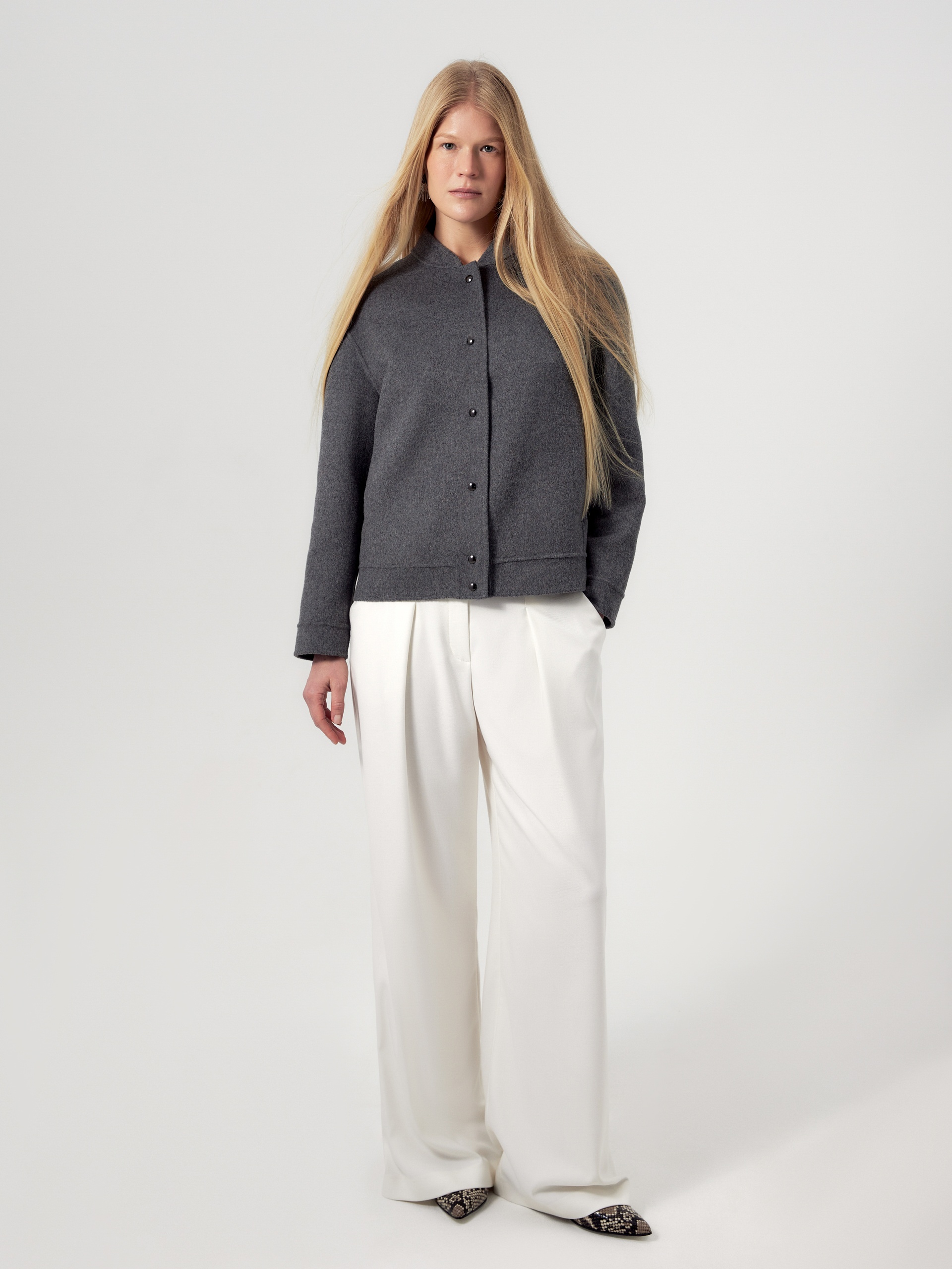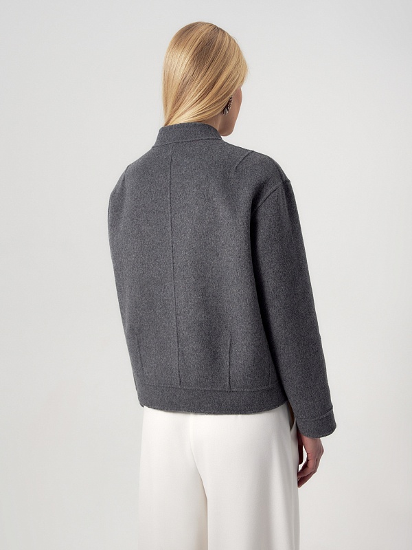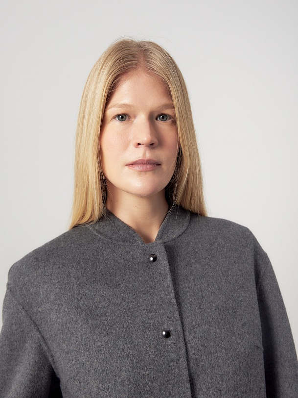 Трендовая укороченная куртка из премиальной шерстяной пальтовой ткани double face с добавлением кашемира. Модель имеет втачной спущенный рукав, воротник-стойку и застежку на кнопки. Благодаря технологии double face куртка получается легкой и теплой, что так необходимо весной.