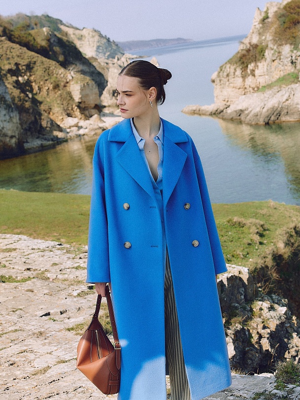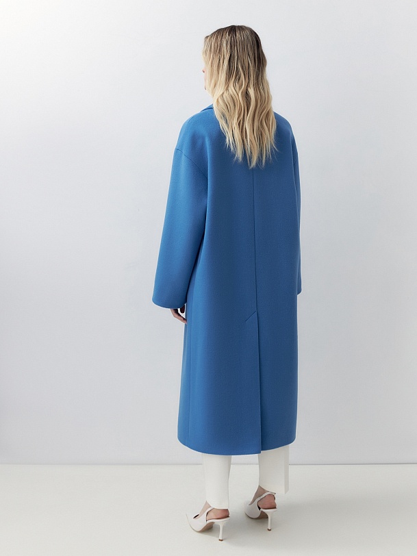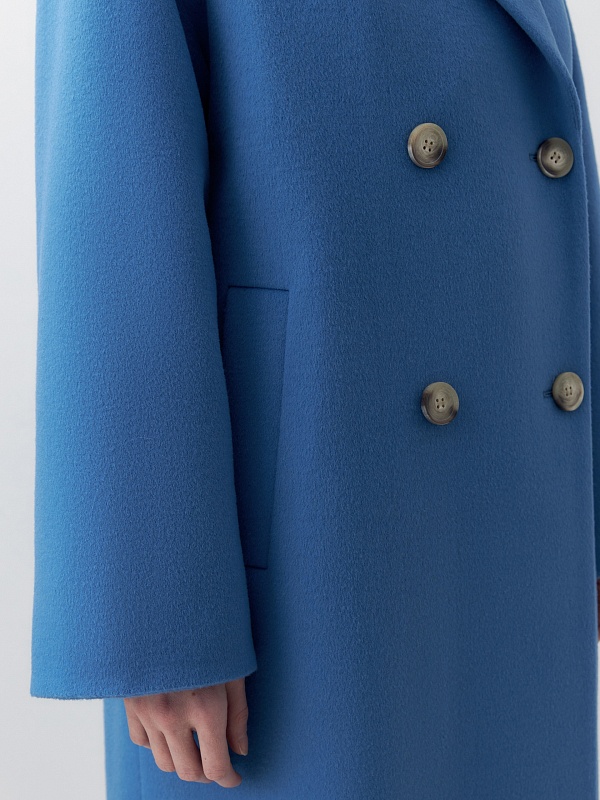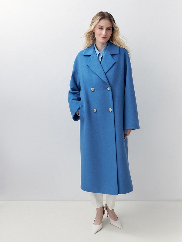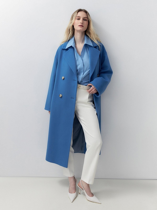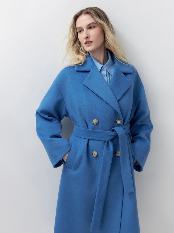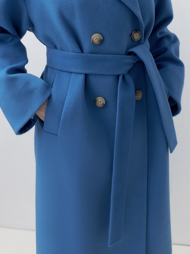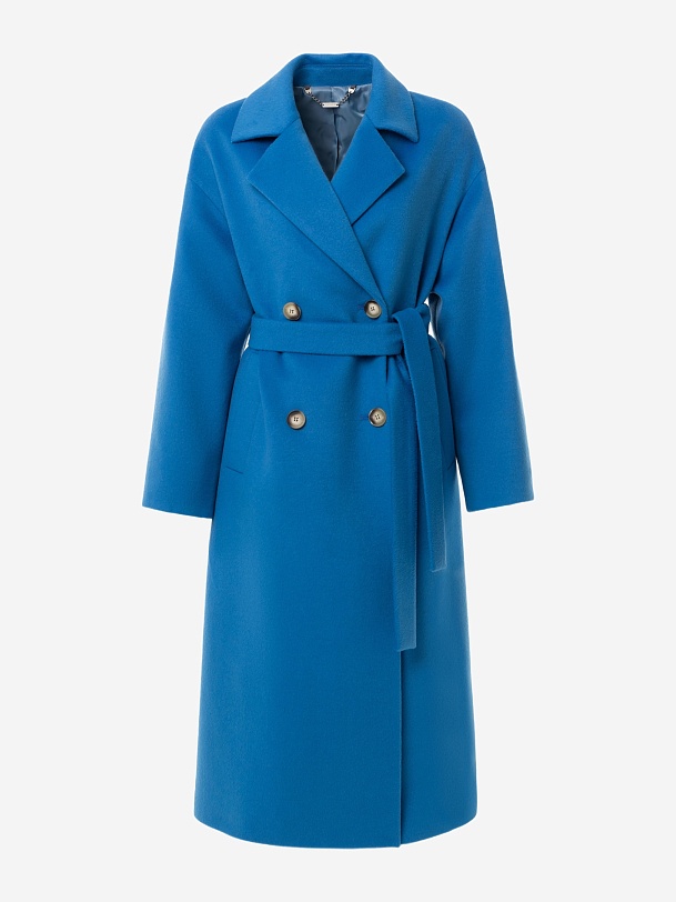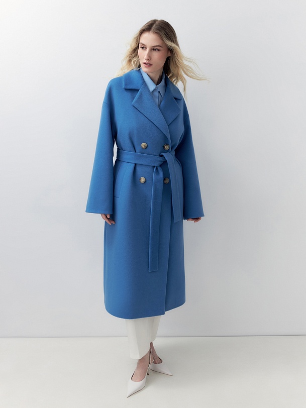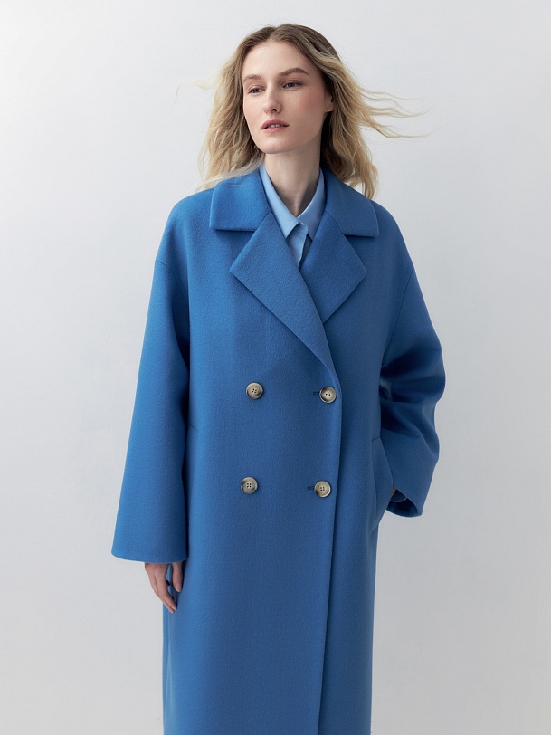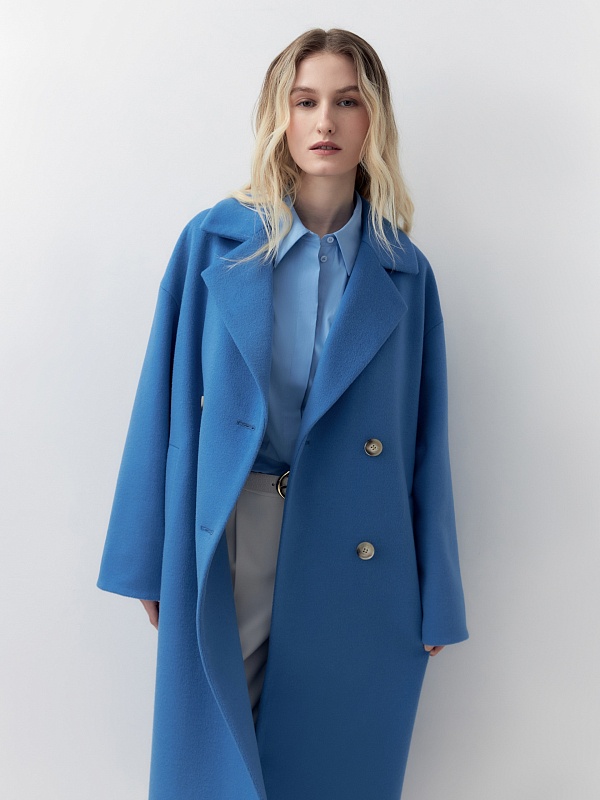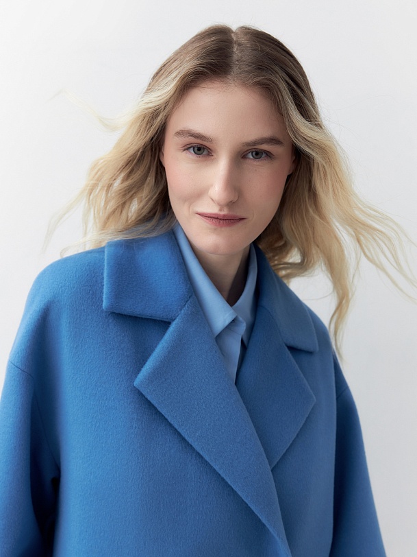 Двубортное пальто прямого силуэта из пальтовой ворсовой ткани в ярком весеннем васильковом цвете. Пальто имеет комфортный рубашечный рукав, классический английский воротник и универсальную длину ниже колена. По бокам располагаются глубокие карманы с листочками. Застегивается изделие на два ряда стильных крупных пуговиц. В качестве дополнительного декоративного элемента к пальто предлагается пояс из основной ткани. Пальто изготовлено с использованием запатентованных технологий: высокотехнологичная мембрана RaftPro надежно защищает от ветра, холода и перепада температур. Произведено в Санкт-Петербурге.