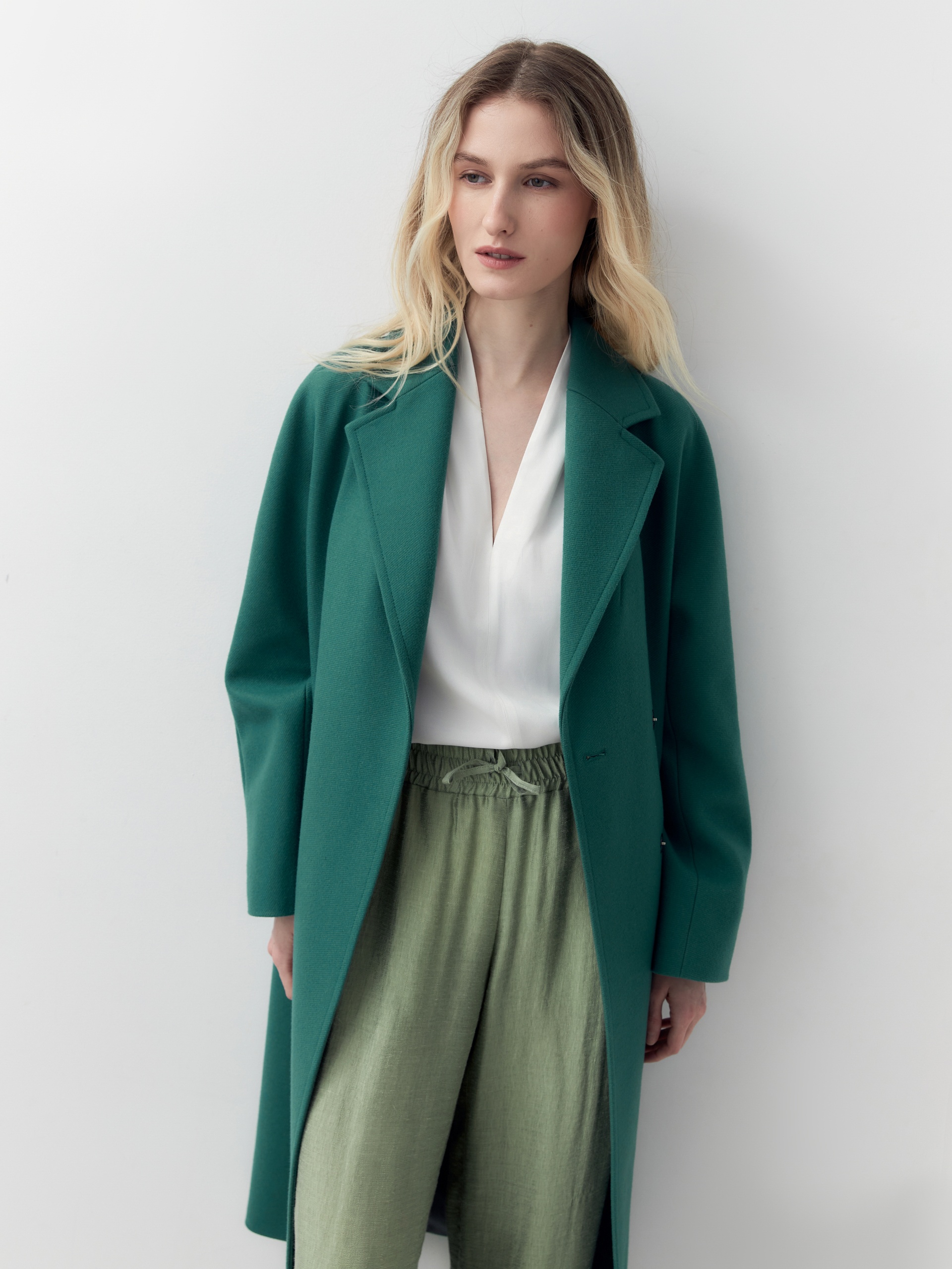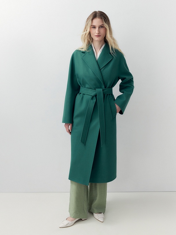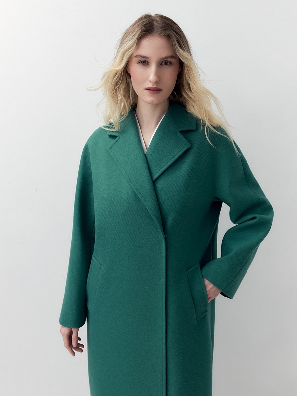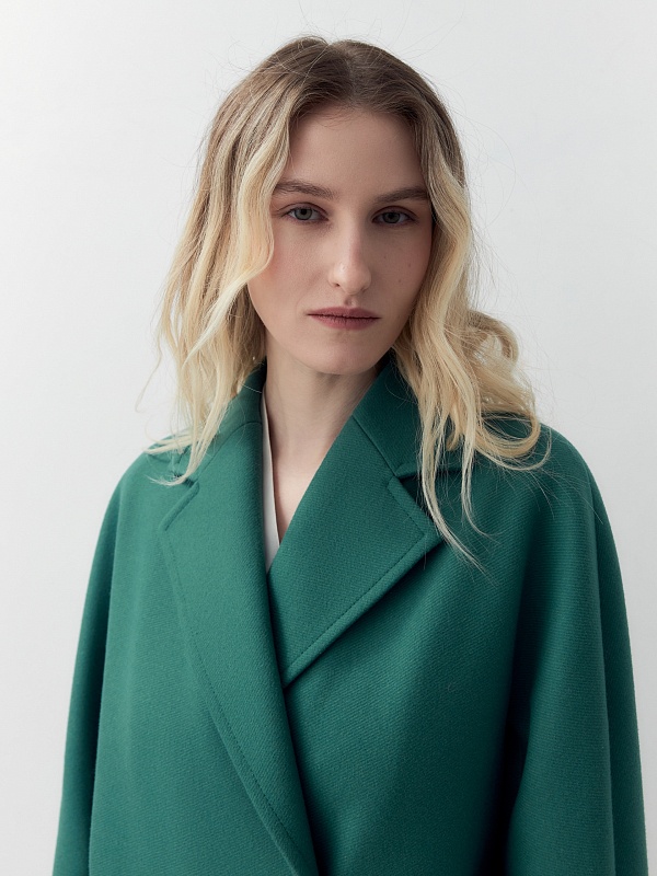 Двубортное пальто силуэта удлиненный кокон - это всем полюбившаяся классика пальто, представленная в новом видении и в современных оттенках. Пальто комфортной длины ниже колена, что расширяет возможности для формирования образов. Уникальный рукав-кимоно спереди и реглан на спинке создает уютный и расслабленный образ и не стесняет движений. Горловину пальто обрамляет классический широкий английский воротник. Пальто имеет два глубоких кармана с листочками. Застегивается на два ряда стильных крупных пуговиц. Дополняет образ съемный пояс, благодаря которому можно подчеркнуть талию. Пальто изготовлено из шерстяной ткани с деликатным диагональным переплетением, бондированную мембраной, которая хорошо держит тепло и форму. Трендовый оттенок "босфорский зелёный" создаёт весеннее настроение. Пальто изготовлено с использованием запатентованных технологий: высокотехнологичная мембрана RaftPro надежно защищает от ветра, холода и перепада температур. Произведено в Санкт-Петербурге.