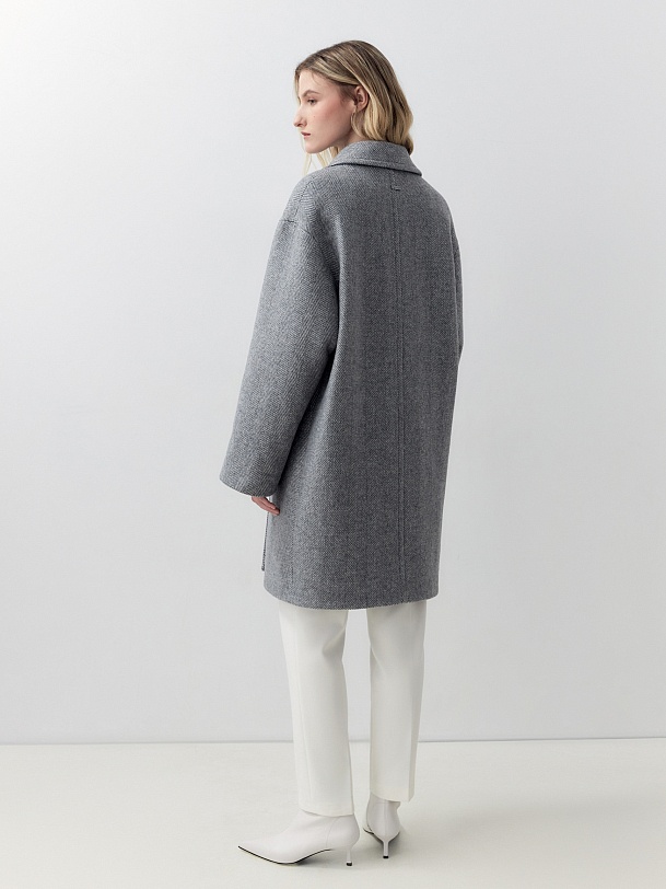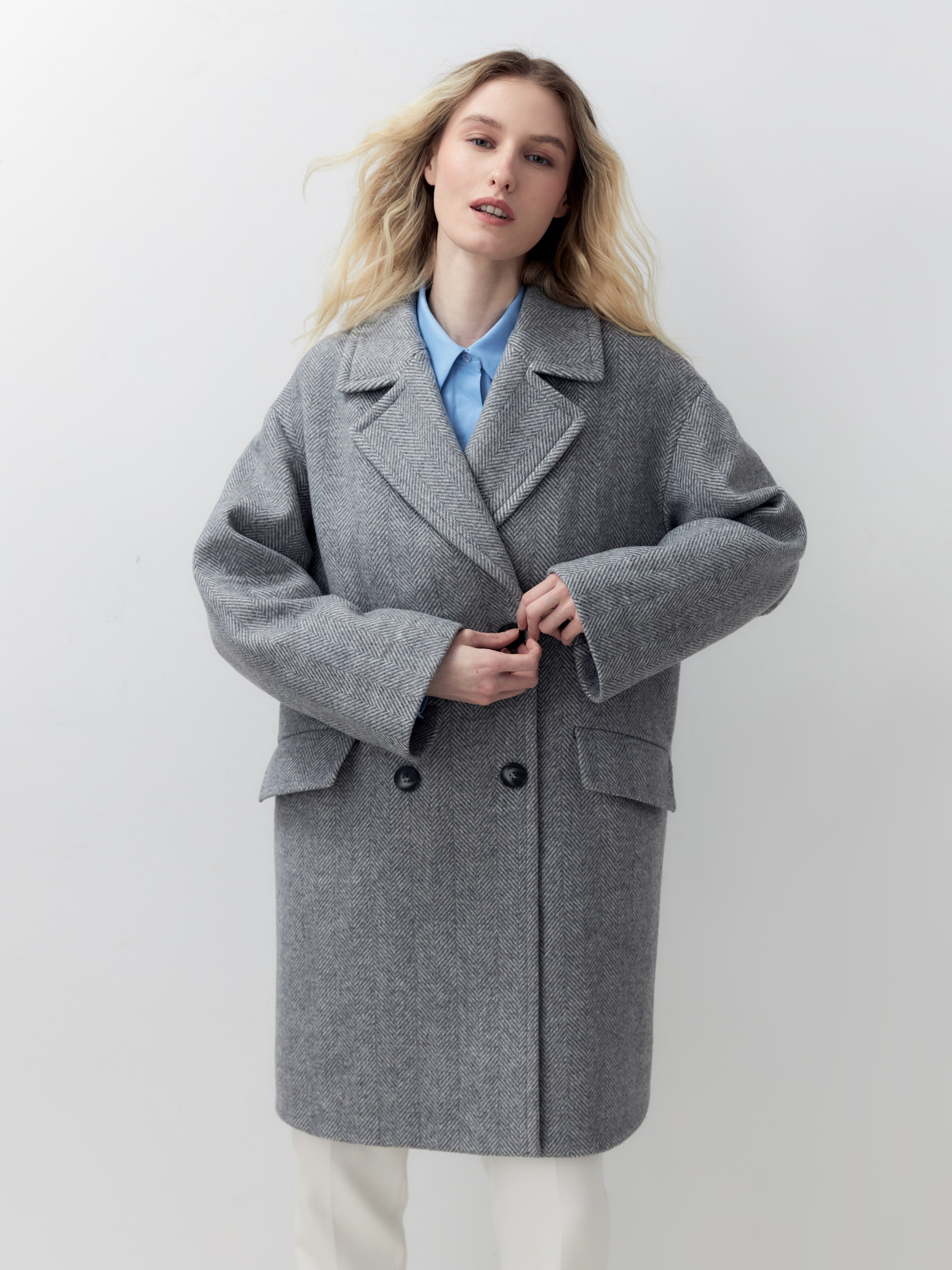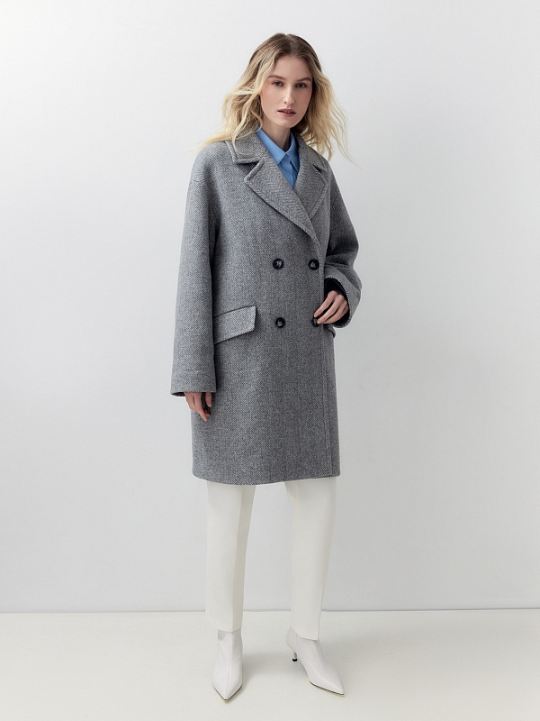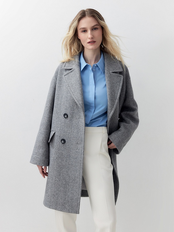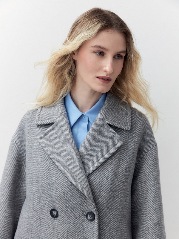 Двубортное пальто лаконичного прямого силуэта с широким английским воротником. Карманы с клапанами и функциональная длина делают это изделие незаменимым элементом повседневного гардероба современной женщины. Для пальто мы выбрали светло-серую шерстяную ткань в трендовой крупной ёлке, которая хорошо держит форму. Застёжка на два ряда крупных стильных пуговиц. Пальто изготовлено с использованием запатентованных технологий: высокотехнологичная мембрана RaftPro надежно защищает от ветра, холода и перепада температур. Произведено в Санкт-Петербурге.
