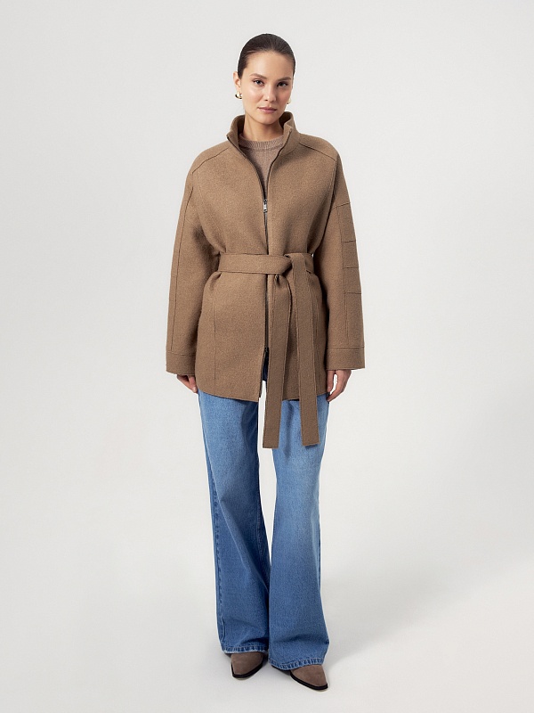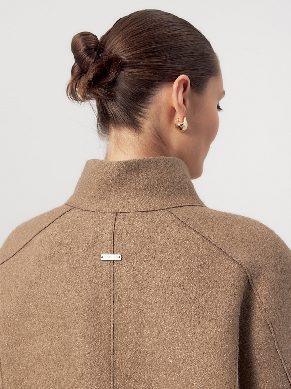 Особенная модель в коллекции - укороченное пальто из варёной шерсти с открытыми срезами. Свободный силуэт, воротник-стойка, молния по центру, конструктивные швы, формирующие силуэт и форму рукава, делают полупальто концептуальным, а светло-каштановый цвет ткани уравновешивает и украшает мягкостью цвета конструктивистскую основу дизайна. В комплекте предлагается пояс из основной ткани. Пальто изготовлено с использованием запатентованных технологий: высокотехнологичная мембрана RaftPro надежно защищает от ветра, холода и перепада температур. Произведено в Санкт-Петербурге.