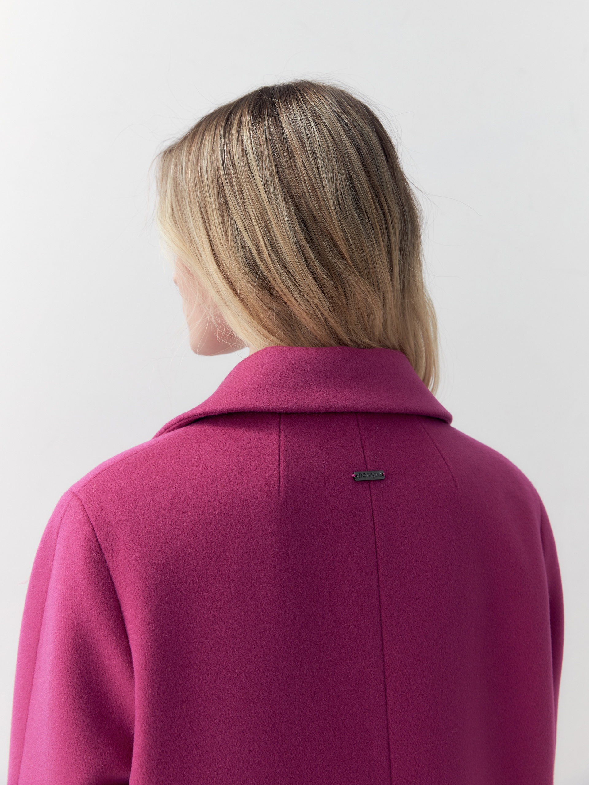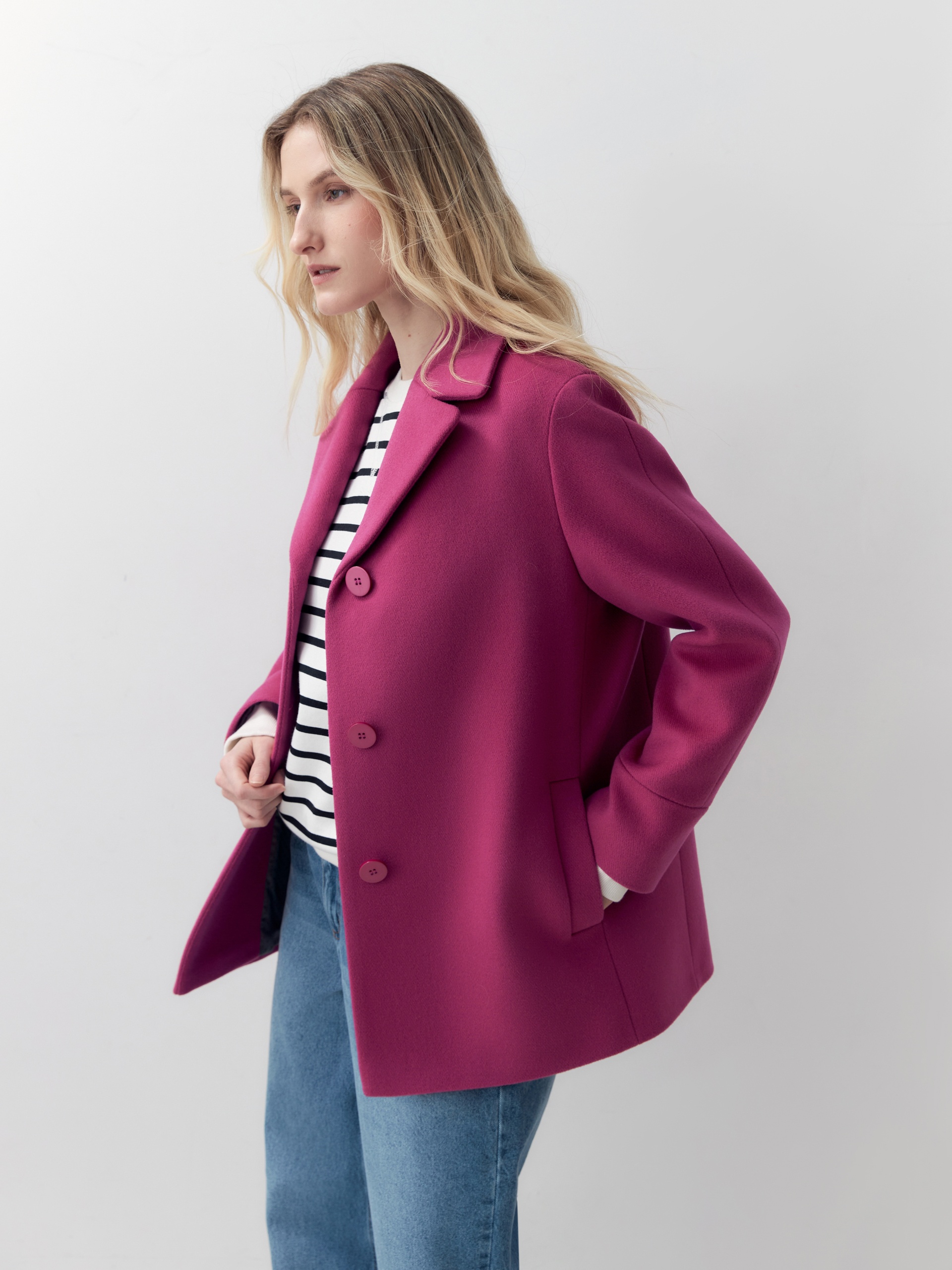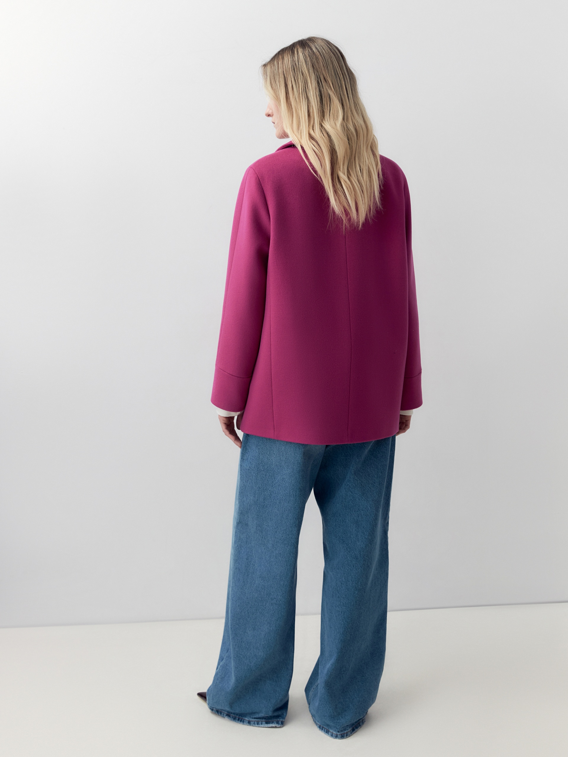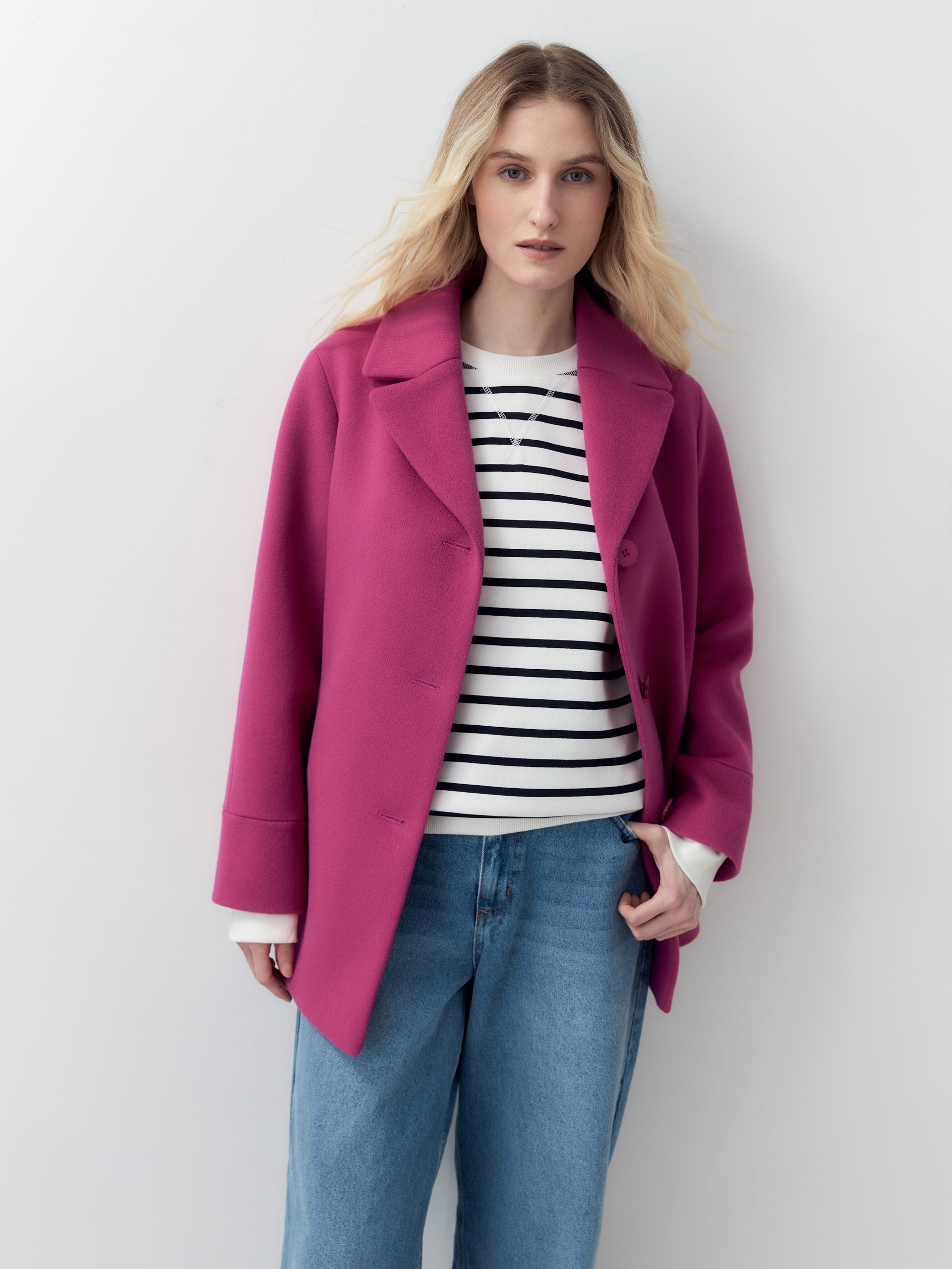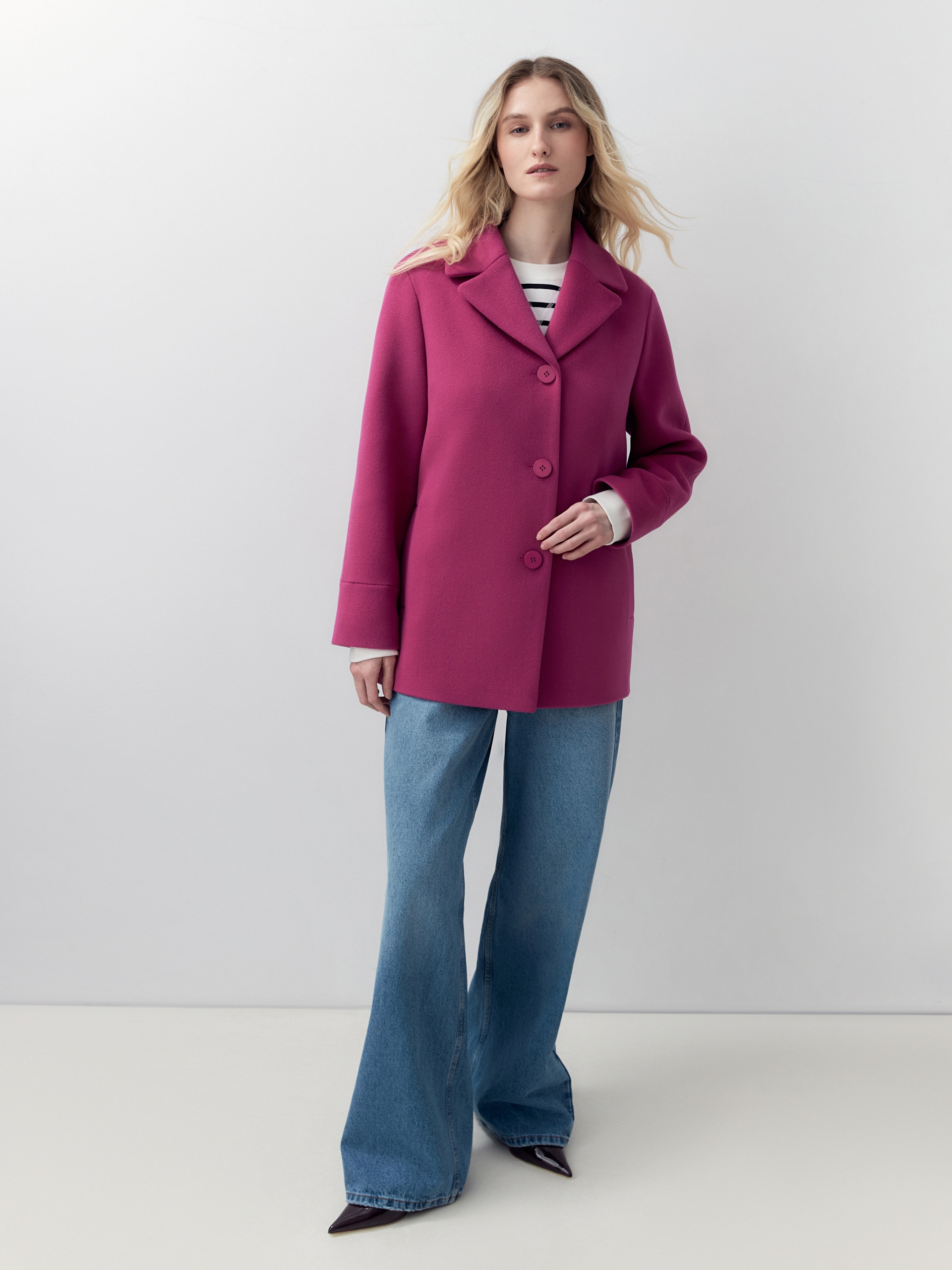 Однобортное полупальто прямого силуэта из ворсовой ткани в ярком весеннем цвете "цветочный розовый". Пальто имеет втачной рукав, низ которого обработан широкой манжетой. Горловину обрамляет аккуратный английский воротник. Спереди и на спинке имеются рельефные швы, в которых располагаются глубокие карманы с листочками. Застегивается изделие на ряд крупных глянцевых пуговиц в тон основной ткани. Изделие на подкладке. Произведено в Санкт-Петербурге.