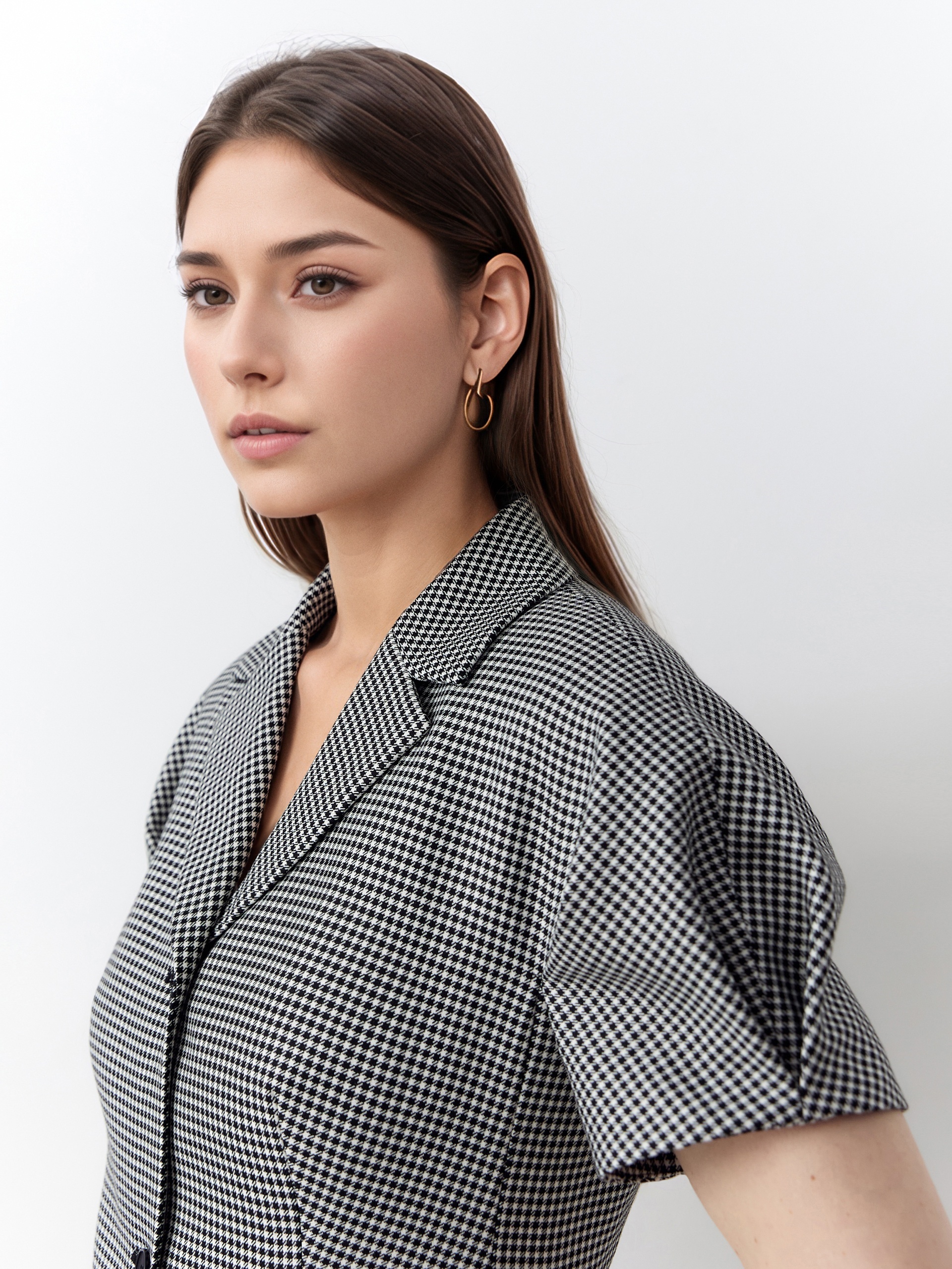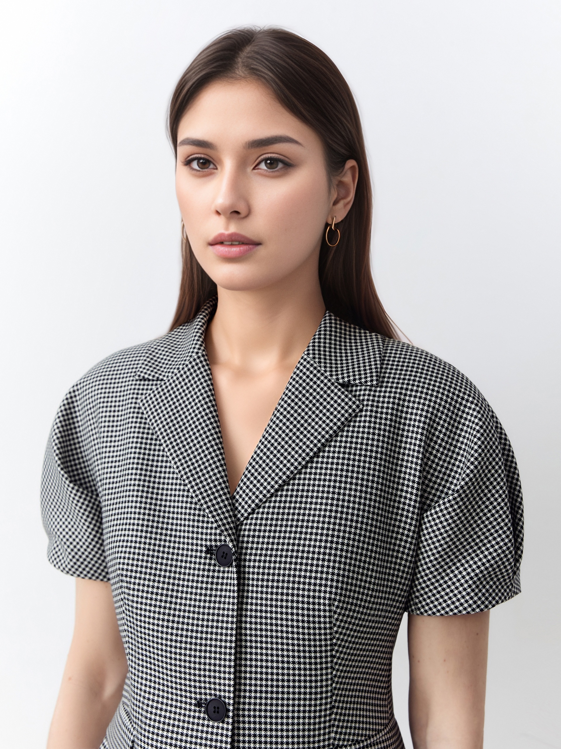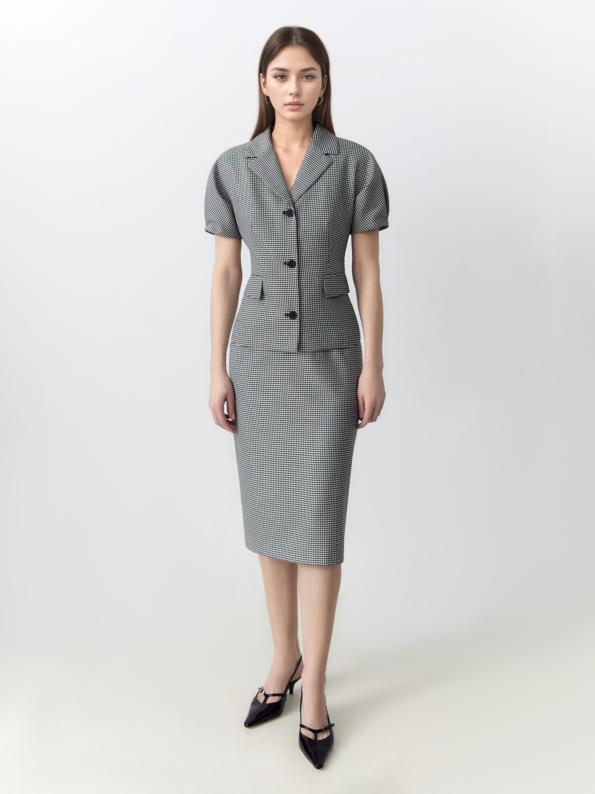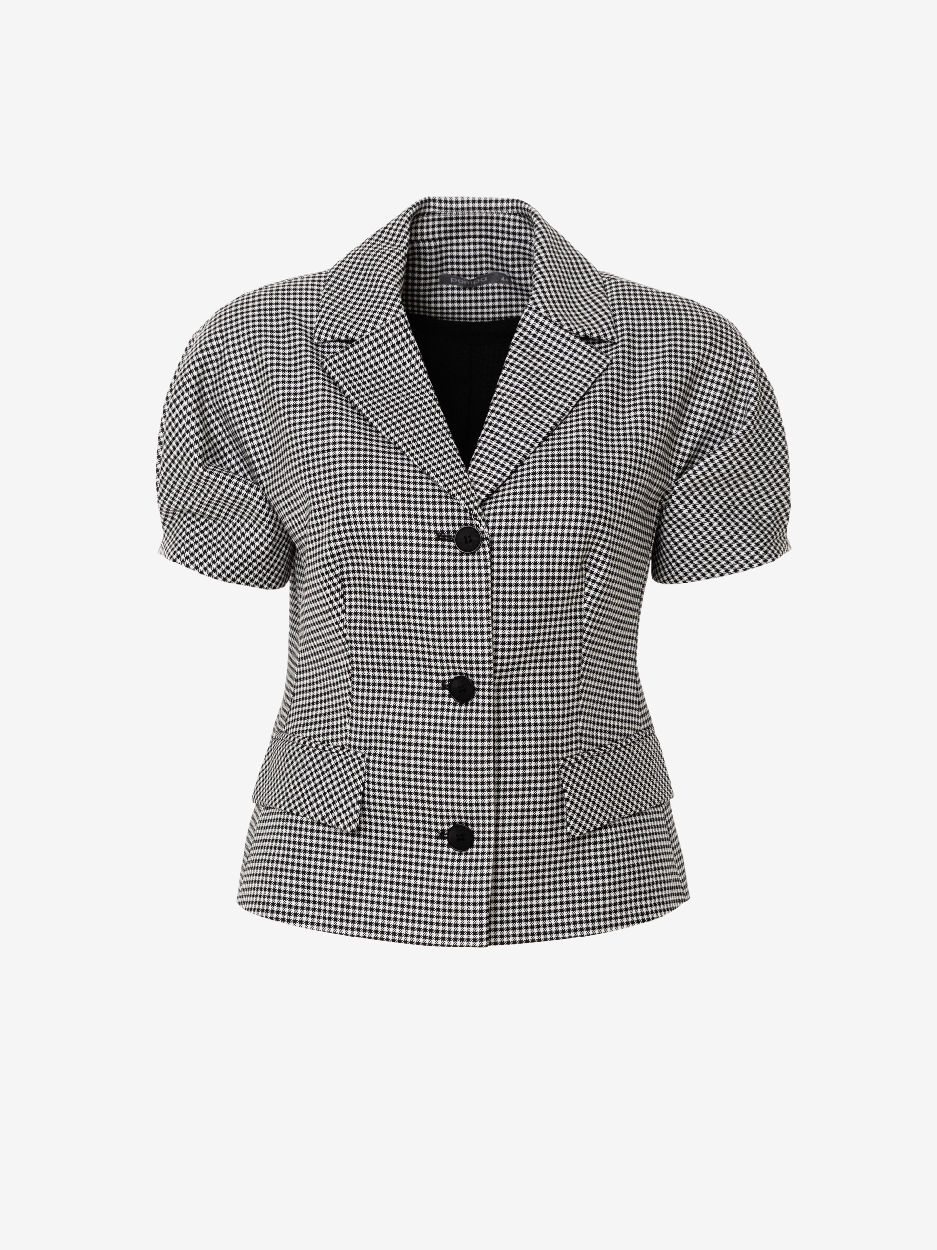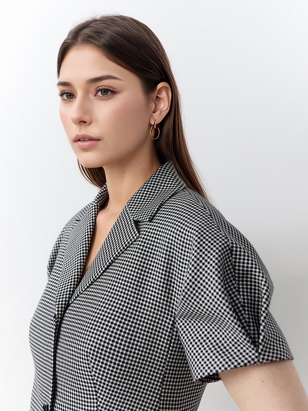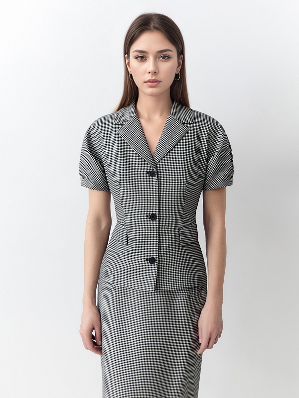 Приталенный жилет с цельнокроеным фантазийным коротким рукавом со складками. Жакет выполнен из костюмной ткани черно-белого цвета с узором Пье-де-пуль. Жилет однобортный на трех пуговицах с английским воротником. На полочке прорезные карманы с клапанами. Составит идеальный комплект и брюками или юбкой из одной ткани.