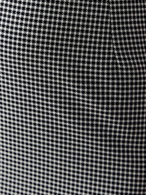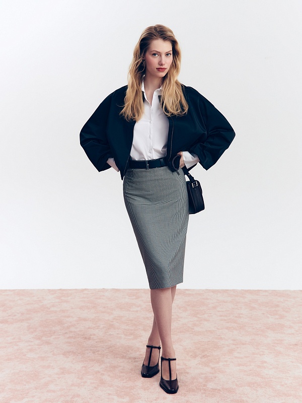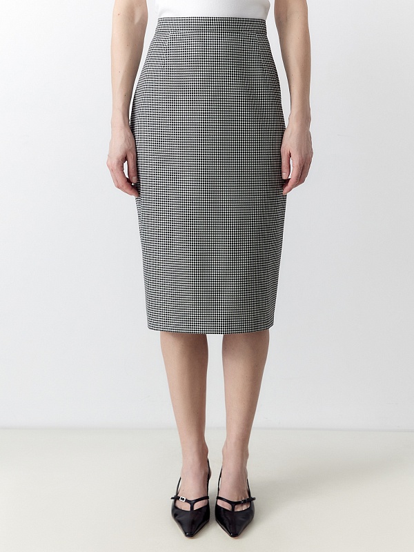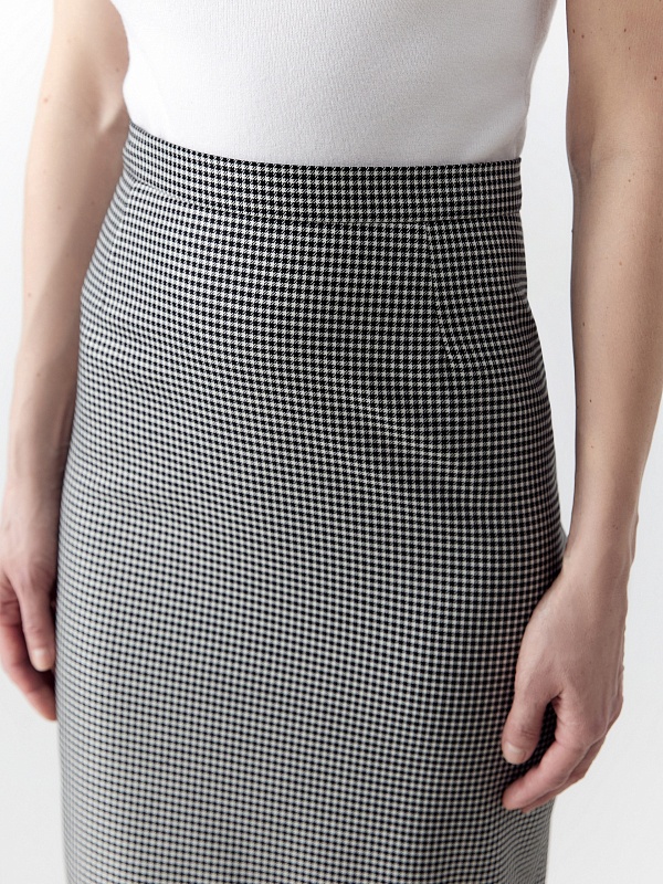 Юбка на притачном поясе полуприлегающего силуэта из костюмной ткани черно-белого цвета с узором Пье-де-пуль, очень элегантной длины, прикрывающей колено. Застежка сзади на потайную молнию.
