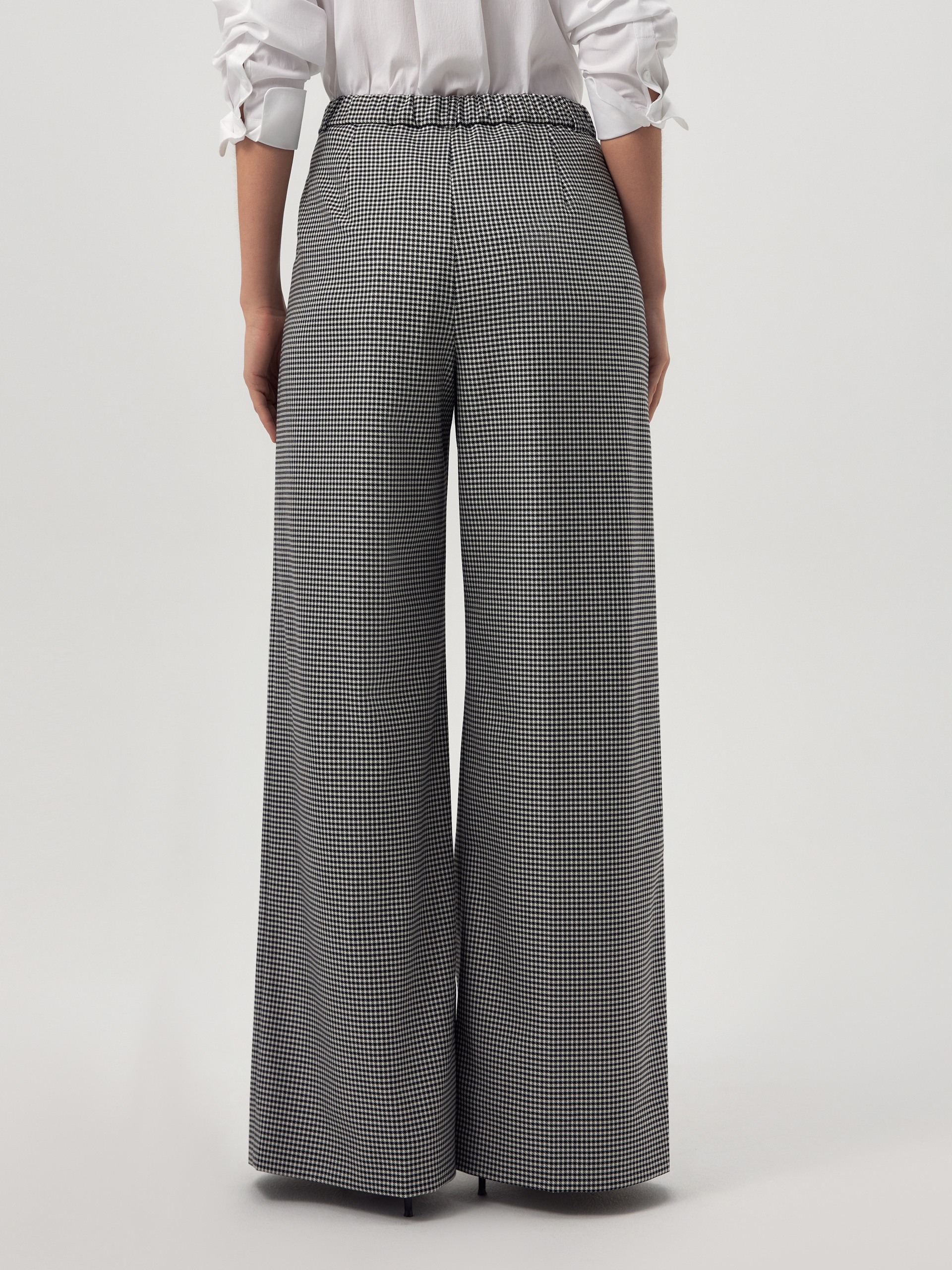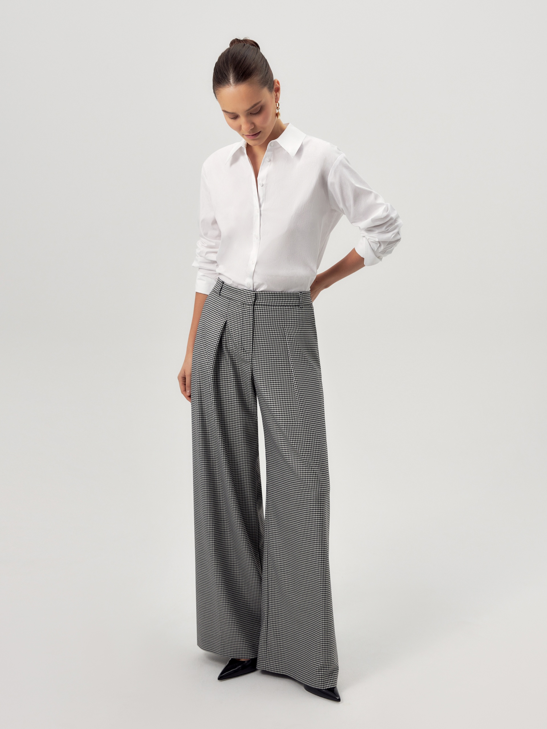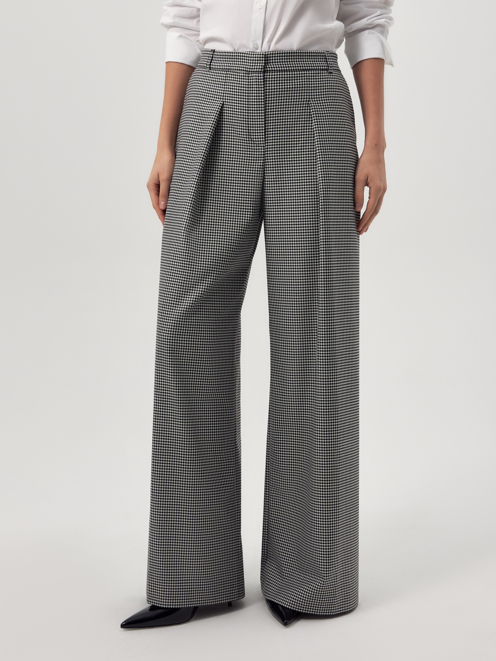 Прямые широкие брюки со складками на высокой посадке с притачным поясом. Брюки выполнены из костюмной ткани с добавлением вискозы в черно-белого цвета с узором Пье-де-пуль. Имеют два функциональных кармана по бокам. Эта модель идеально сочетается с жакетом из этой же ткани.