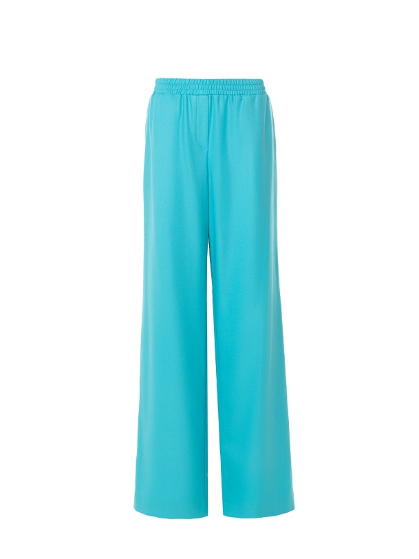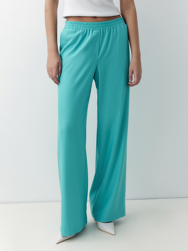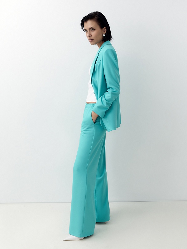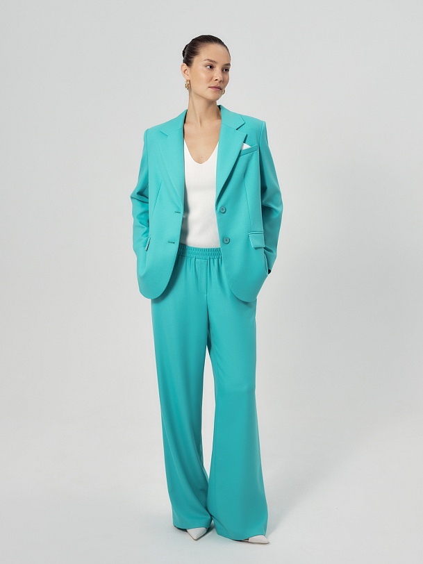 Свободные прямые брюки из костюмной вискозной ткани бирюзово-голубого цвета. Пояс на резинке позволяет чувствовать себя комфортно и расслабленно. Брюки имеют два функциональных кармана по бокам и два прорезных кармана сзади. Брюки в комплекте с жакетом из этой же ткани идеально сочетаются между собой и помогут создать модный аутфит.