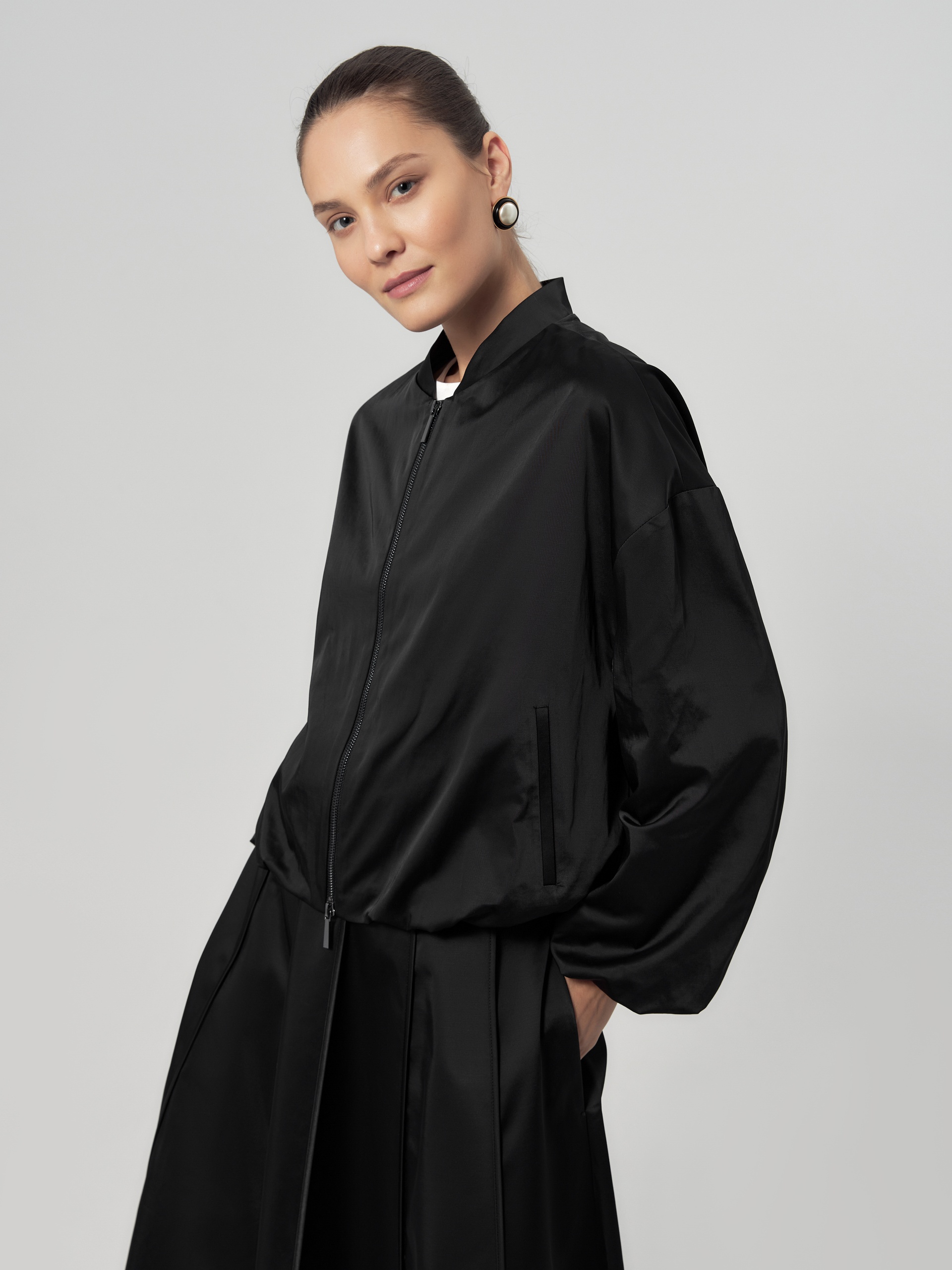 Объемный жакет из костюмной ткани с матовым блеском в черном цвете. Воротник стойка из основной ткани, рукав со спущенным плечом и буфом по низу рукава и полочки.