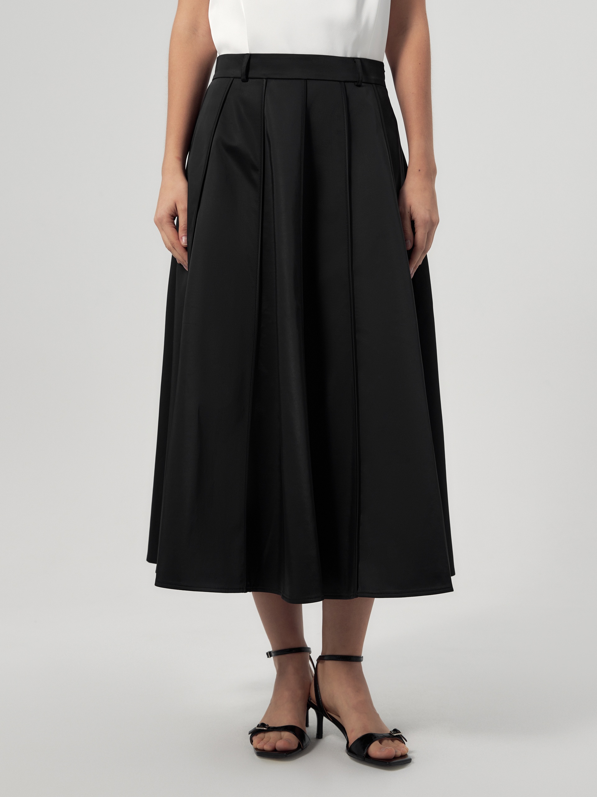 Юбка трапеция из клиньев выполнена из костюмной ткани с матовым блеском в черном цвете, на прямом поясе и потайной молнией в боковом шве.