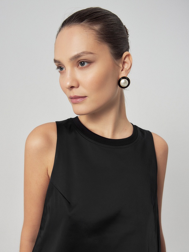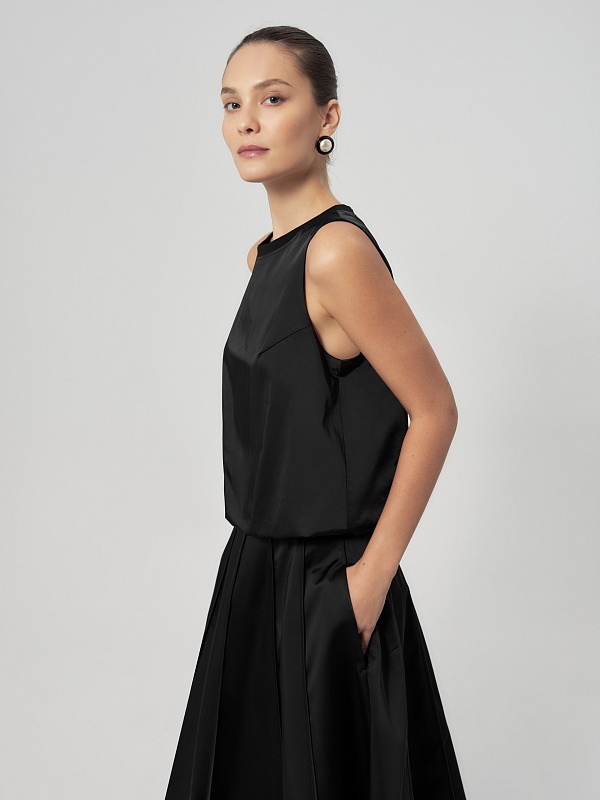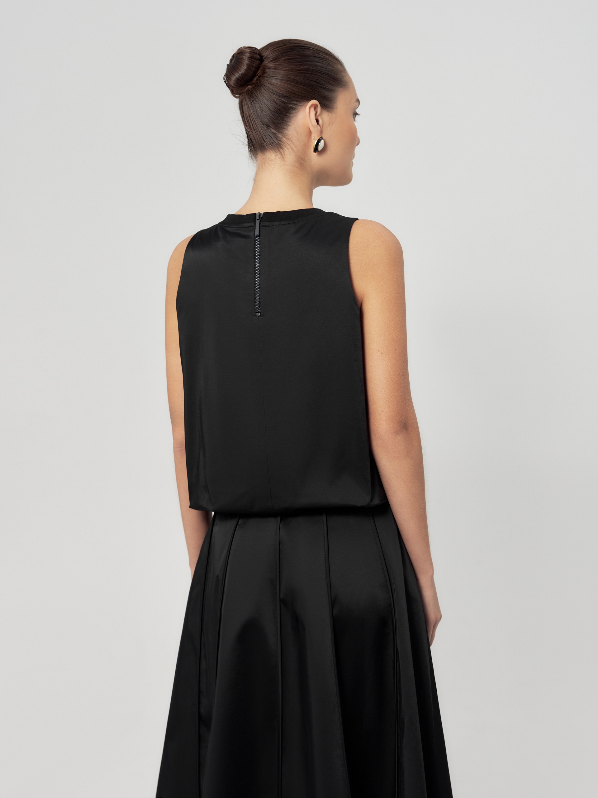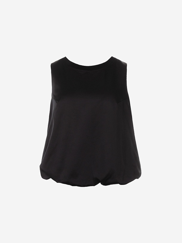 Блуза из костюмной ткани с матовым блеском. Блуза с круглой горловиной и тракторной молнией на спинке. По низу блуза собрана на подкладку, что создает модный эффект "баллона".