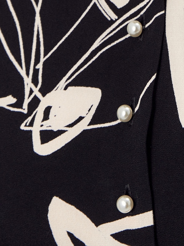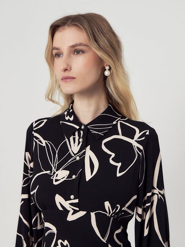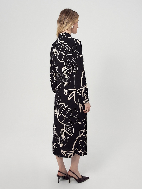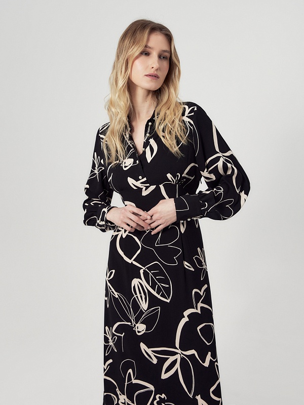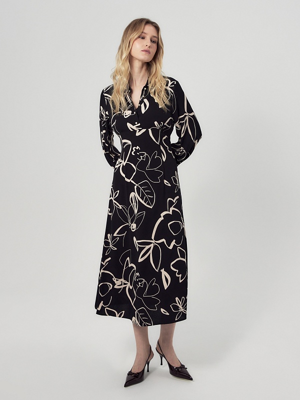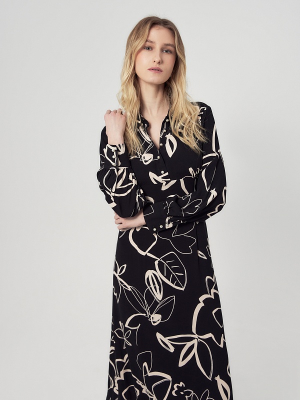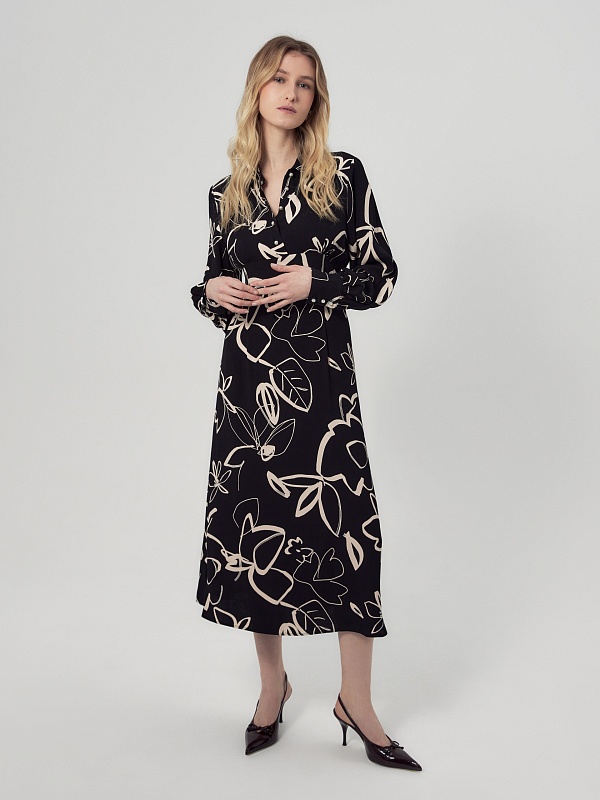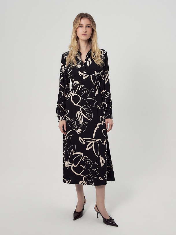 Приталенное платье из плательной вискозной ткани с принтом, классический отложной воротник и планка с пуговицами. Лиф платья отрезной выше линии талии со сборкой на груди. Юбка немного расклешена к низу, платье длинной миди. Рукав втачной на манжете со сборкой.