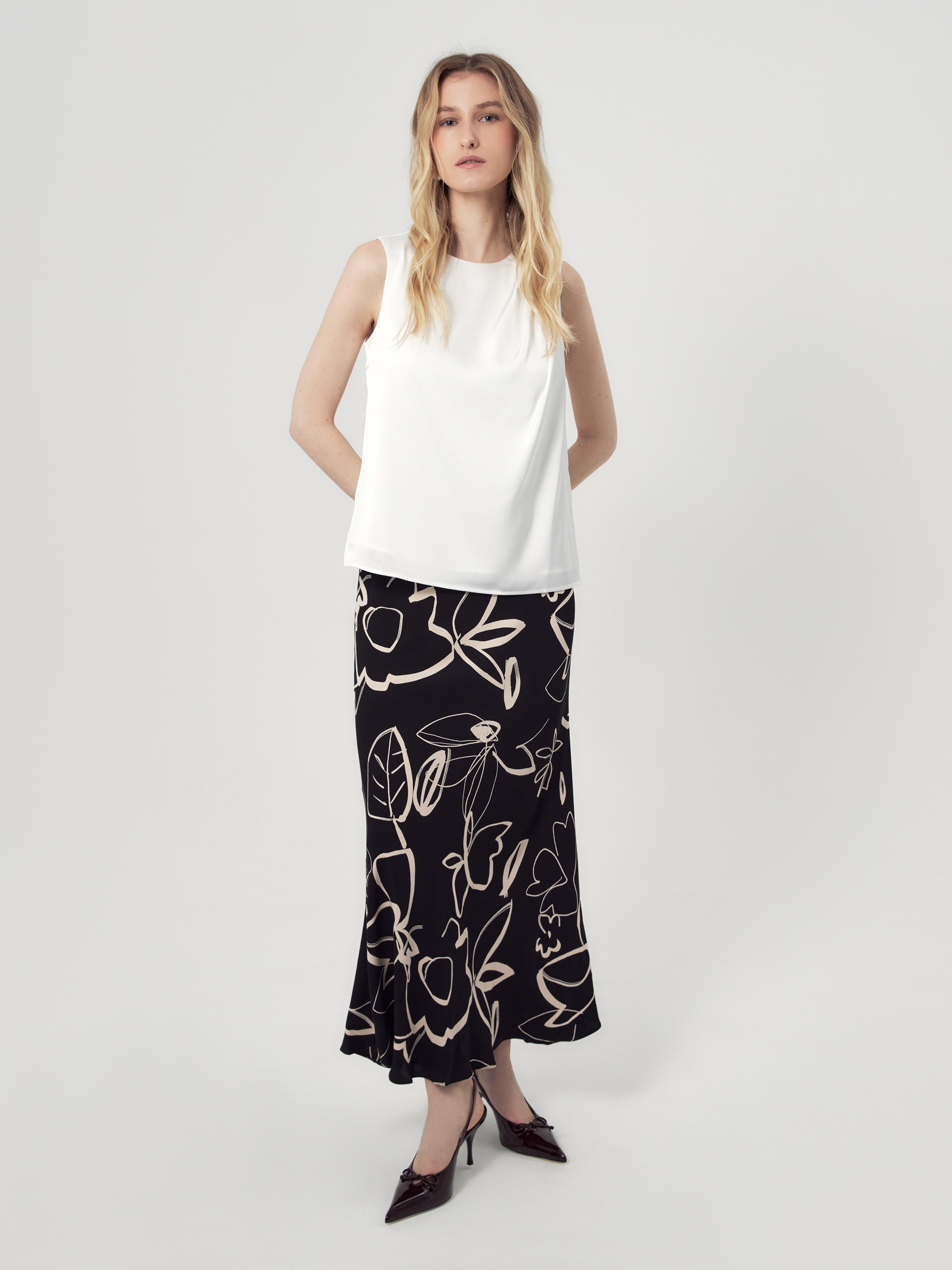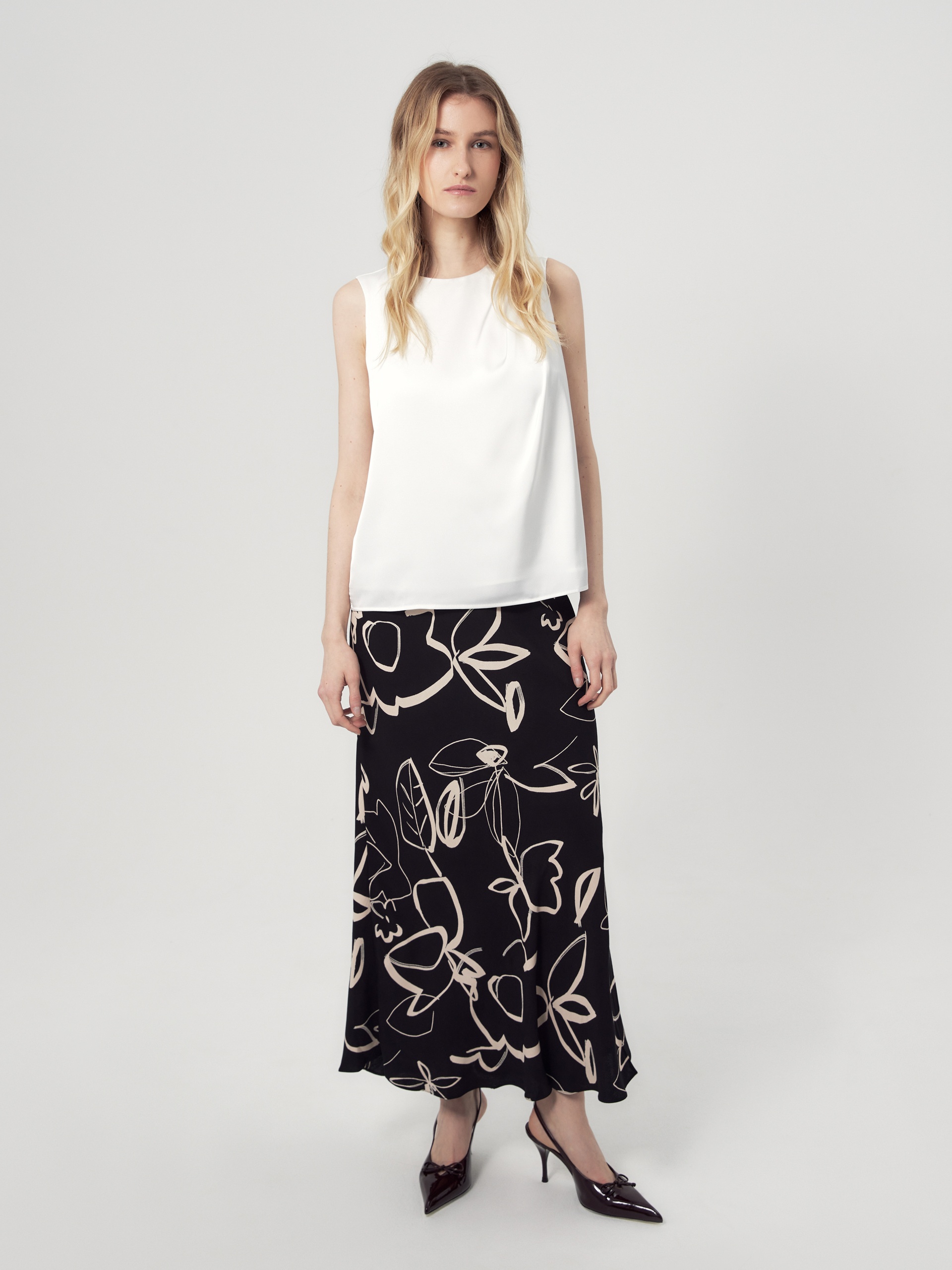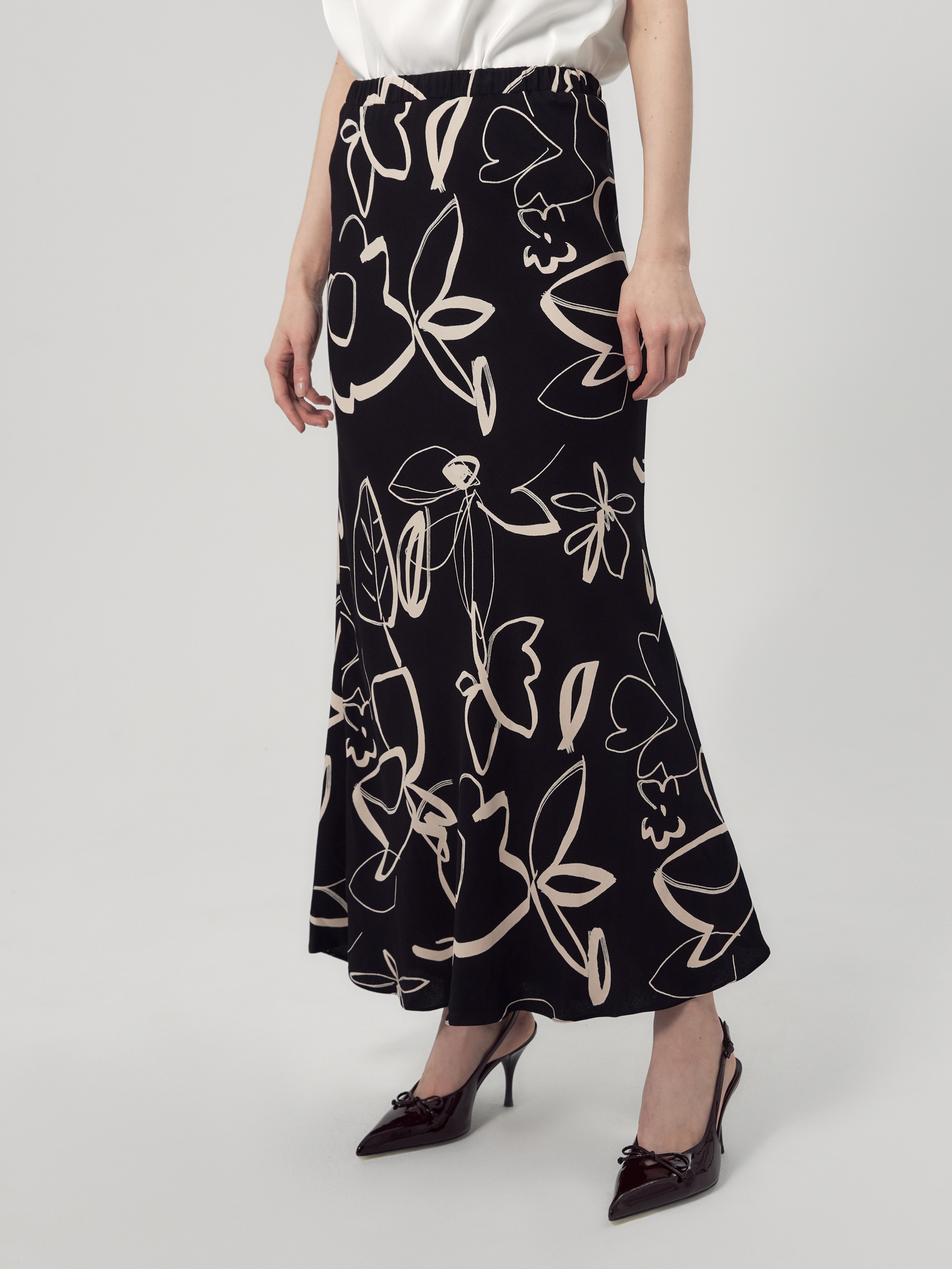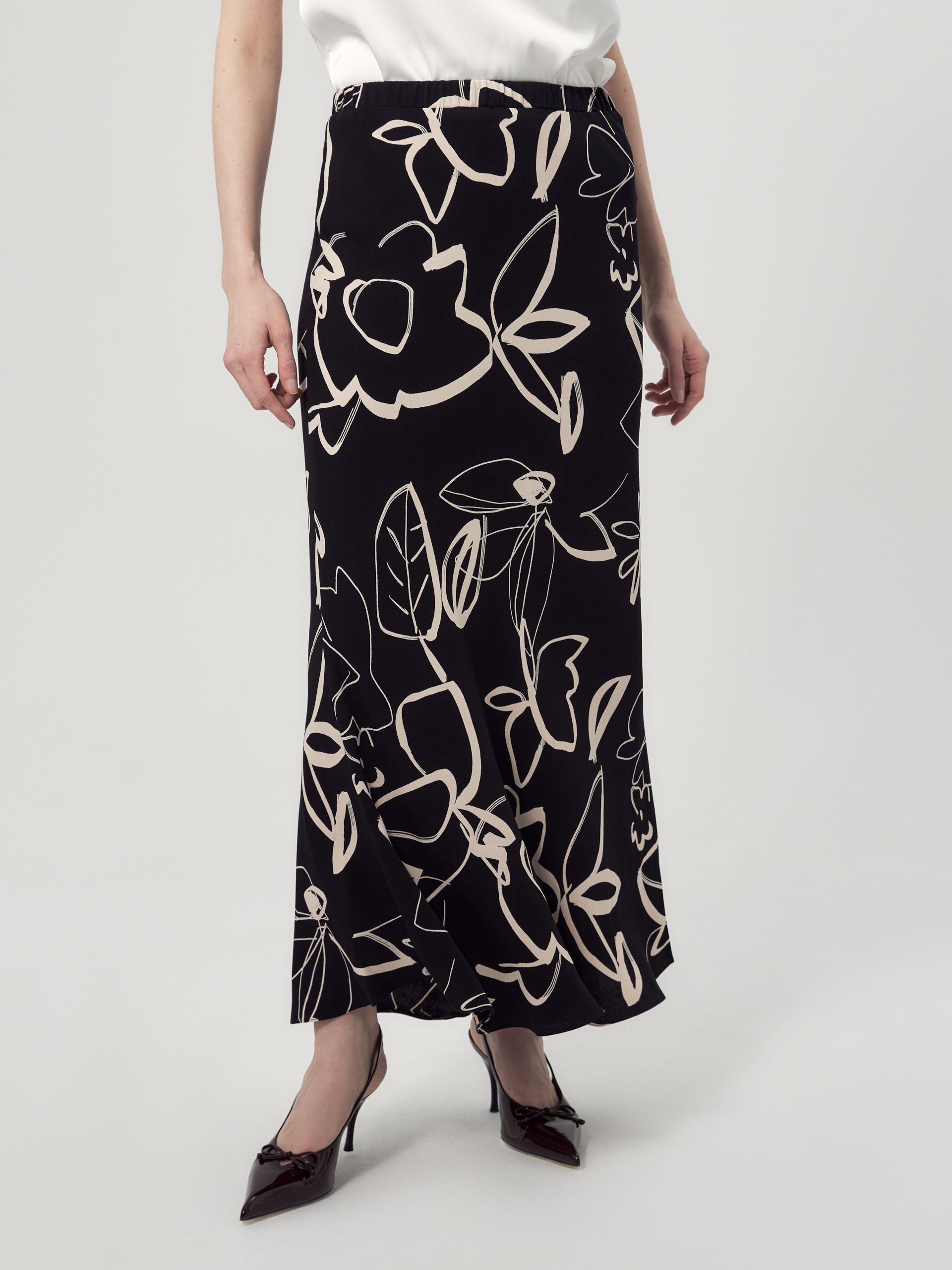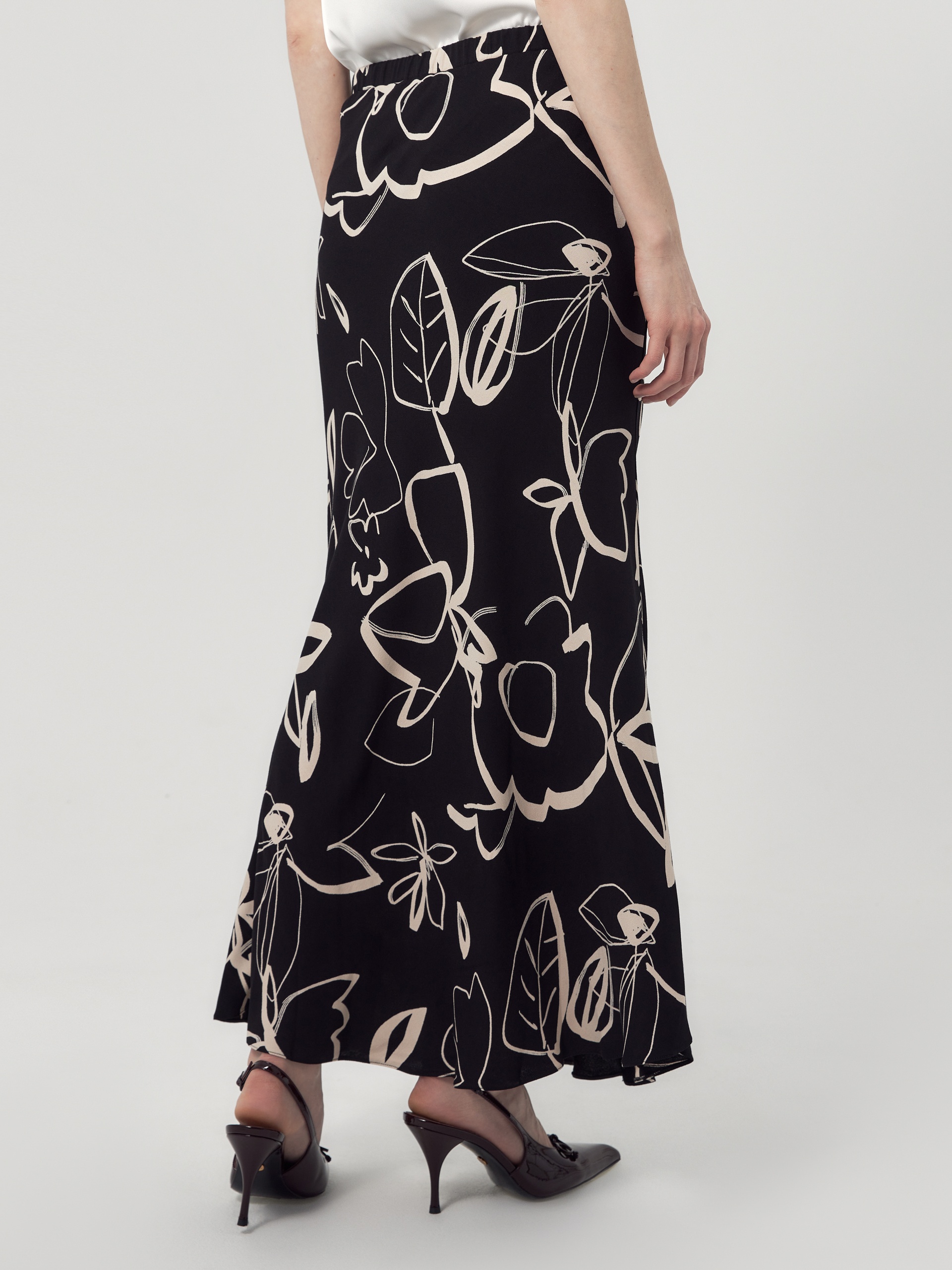 Юбка макси из плательной вискозной ткани с растительным черно-белом принтом. С поясом на резинке, юбка скроена по косой.