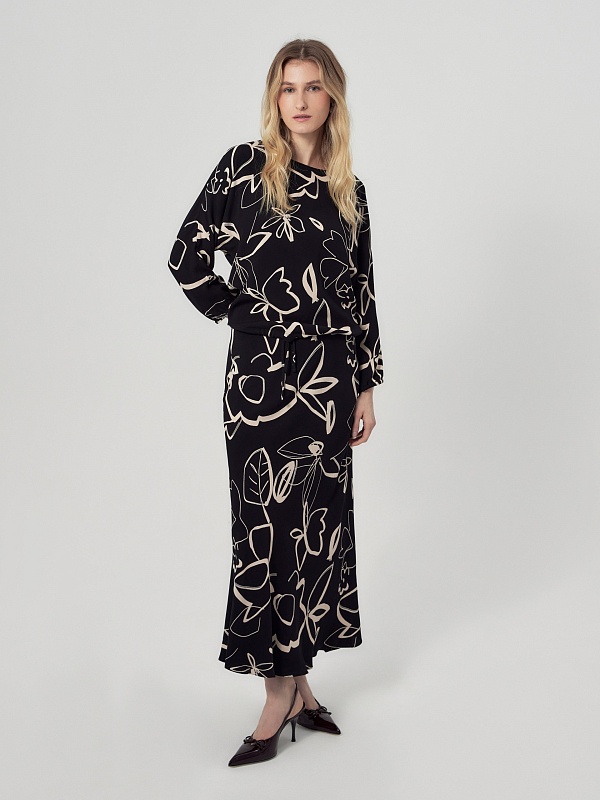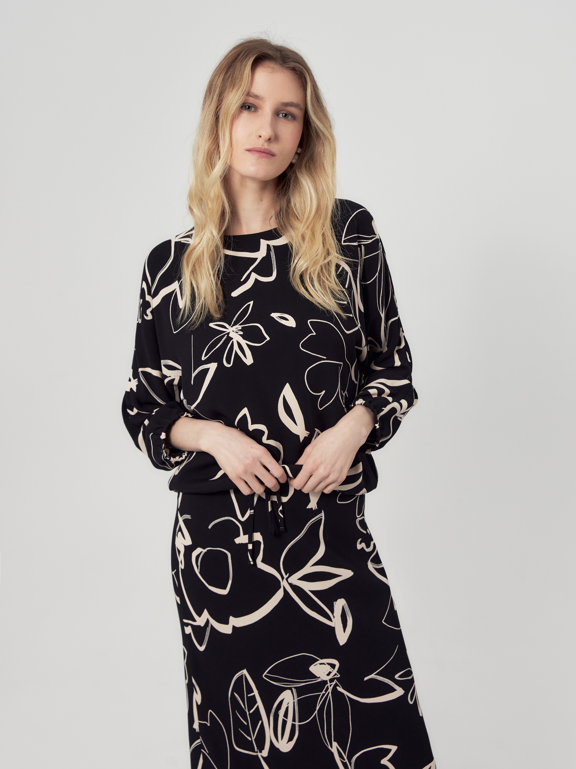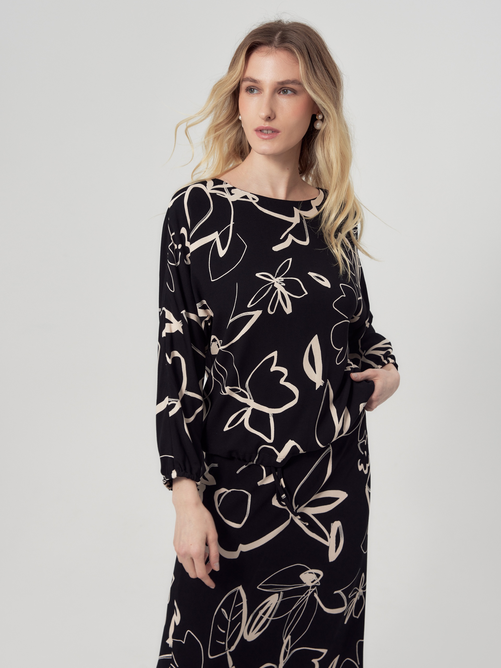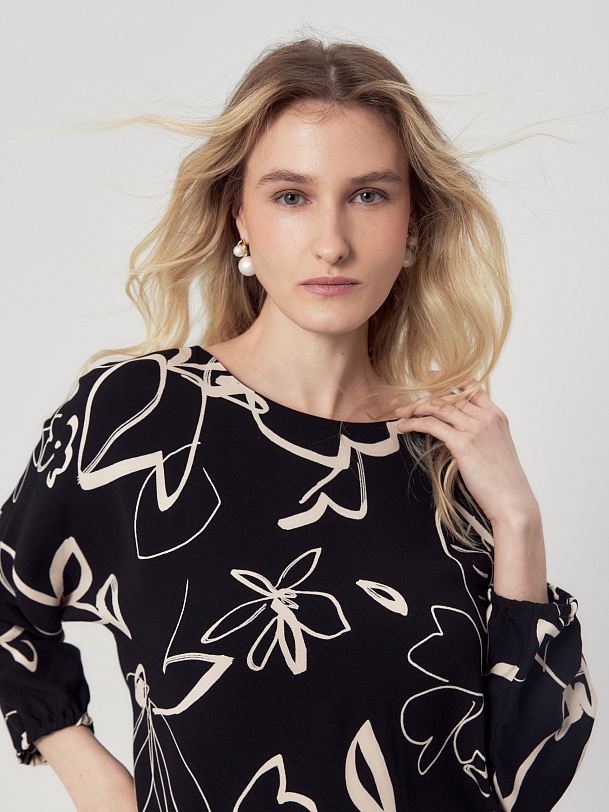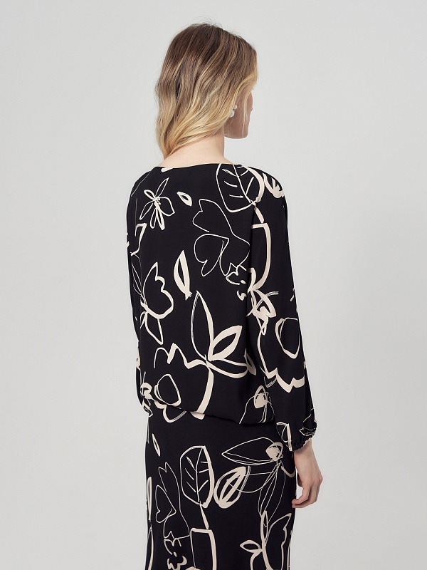 Свободная блуза со свободным рукавом и горловиной лодочкой. Блуза выполнена из плательной вискозной ткани с растительным черно-белом принтом. Рукав-реглан, по низу узкий манжет на сборке. Низ блузы на кулисе, есть завязки из основной ткани со внутренней стороны.