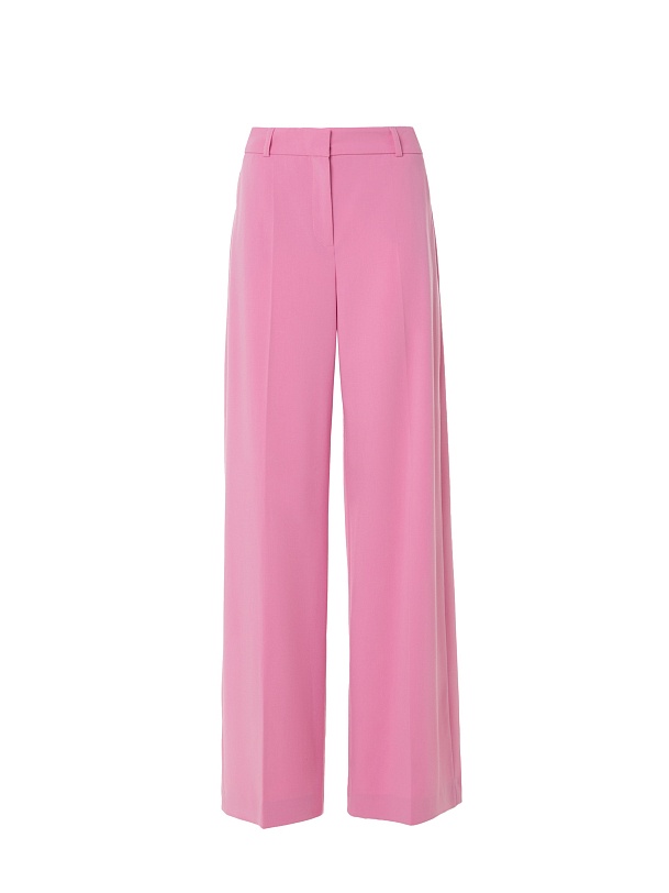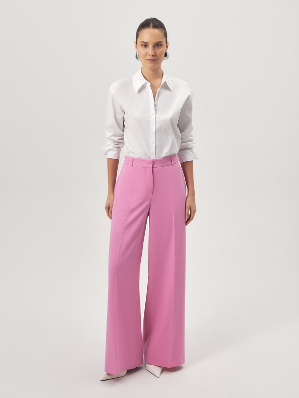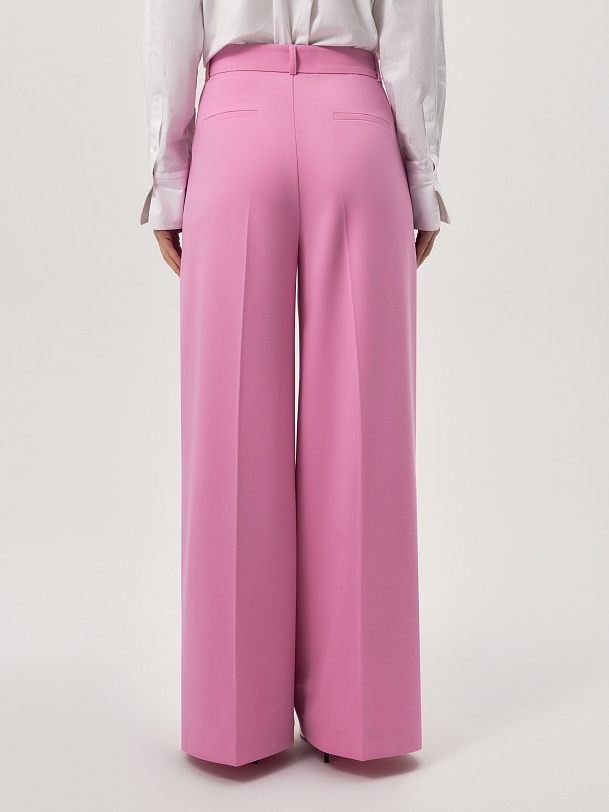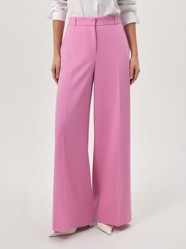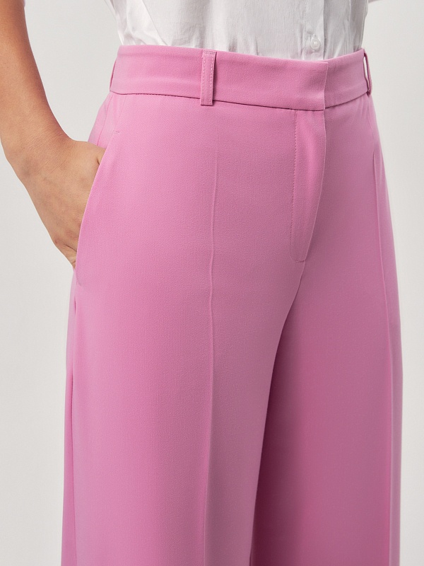 Брюки широкие по низу на талии из вискозной костюмной ткани яркого конфетно - розового цвета. На притачном поясе. Спереди боковые карманы и застежка на молнию и крючок. Составит яркий весенний образ с жакетом из одной ткани.