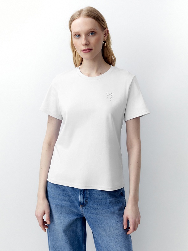 Футболка прямого силуэта классического белого цвета будет прекрасно сочетаться как с денимными изделиями, так и с классическими ансамблями. На груди есть небольшая вышивка в форме бантика. Мерсеризированный хлопок имеет шелковистый блеск и не деформируется после стирок, практически не мнется и не выцветает со временем.