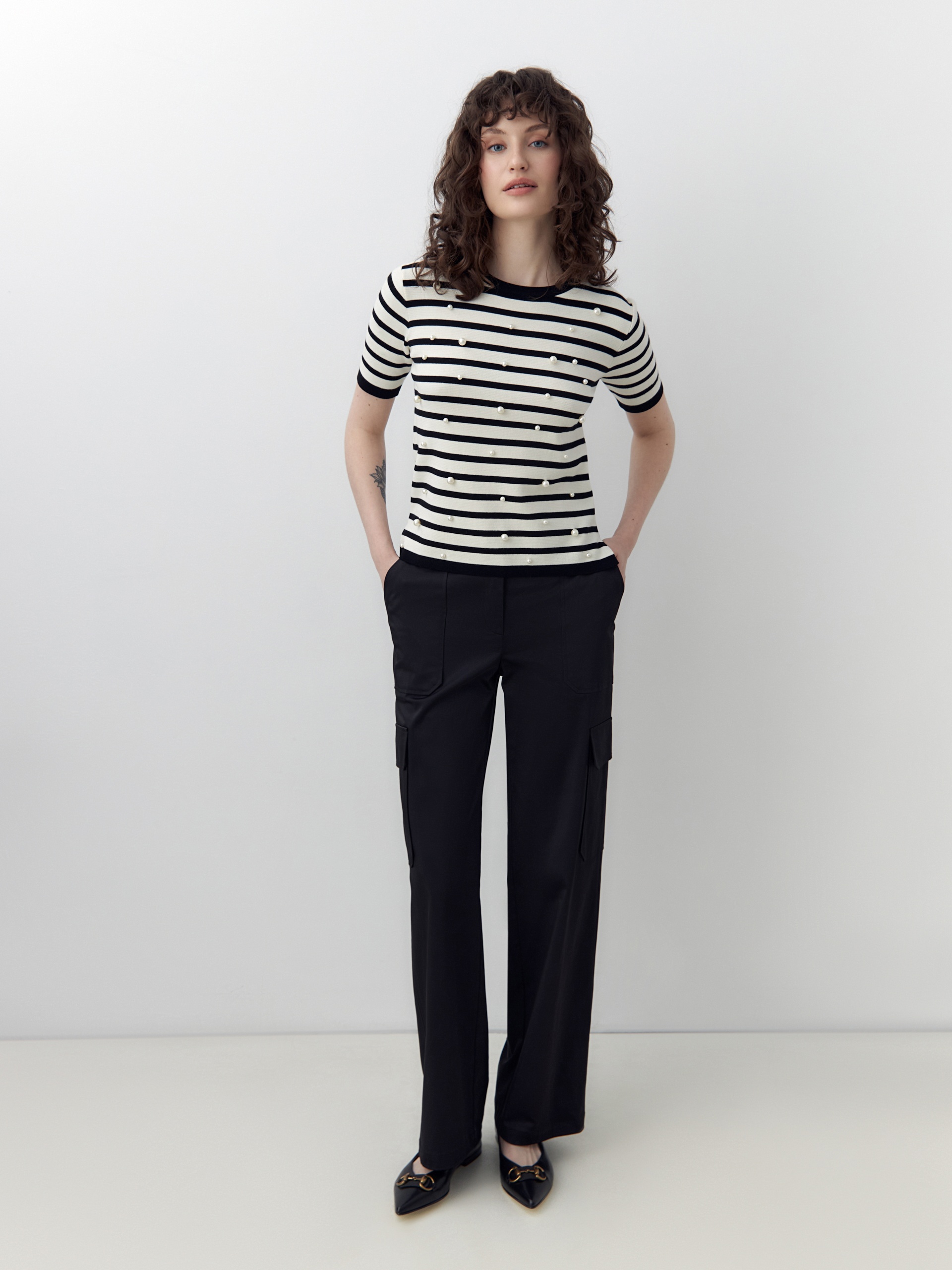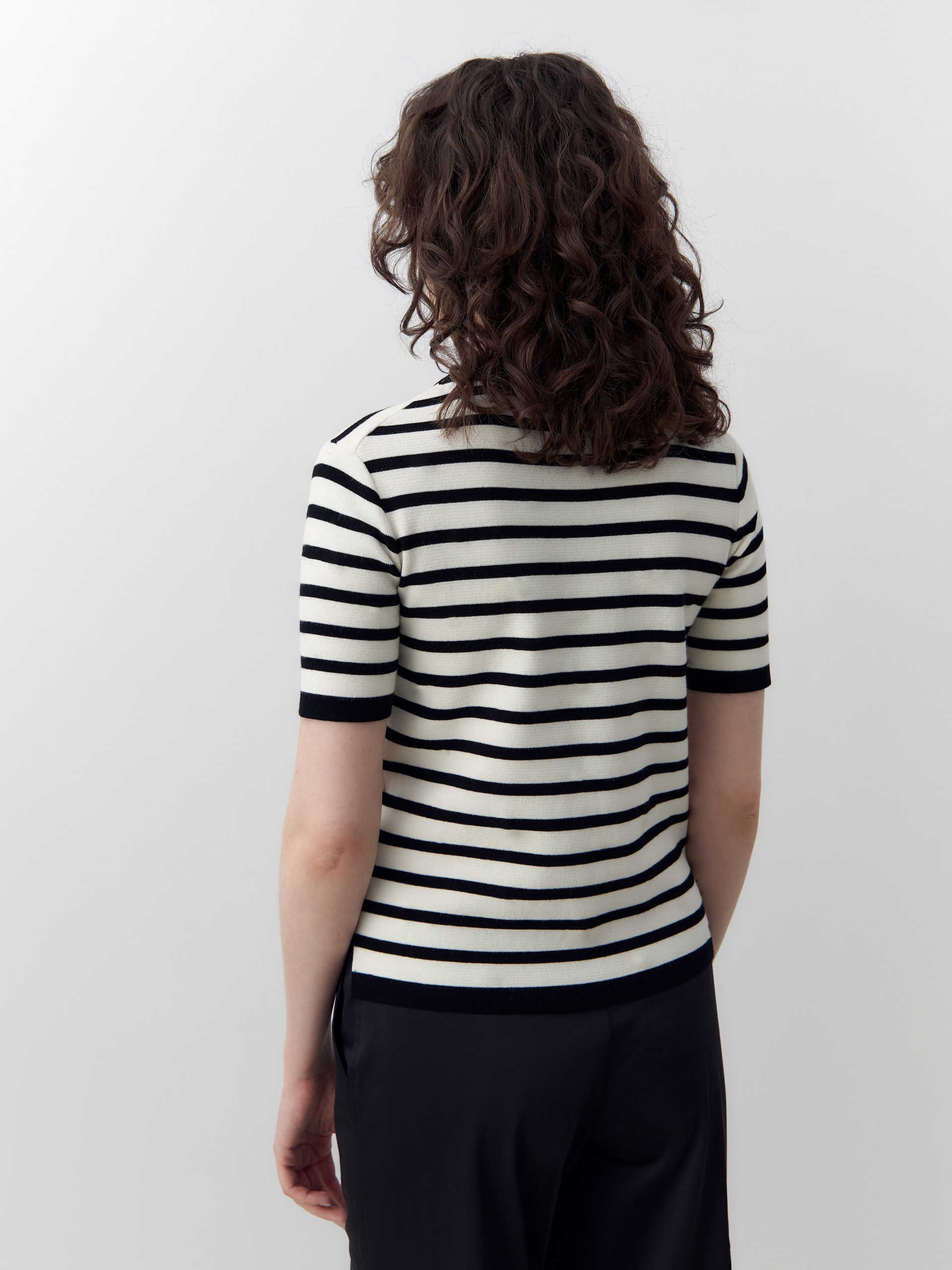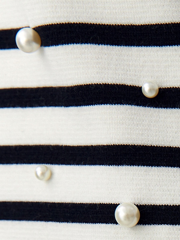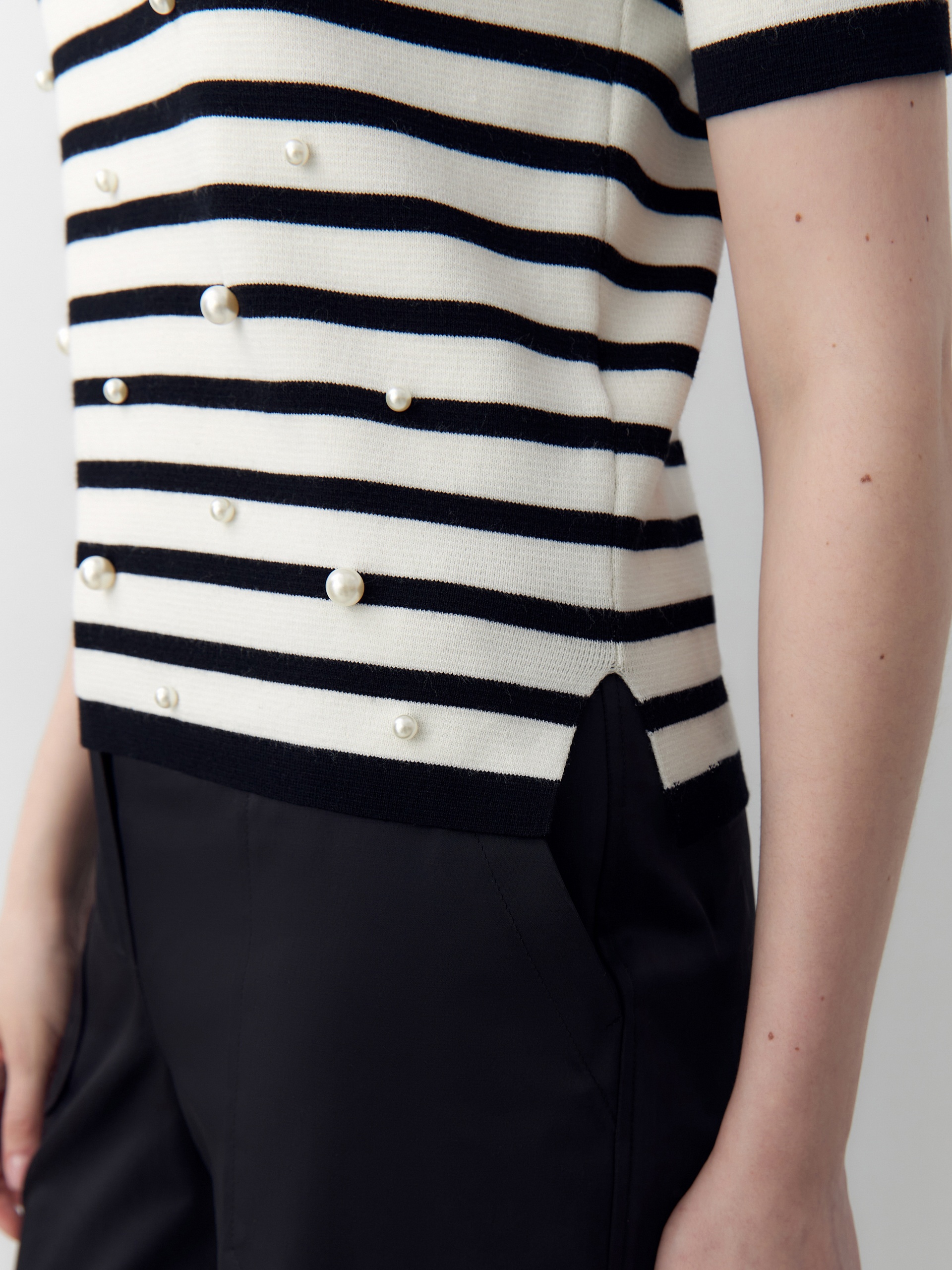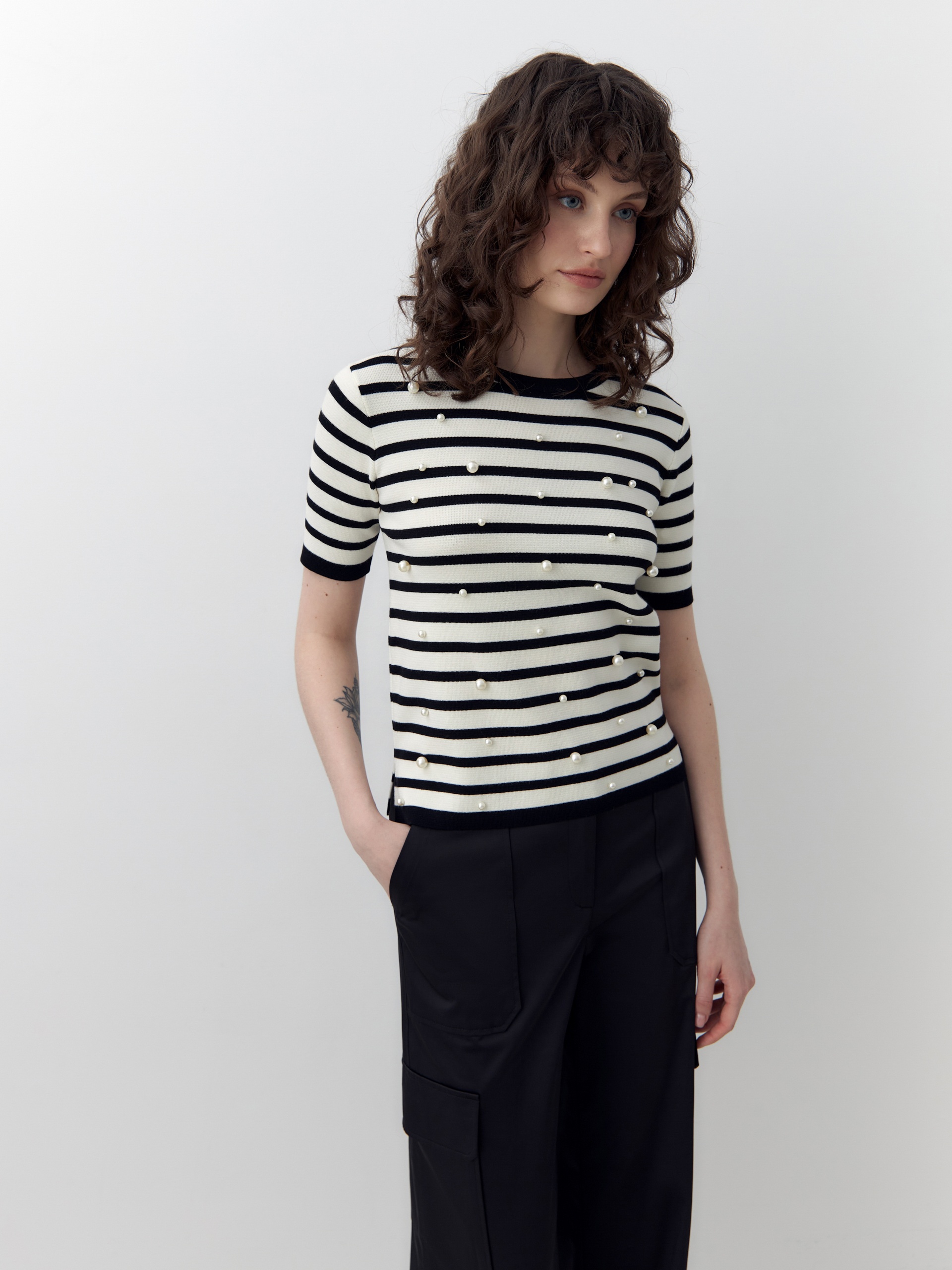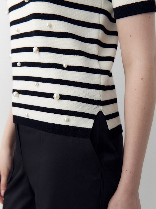 Джемпер с коротким рукавом футболочной формы молочного цвета с черной полоской. Гладкая к коже вискозная нить холодит, не электризуется и обладает легким блеском. На полочке добавлены жемчужные бусины. По боковым швам есть небольшие разрезы.