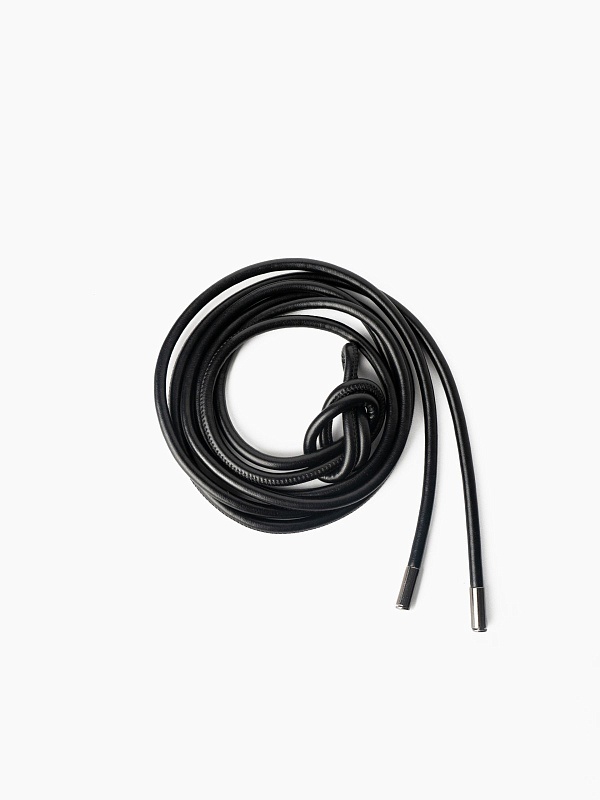 Длинный пояс-шнурок, выполненный из тонкой экокожи в черном цвете, станет неотъемлемым элементом вашего образа.