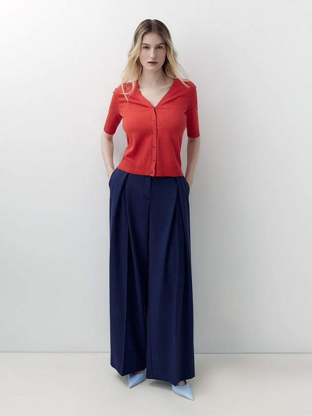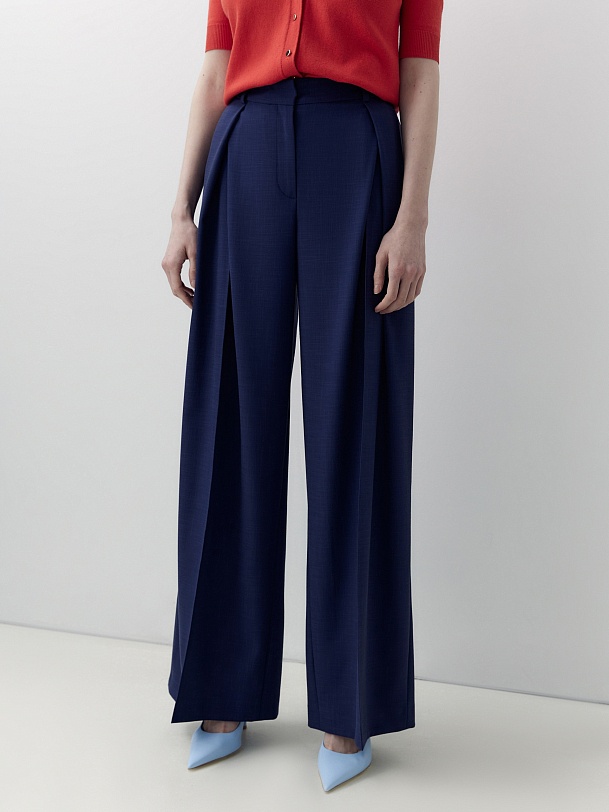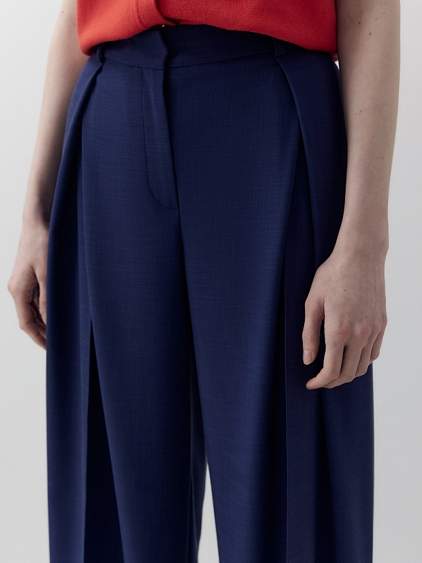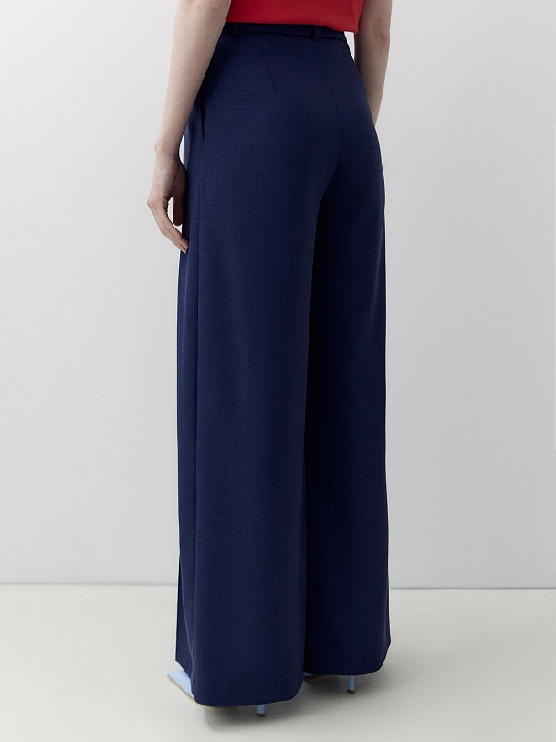 Брюки широкие по низу и с глубокими разнонаправленными складками из вискозной костюмной ткани денимно синего цвета. Пояс прямой на талии со шлевками, на спинке резинка для лучшей посадки.