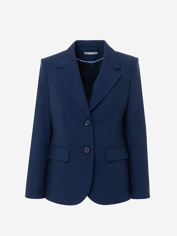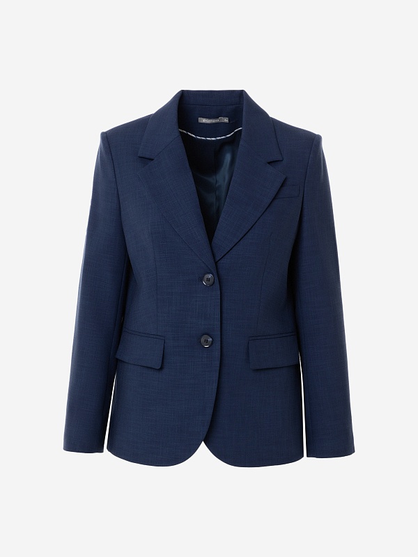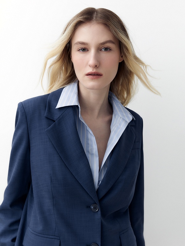 Удлиненный прямой однобортный жакет с V-образным вырезом и английским воротником. Жакет на двух пуговицах с прорезными карманами и клапанами, на спинке шлица.