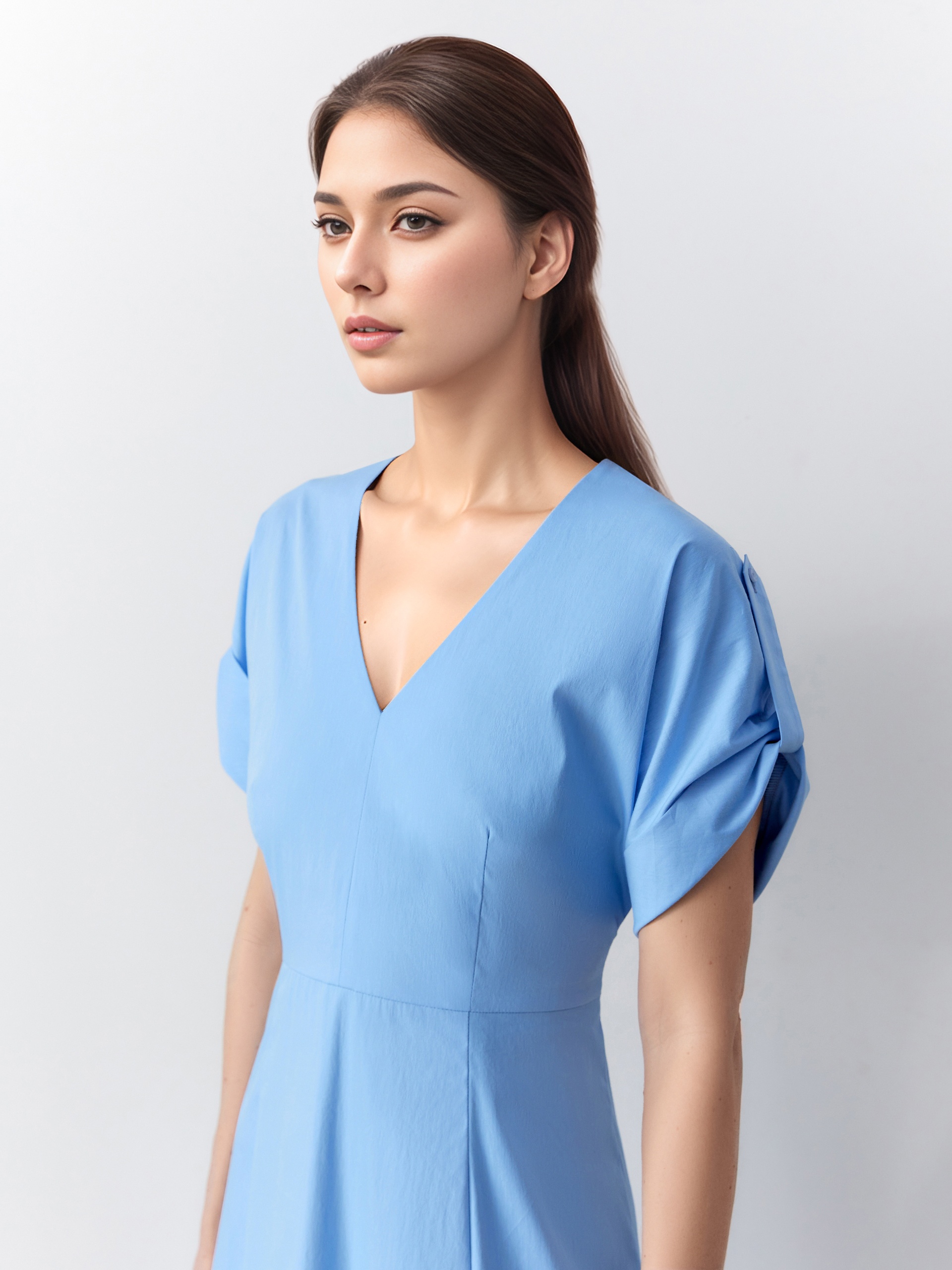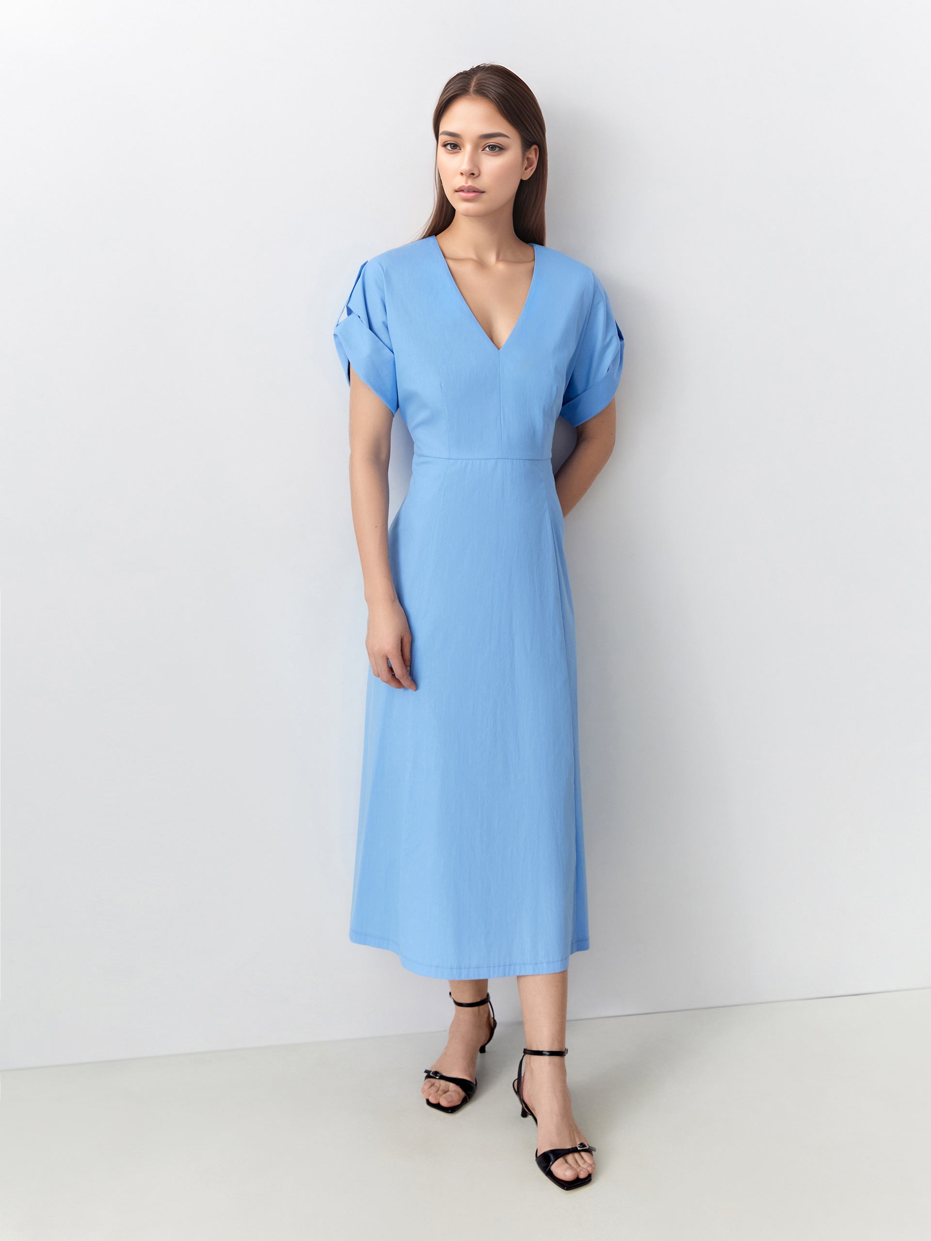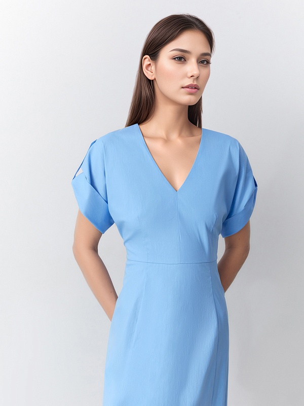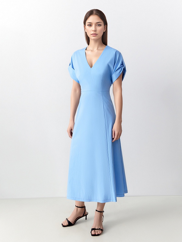 Платье приталенное из хлопковой голубой ткани, отрезное по талии и расклешенной юбкой с клиньями. Платье со спущенной линией плеча отворотами и хлястиками. Горловина с V-образным вырезом. На спинке потайная молния.