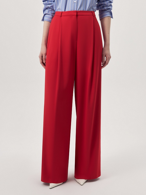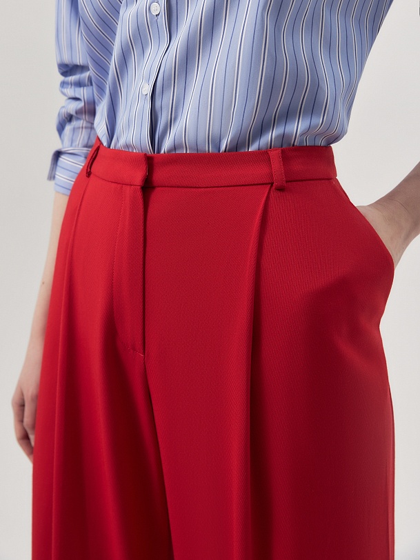 Широкие брюки 7/8 из вискозной ткани красного цвета на подкройном поясе со шлевками. Брюки со складками. Спереди боковые карманы и застежка на молнию и крючок.