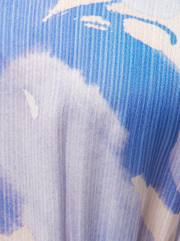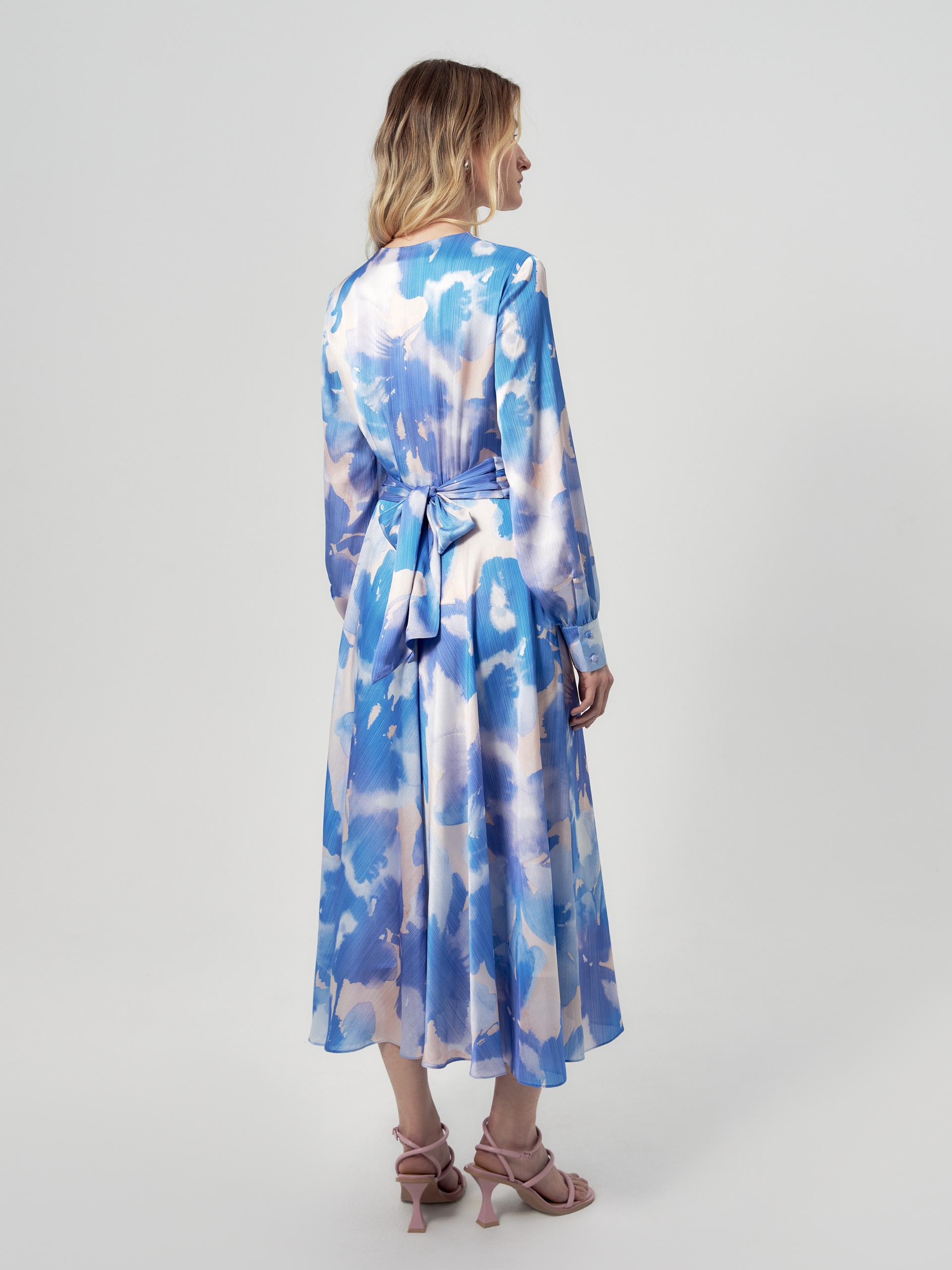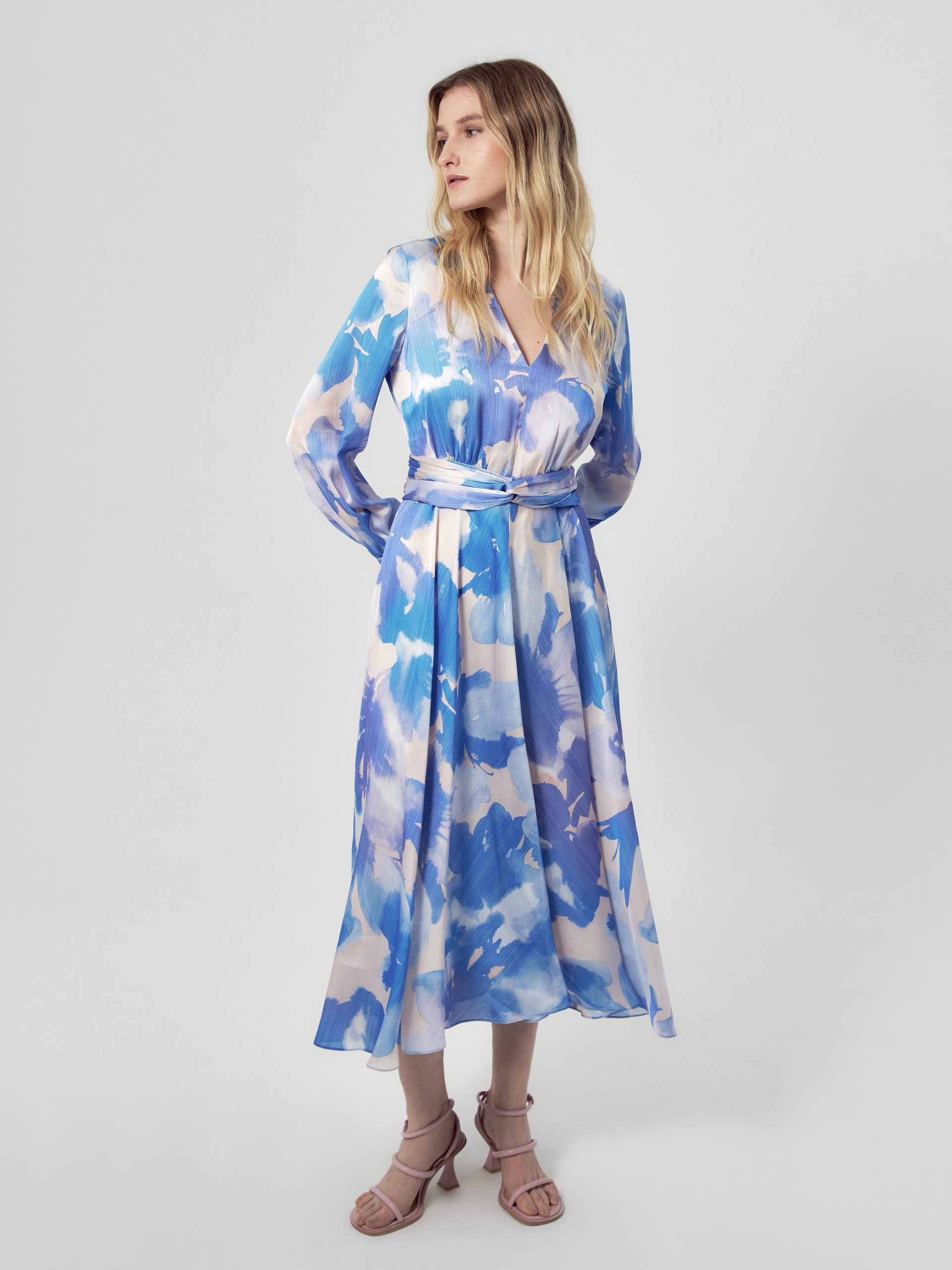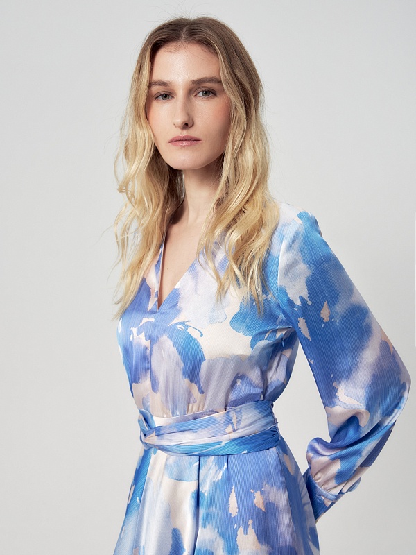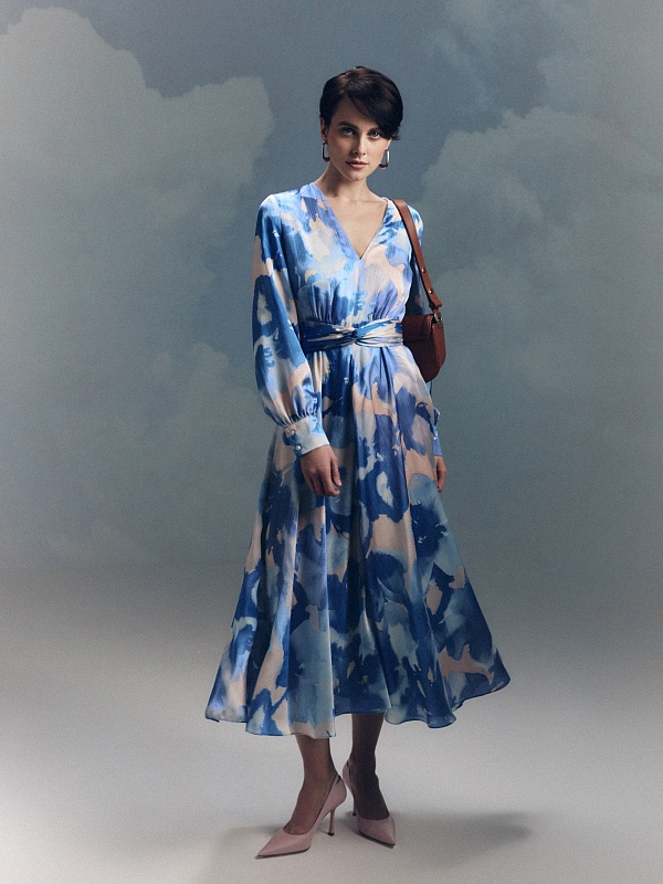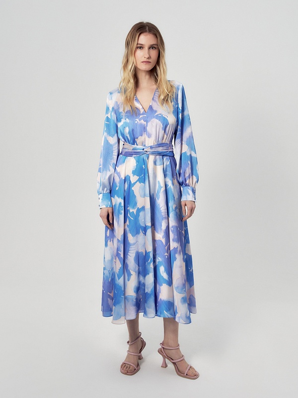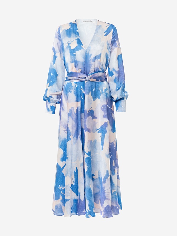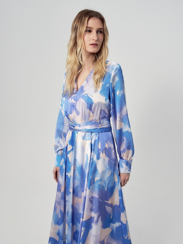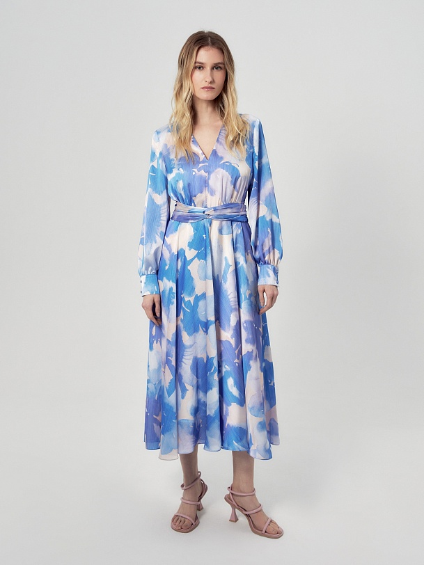Платье приталенного силуэта, отрезное по талии с V-образным вырезом и расклёшенной юбкой, на спинке потайная молния. Рукав классический втачной на манжете со сборкой. В комплект входит съемный пояс из основной ткани. Платье выполнено из плательной ткани в нежно-голубом принте.