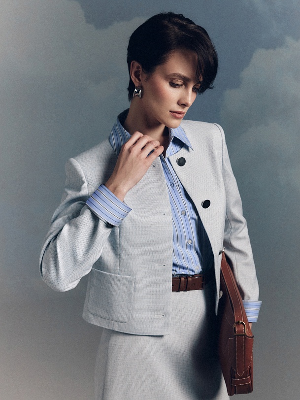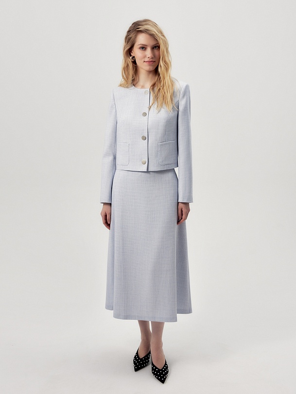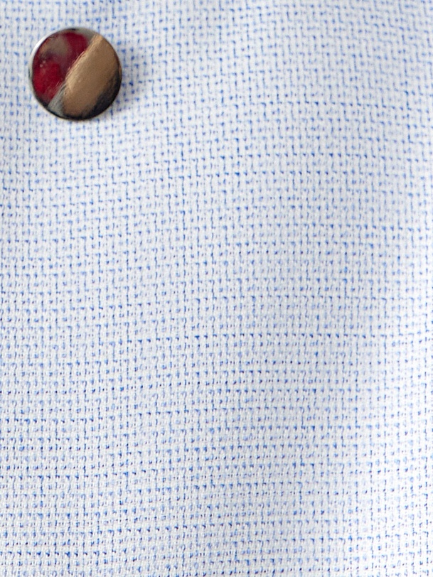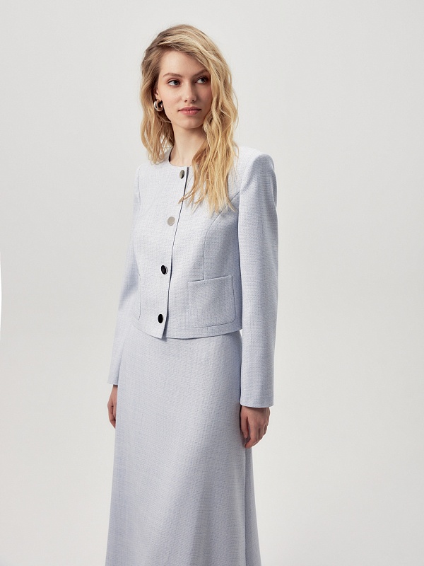 Прямой однобортный укороченный жакет из нежно голубого твида с круглой горловиной на больших металлических пуговиц. Рукав втачной. На полочке накладные карманы. Жакет на подкладке. Эта модель станет отличным выбором для создания как деловых, так и повседневных образов, придавая им особый шарм и оригинальность.