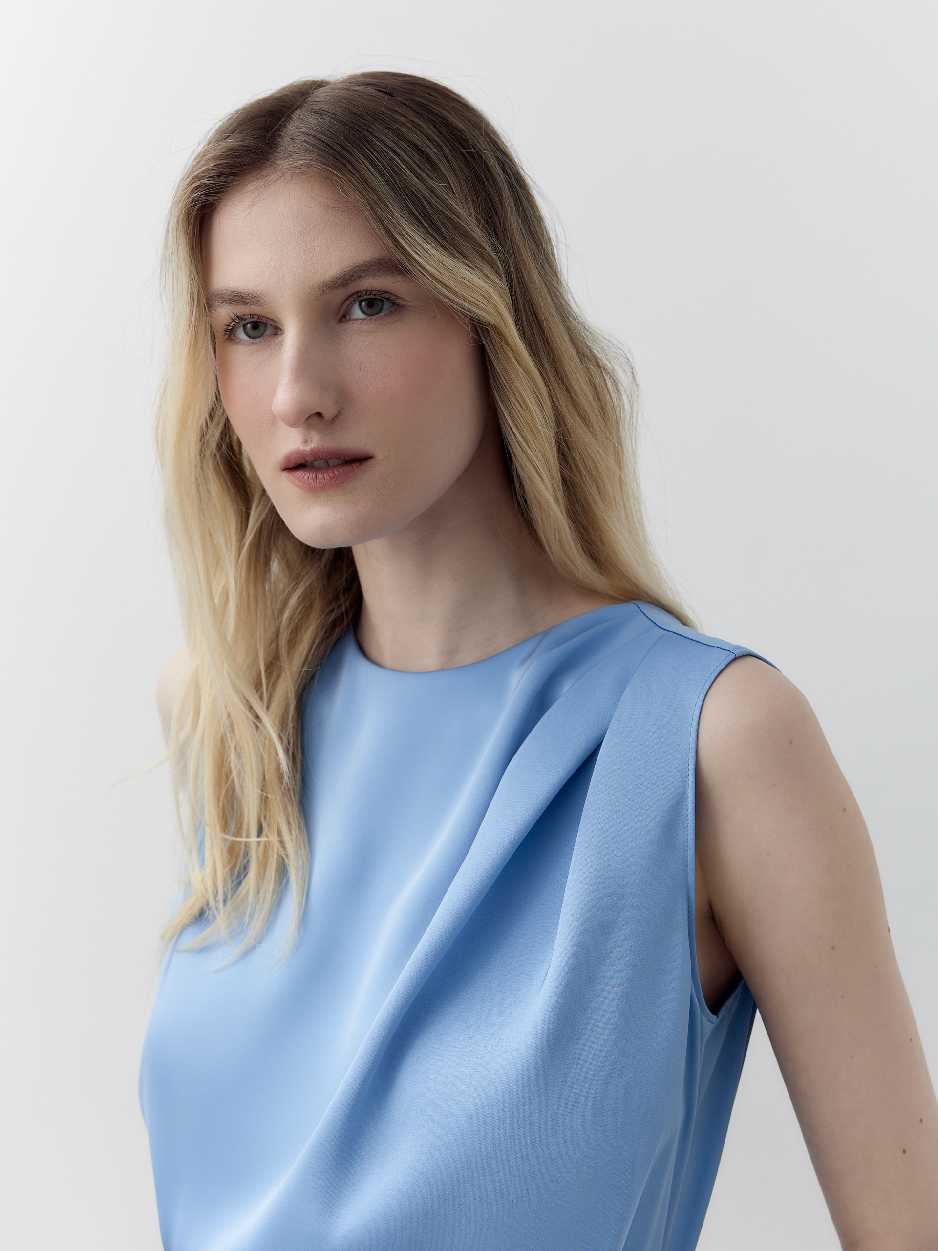 Прямая блуза из голубого атласа с круглой горловиной и складками по плечу. На спинке капелька и пуговицы....