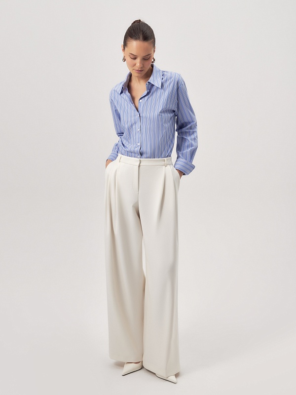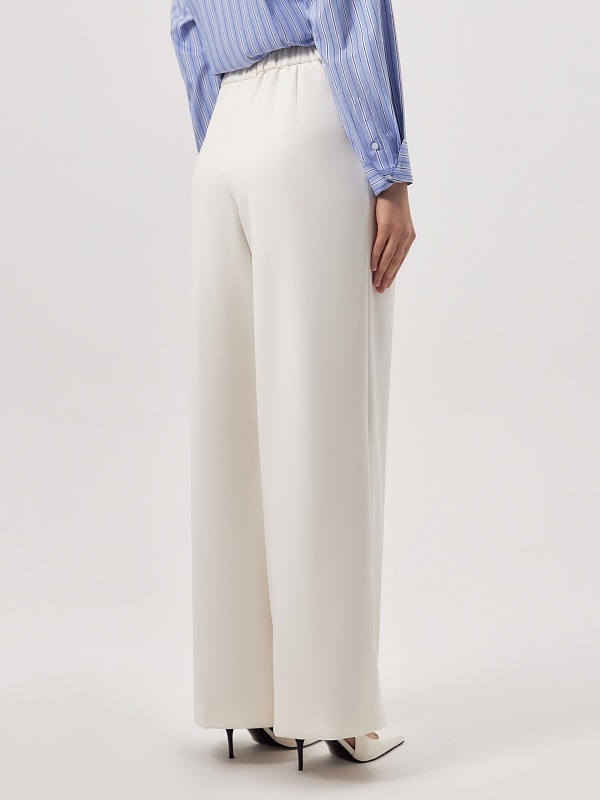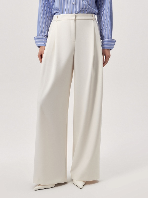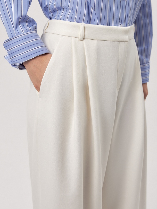 Широкие брюки со складками из костюмной ткани молочного цвета на притачном поясе со шлевками. Спереди боковые карманы и застежка на молнию и крючок, на спинке резинка в поясе для лучшей посадки брюк. Эта модель идеально сочетается с жакетом и жилетом из этой же ткани.