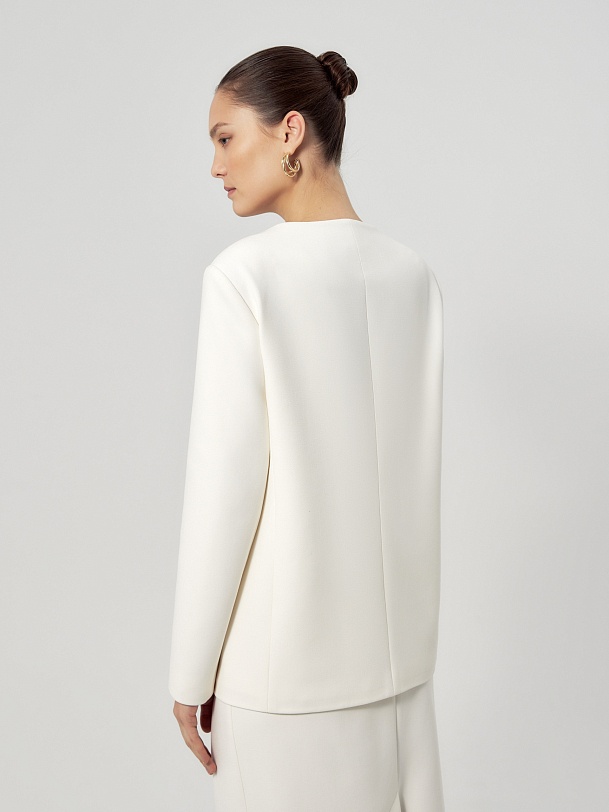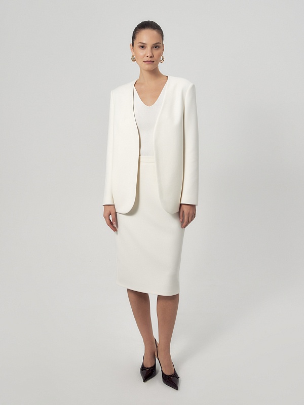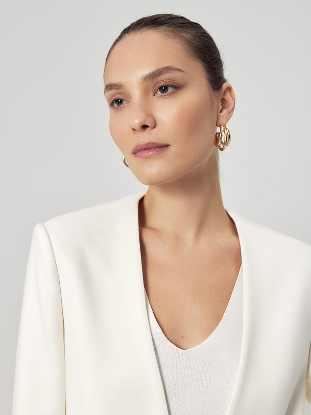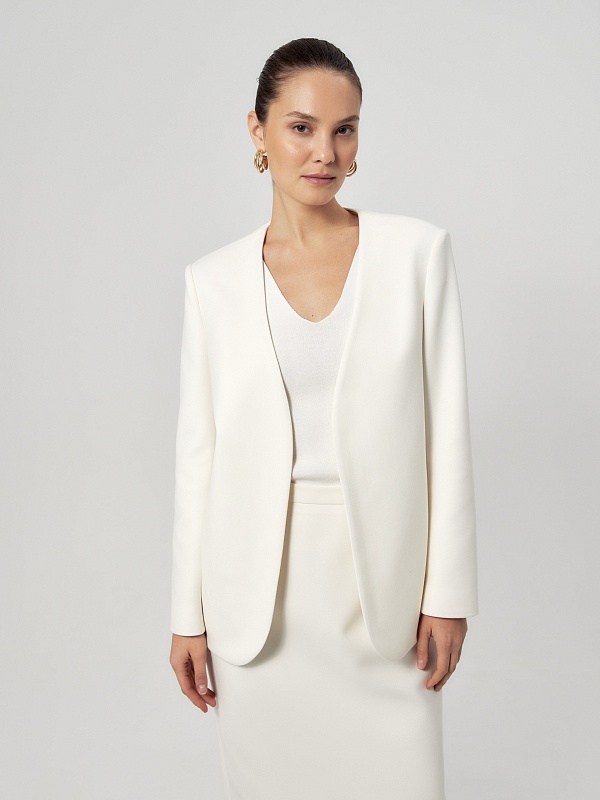Прямой удлиненный жакет без застежки с V-образным вырезом и закругленным бортом, в рельефах есть потайные карманы. Жакет на подкладке. Костюм из прямого жакета без застежки станет элегантным решением для весеннего гардероба.