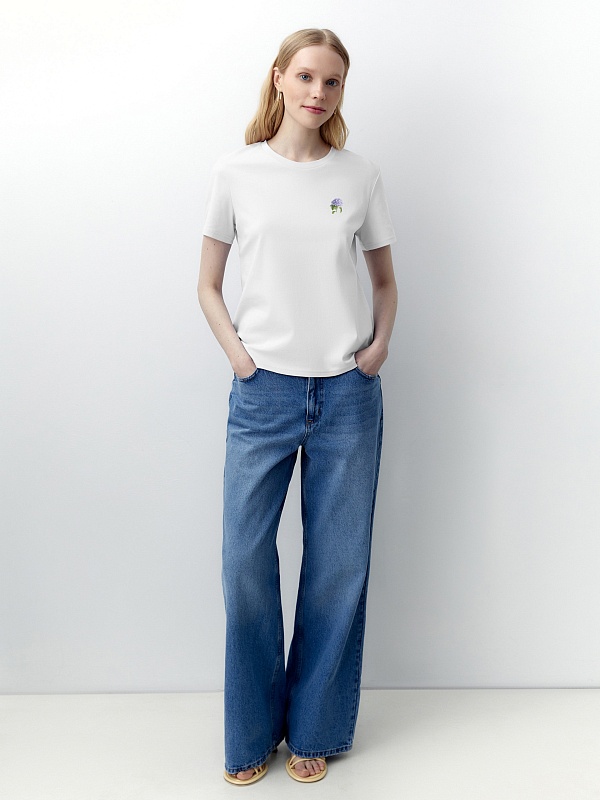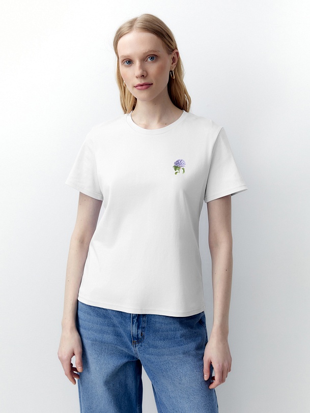 Футболка прямого силуэта классического белого цвета с небольшим цветочным принтом на груди, будет прекрасно сочетаться как с денимными изделиями, так и с классическими ансамблями. Мерсеризированный хлопок имеет шелковистый блеск и не деформируется после стирок, практически не мнется и не выцветает со временем.
