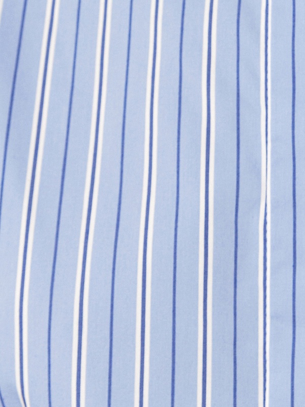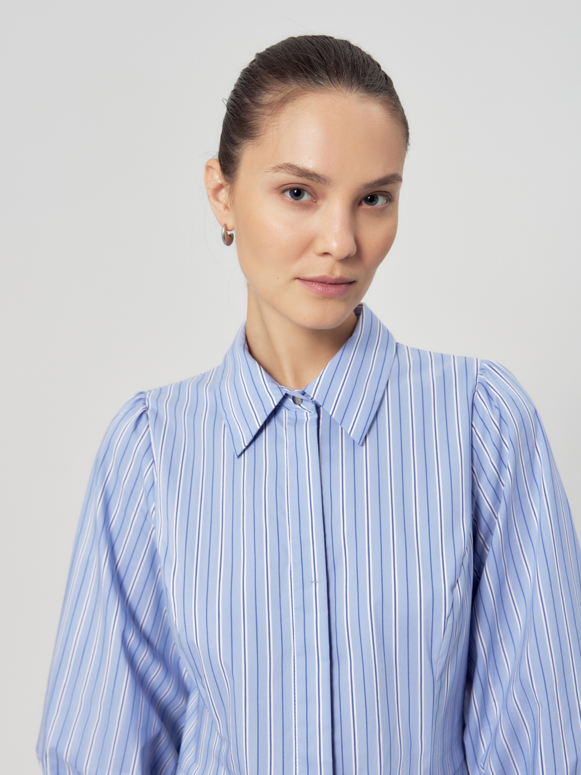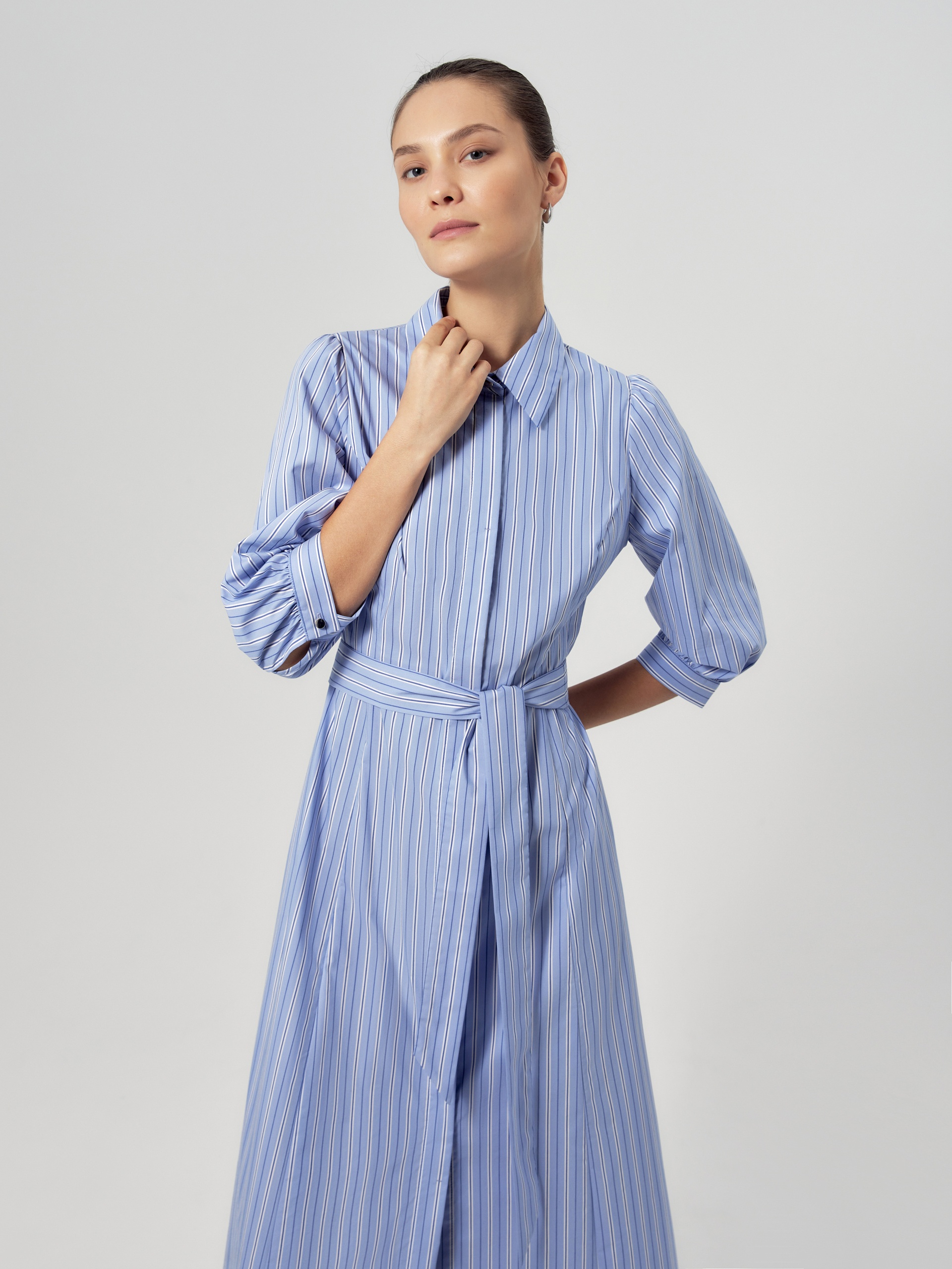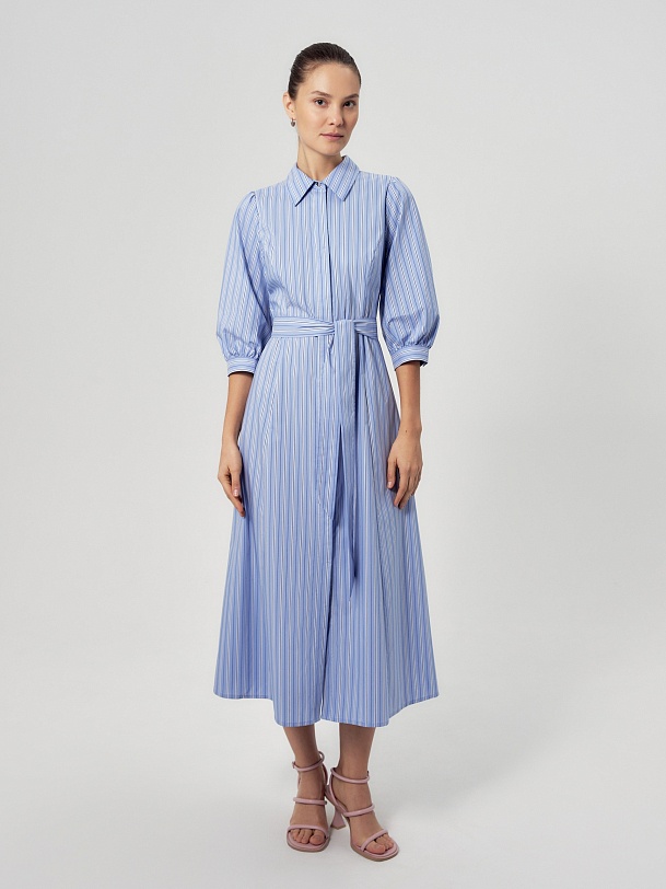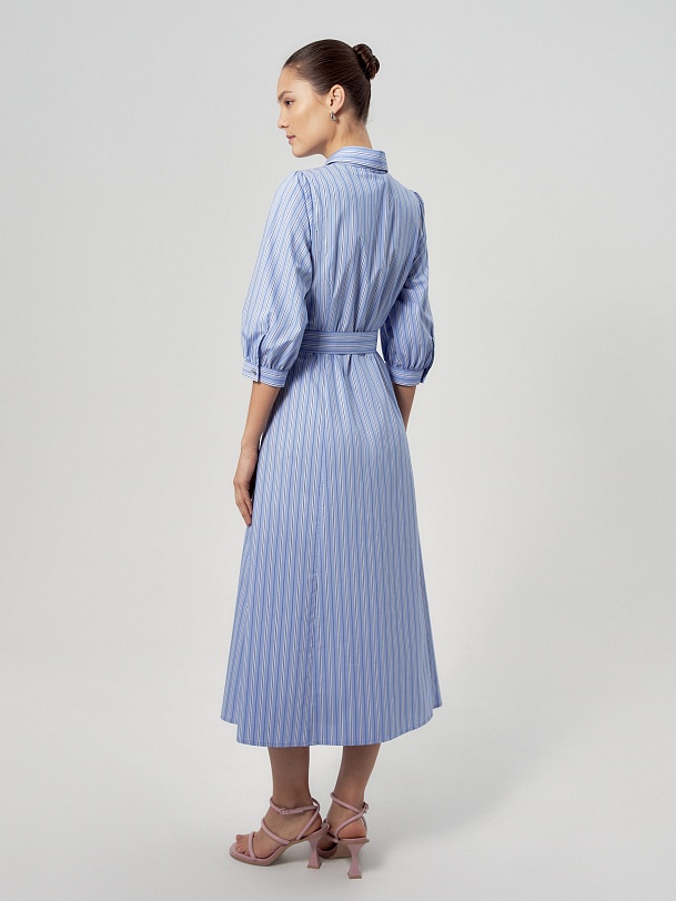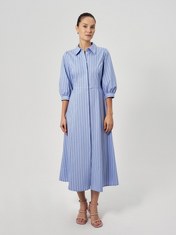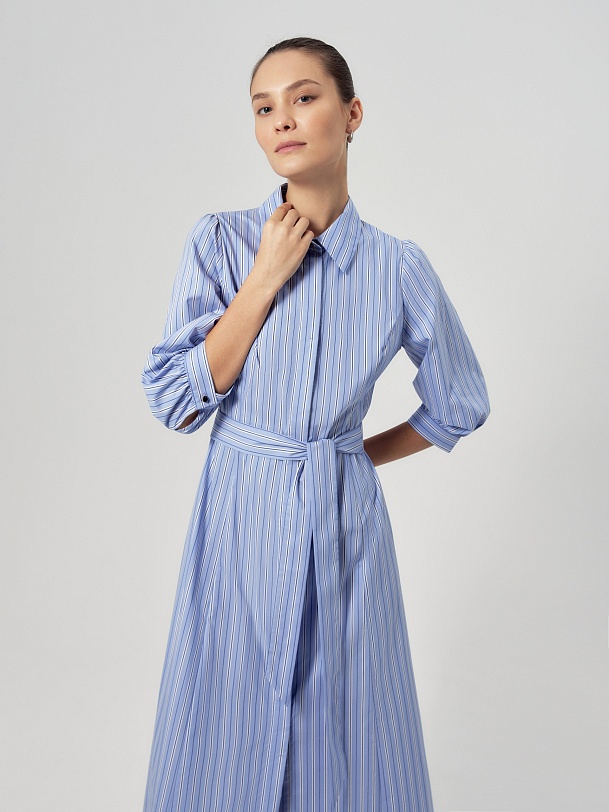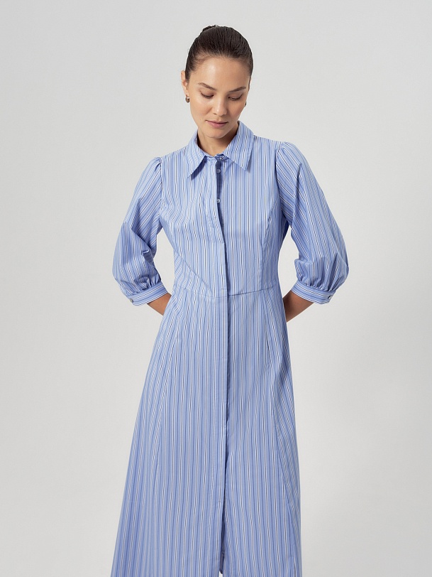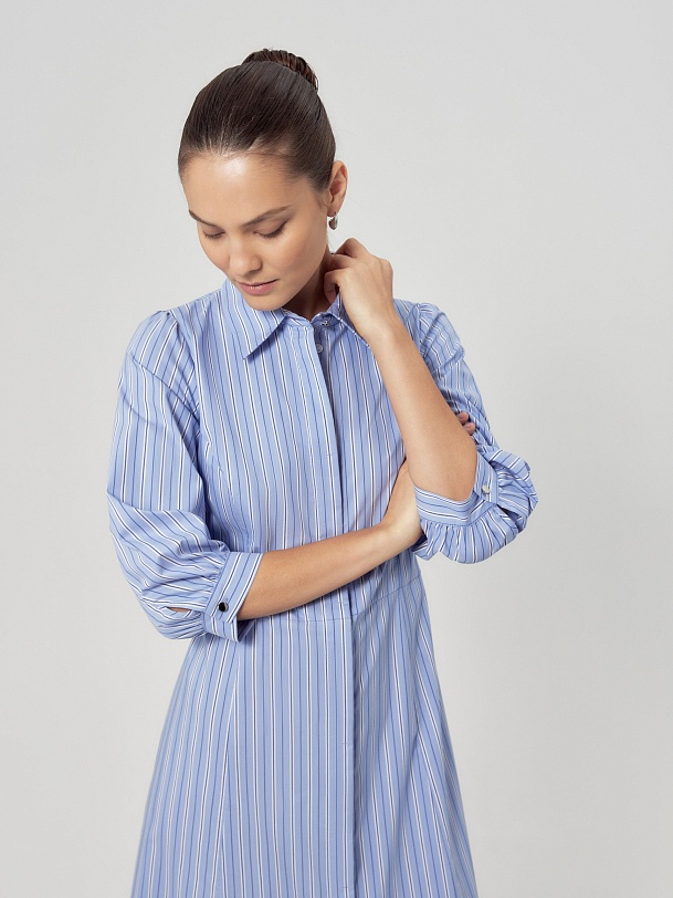 Приталенное платье рубашка из голубой хлопковой ткани в разноформатную полоску. Воротник отложной, потайная застежка на пуговицы, по линии талии отрезное. Платье с укорочённым рукавом со сборкой по плечу и манжету.