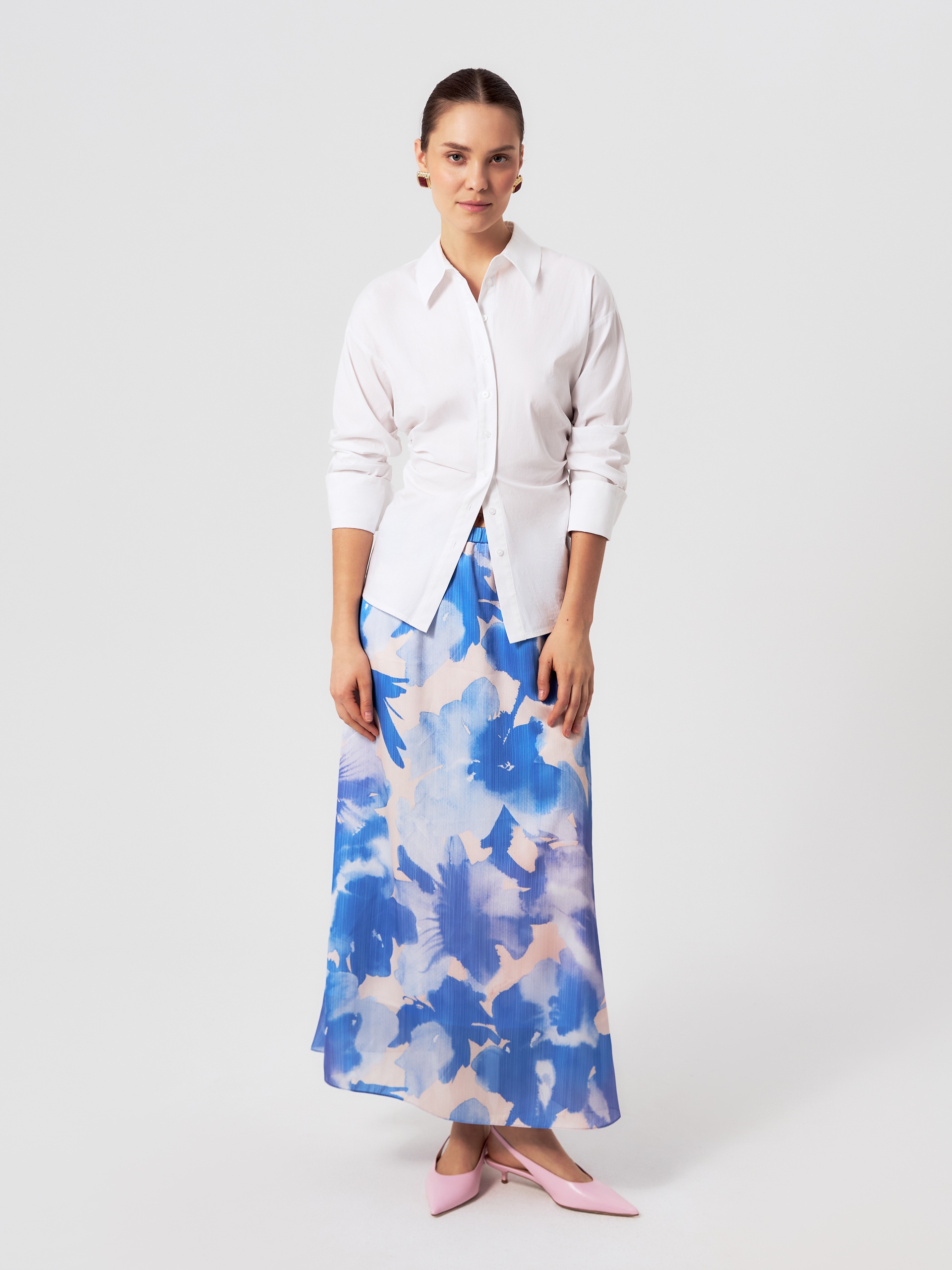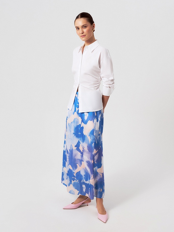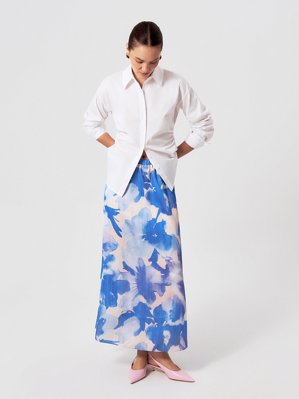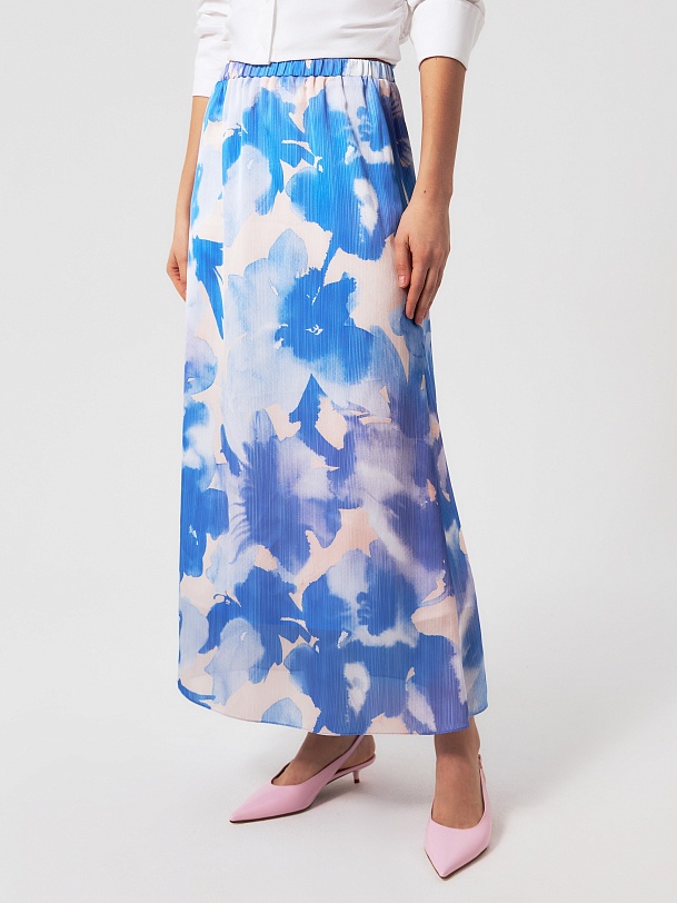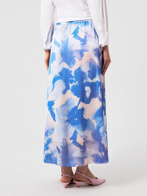 Юбка макси с поясом на резинке. Юбка выполнена из плательной ткани в нежно-голубом принте. Юбка на подкладке.