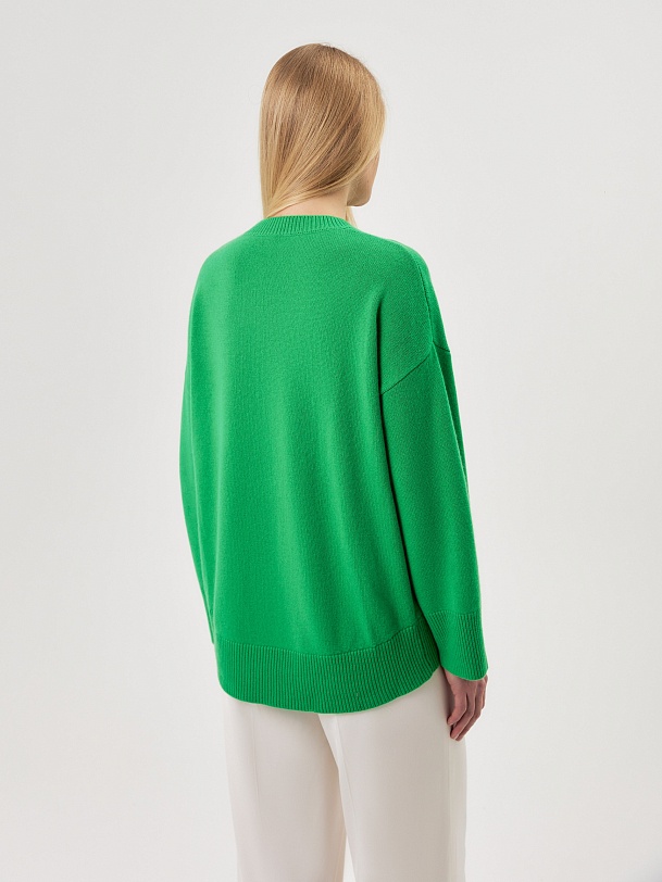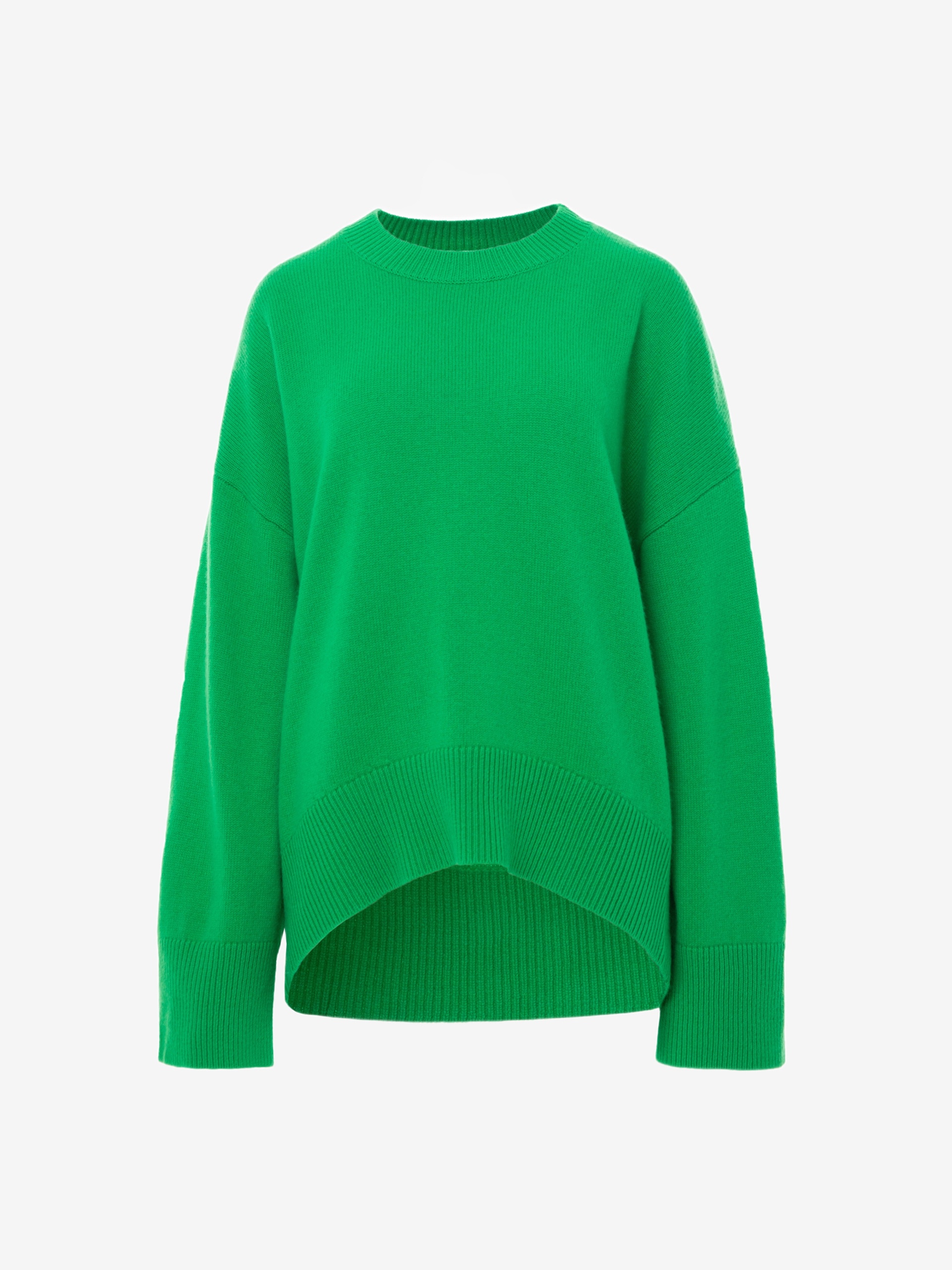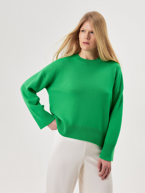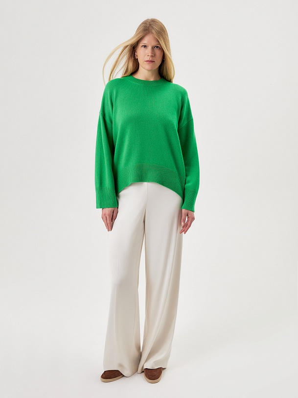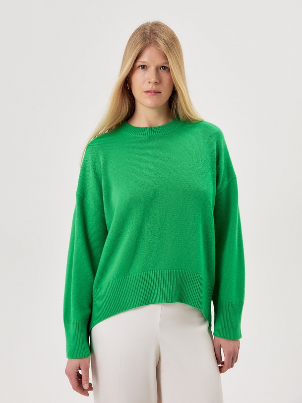 Свободный кашемировый джемпер с круглым вырезом и спущенной линией плеча.