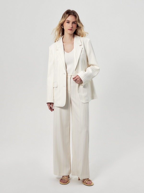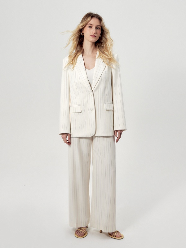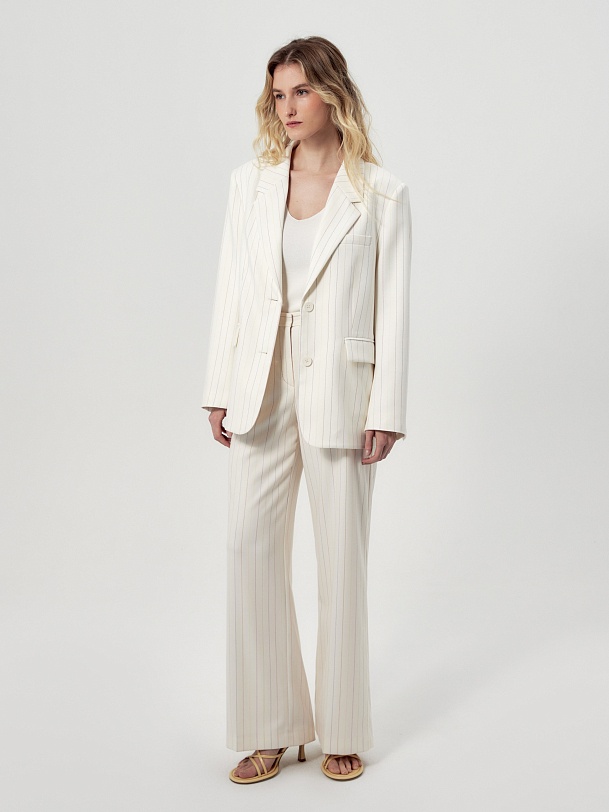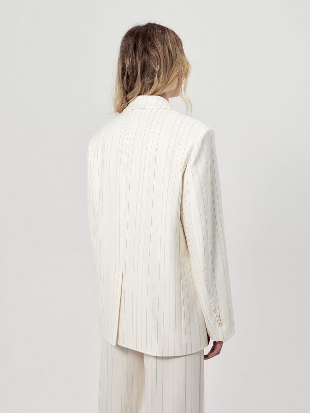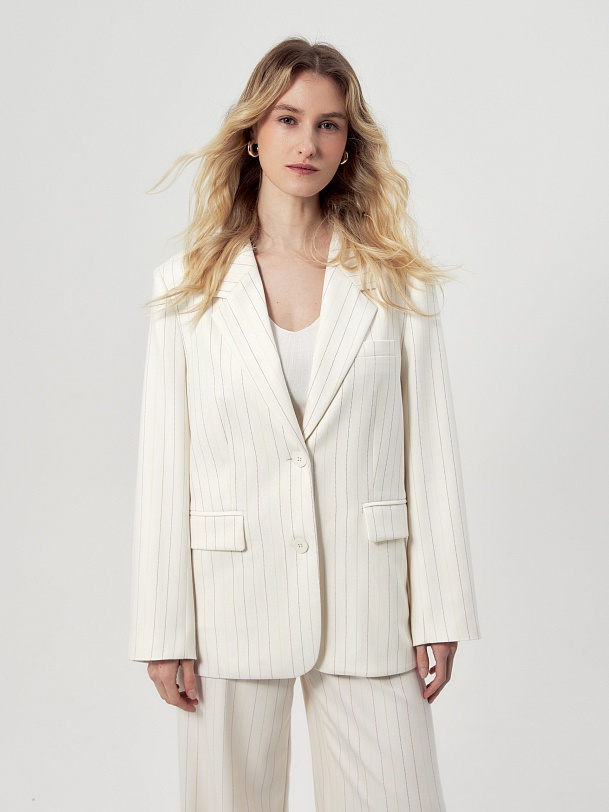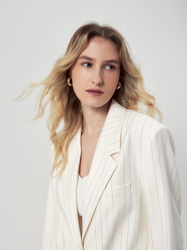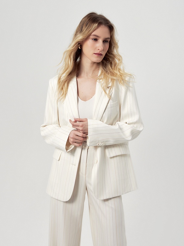 Приталенный однобортный жакет из костюмной ткани молочного цвета с тонкой разноцветной полоской. Жакет с английским воротником на трех пуговицах, на груди листочка и прорезные карманы на полочке. Рукав классический с пуговицами, на спинке шлица. Такой жакет будет отлично сочетается с брюками из одной ткани так и однотонными брюками из молочной ткани.