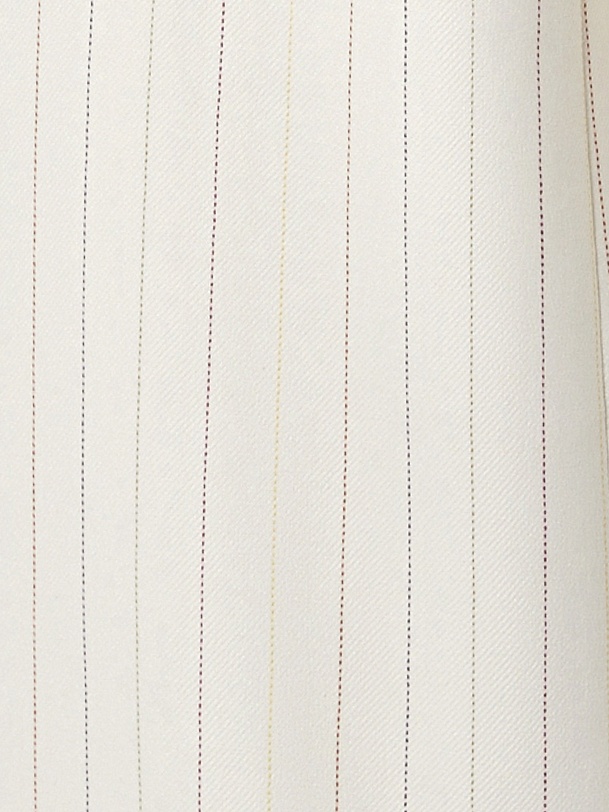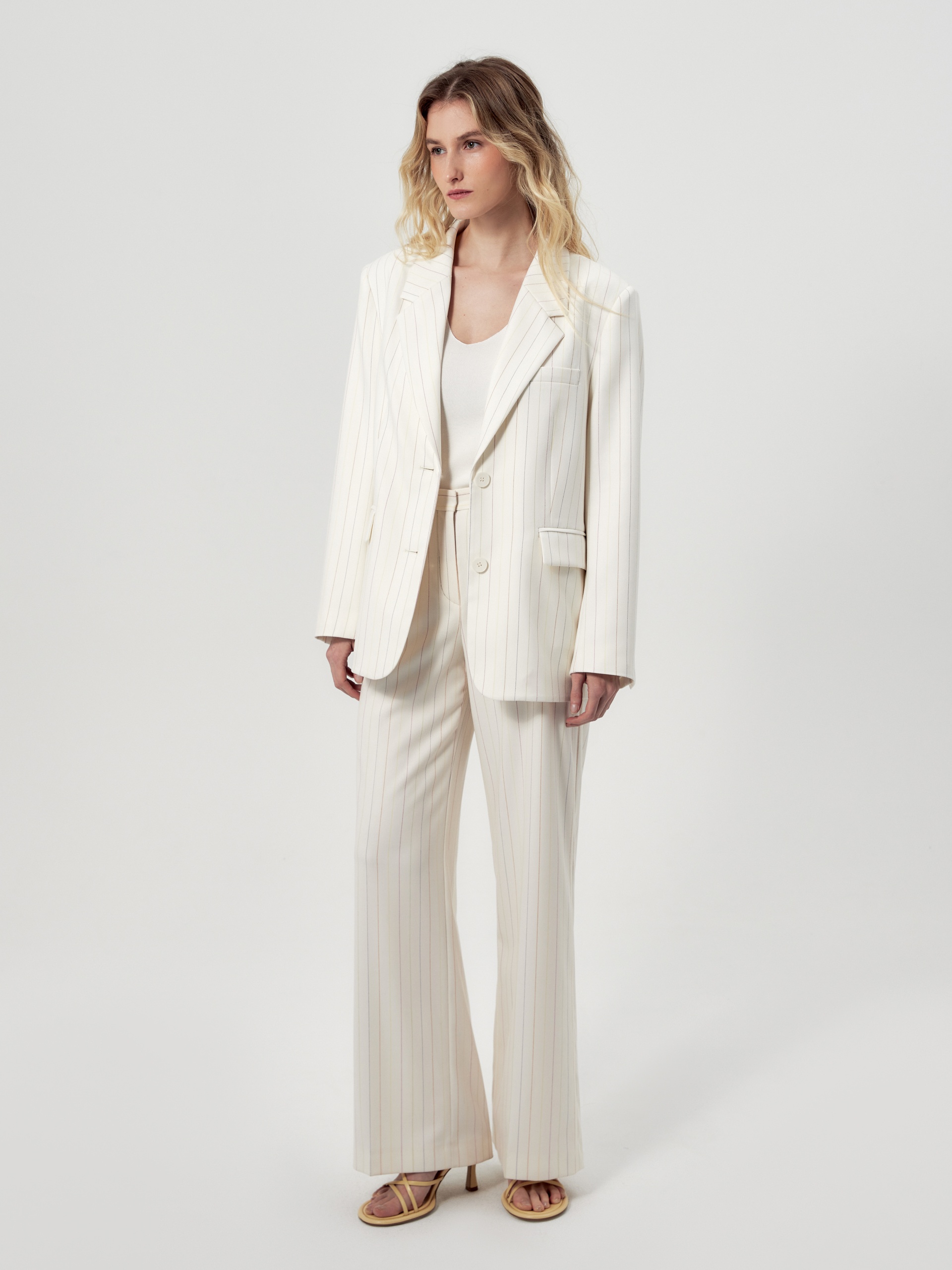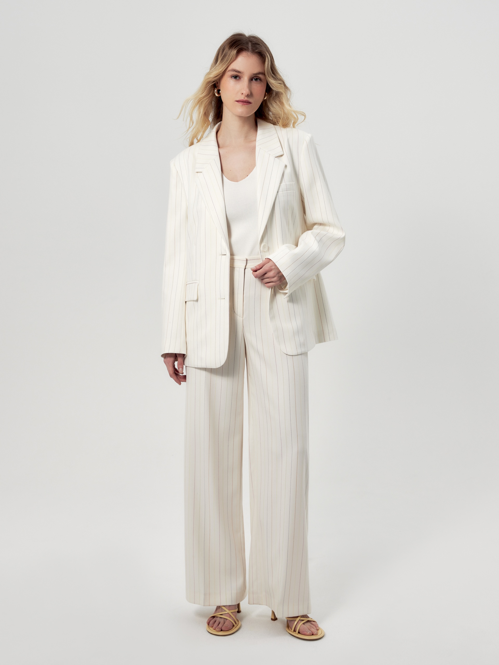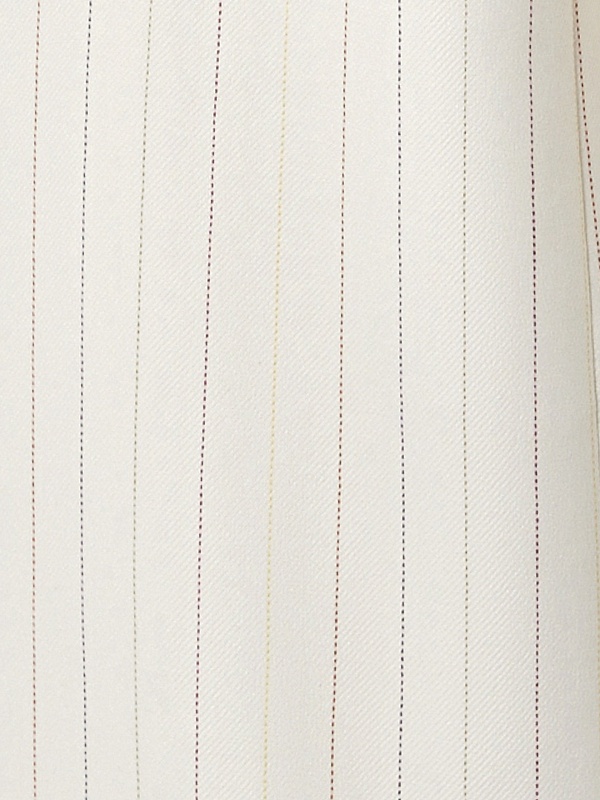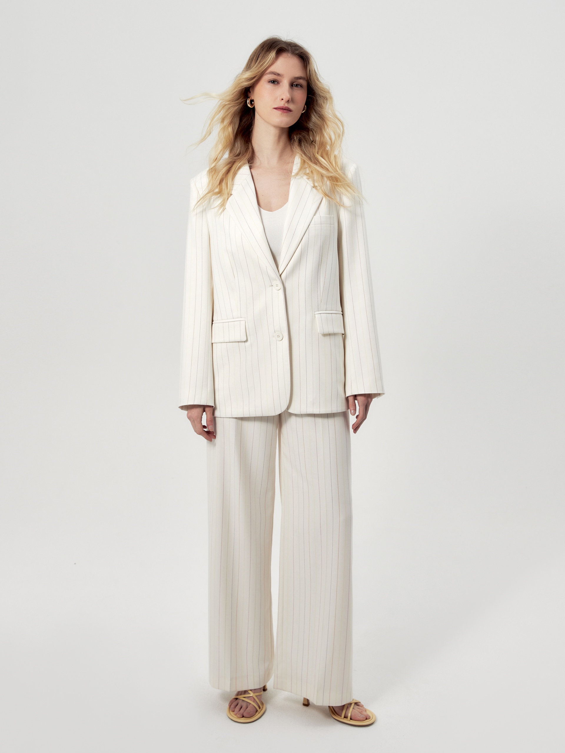 Приталенный однобортный жакет из костюмной ткани молочного цвета с тонкой разноцветной полоской. Жакет с английским воротником на трех пуговицах, на груди листочка и прорезные карманы на полочке. Рукав классический с пуговицами, на спинке шлица. Такой жакет будет отлично сочетается с брюками из одной ткани так и однотонными брюками из молочной ткани.