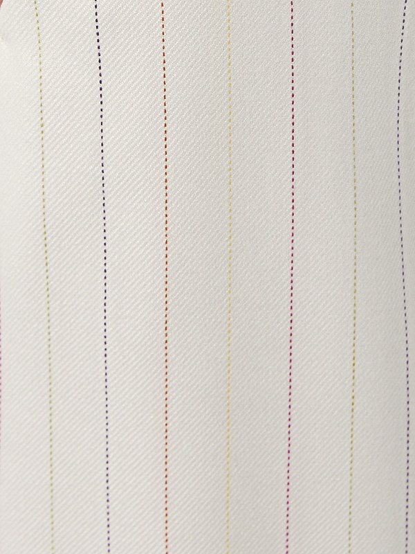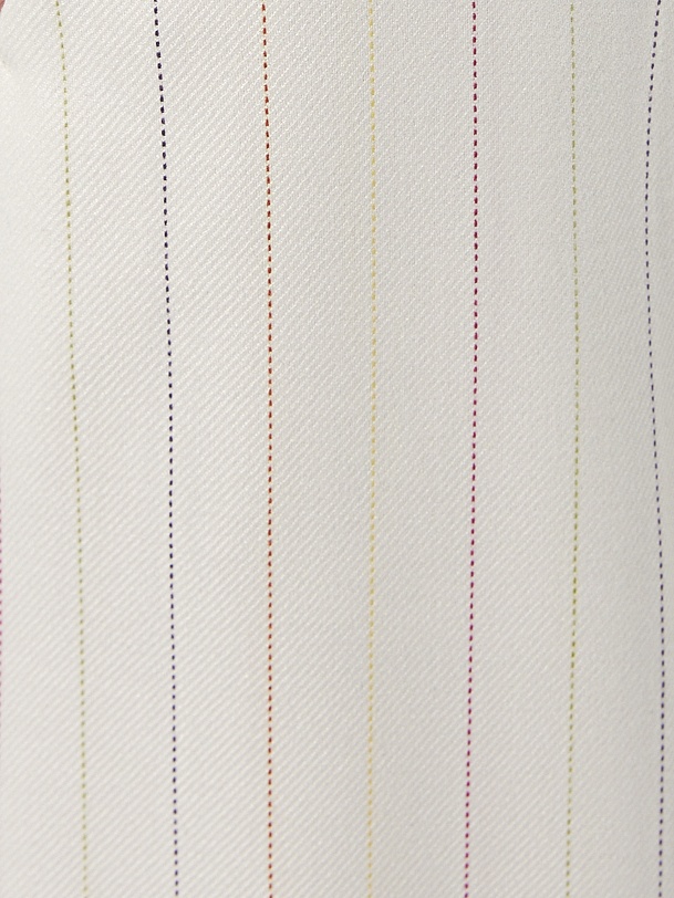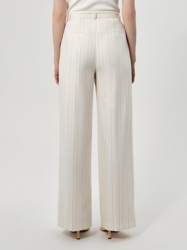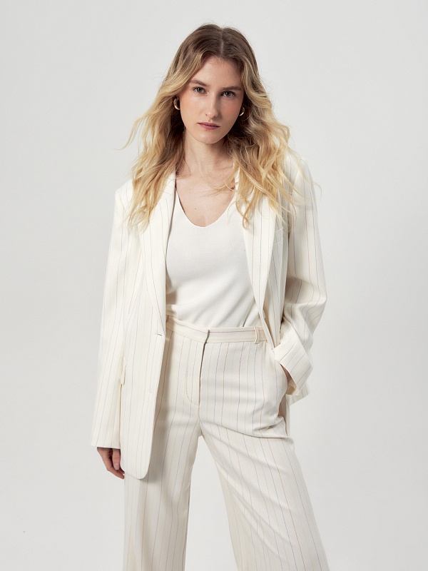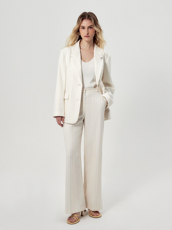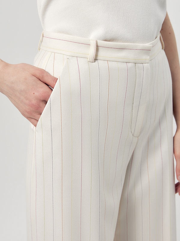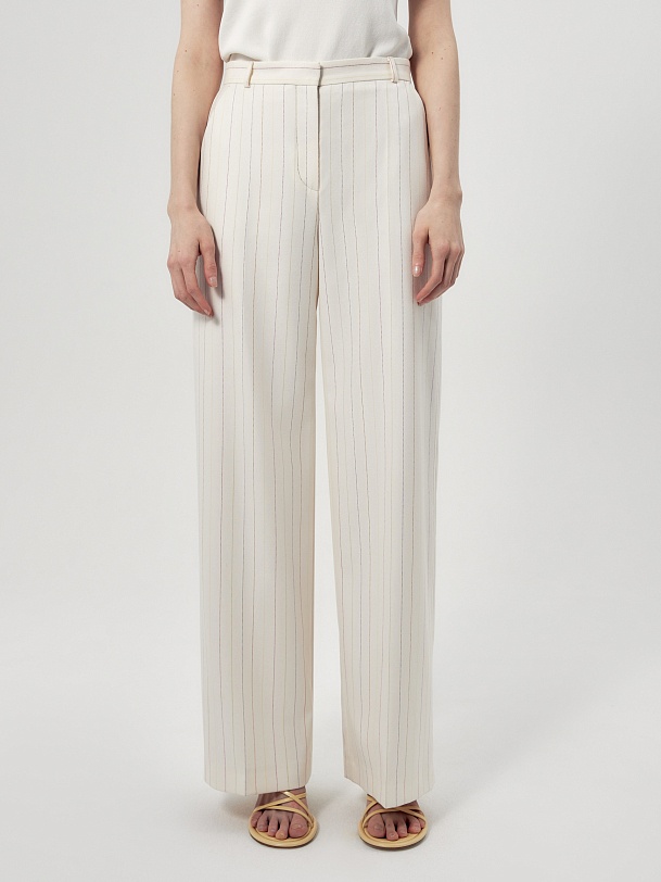 Прямые брюки свободного силуэта из костюмной ткани молочного цвета с тонкой разноцветной полоской. Имеют два функциональных кармана по бокам и два прорезных кармана сзади. Брюки идеально сочетаются с жакетом из одной ткани.