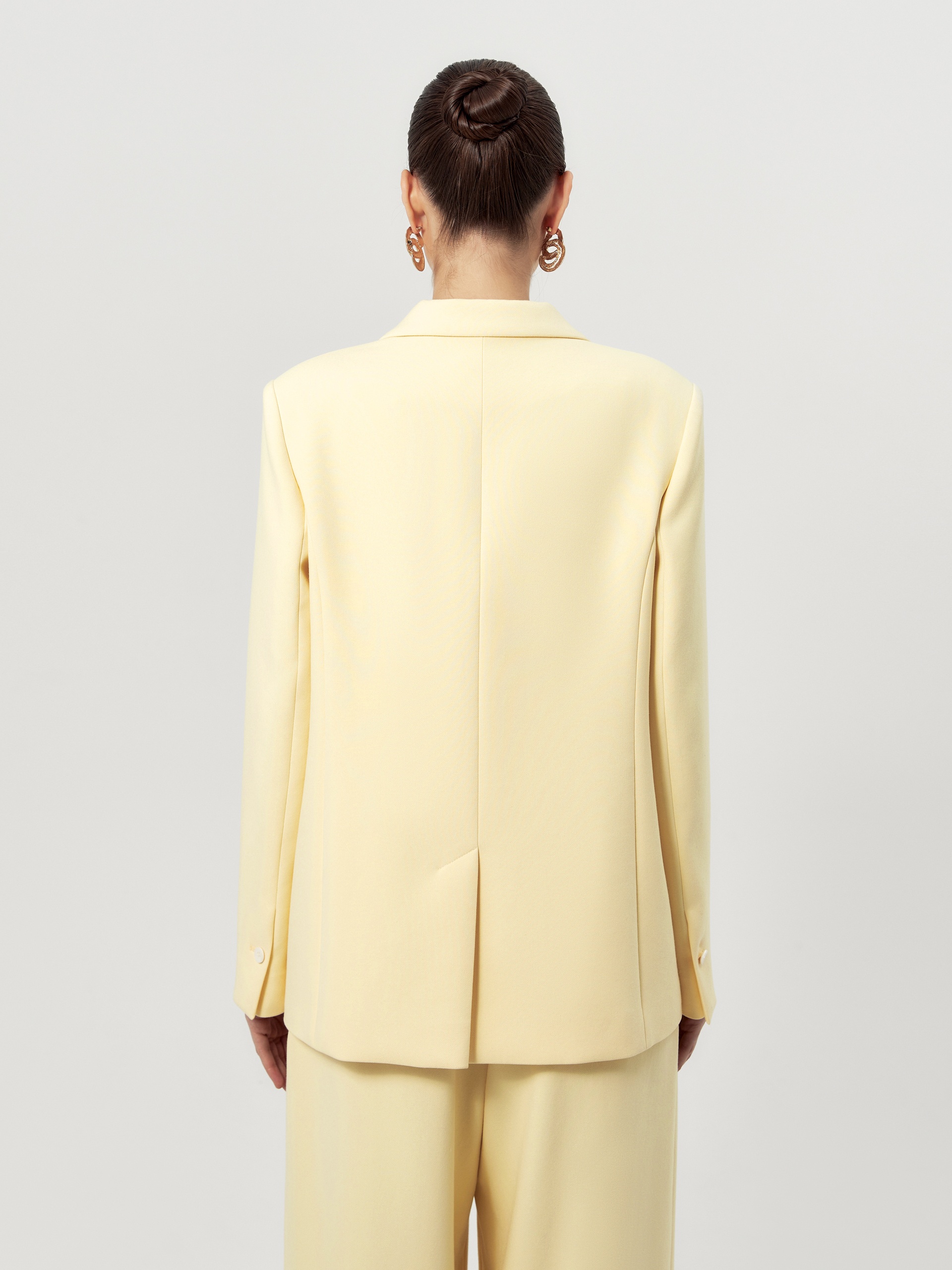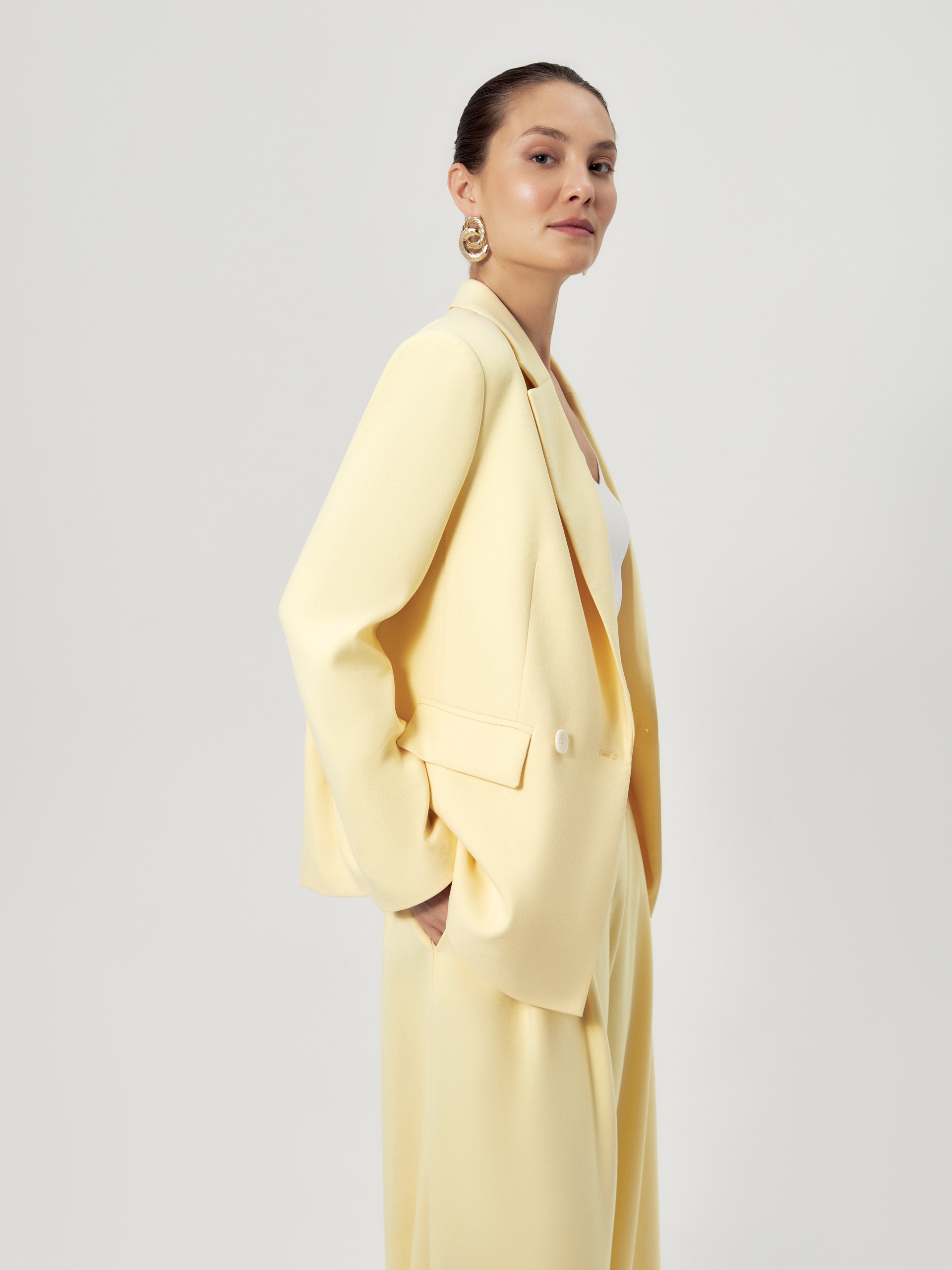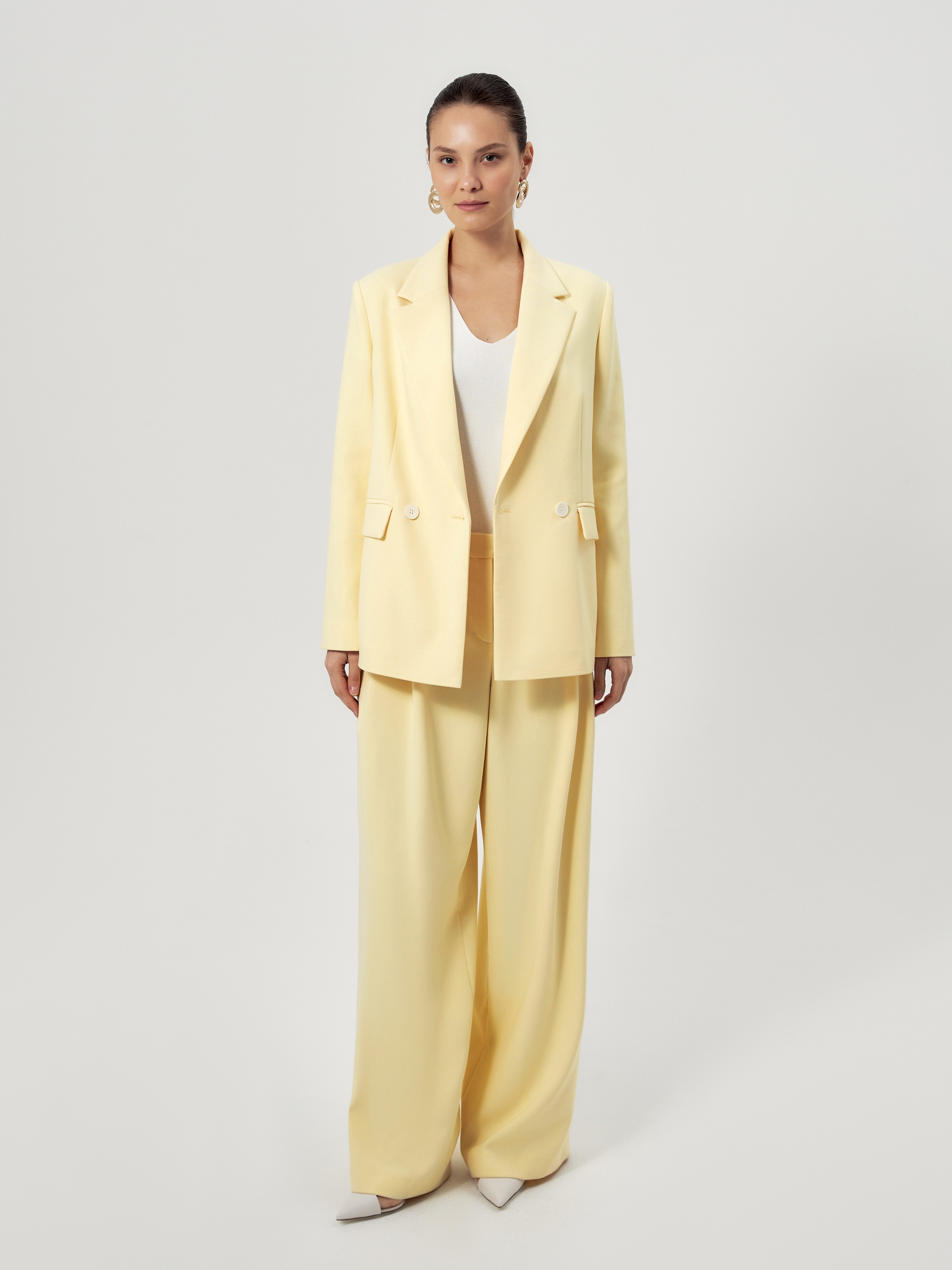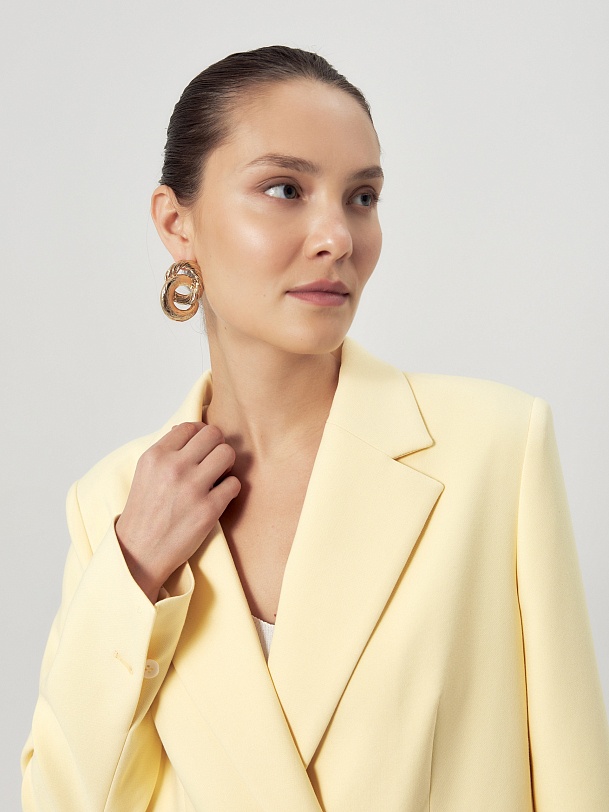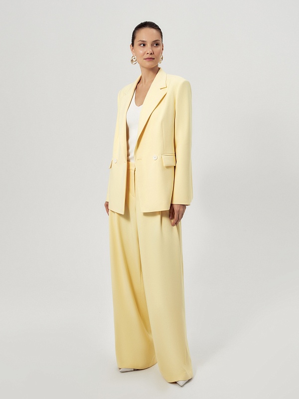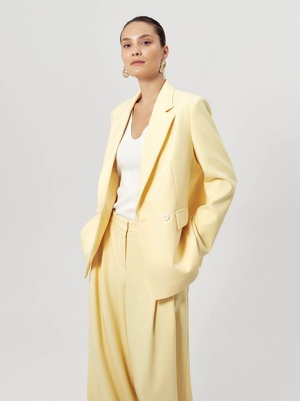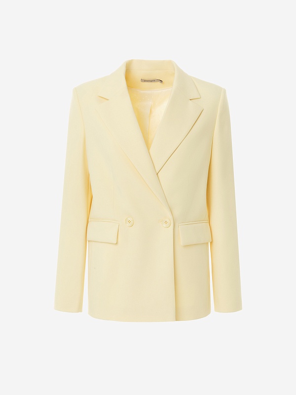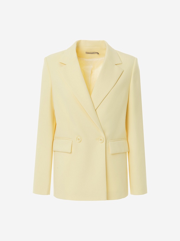 Удлиненный двубортный жакет прямого силуэта в нежно-желтом цвете из хлопковой костюмной ткани. Рукав полной длины с одной пуговицей на шлице. Прорезной карман с клапаном. Жакет на подкладке.