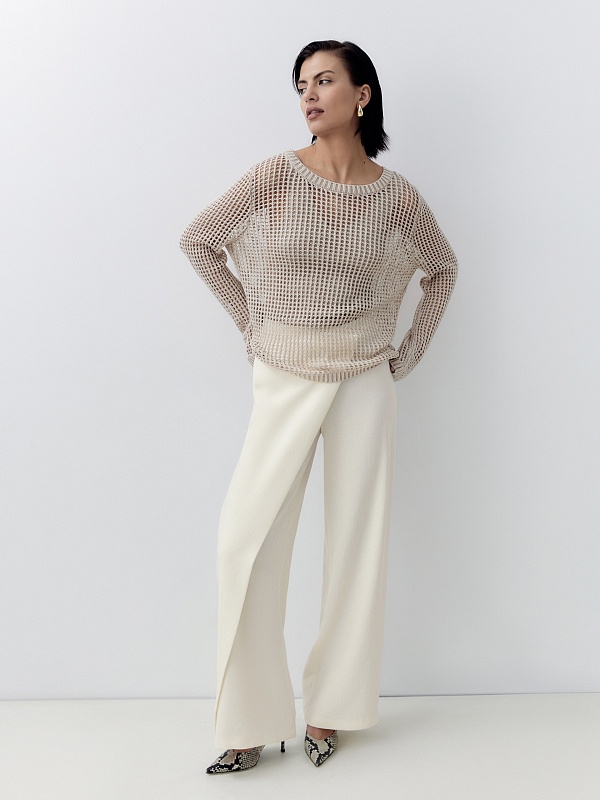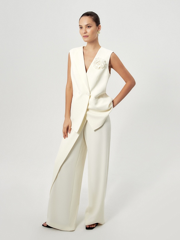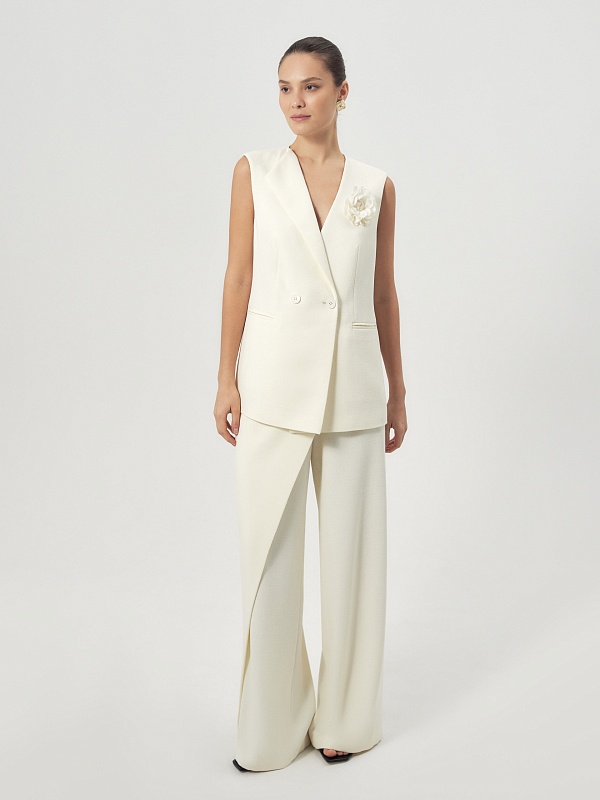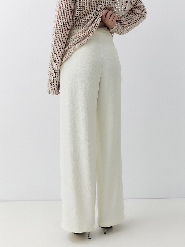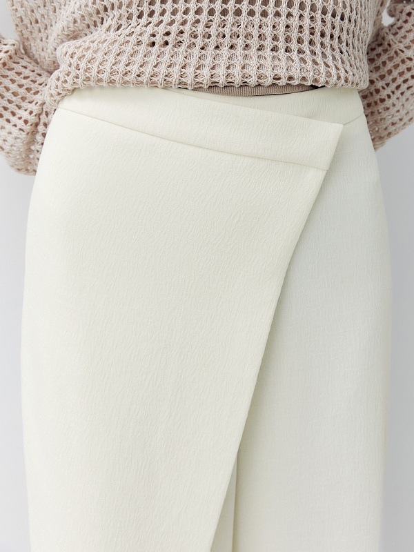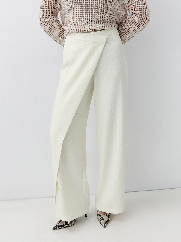 Широкие брюки с запахом на притачном поясе и потайной молнией в боковом шве. Запах закреплен. Брюки выполнены из плательной ткани сливочного цвета.