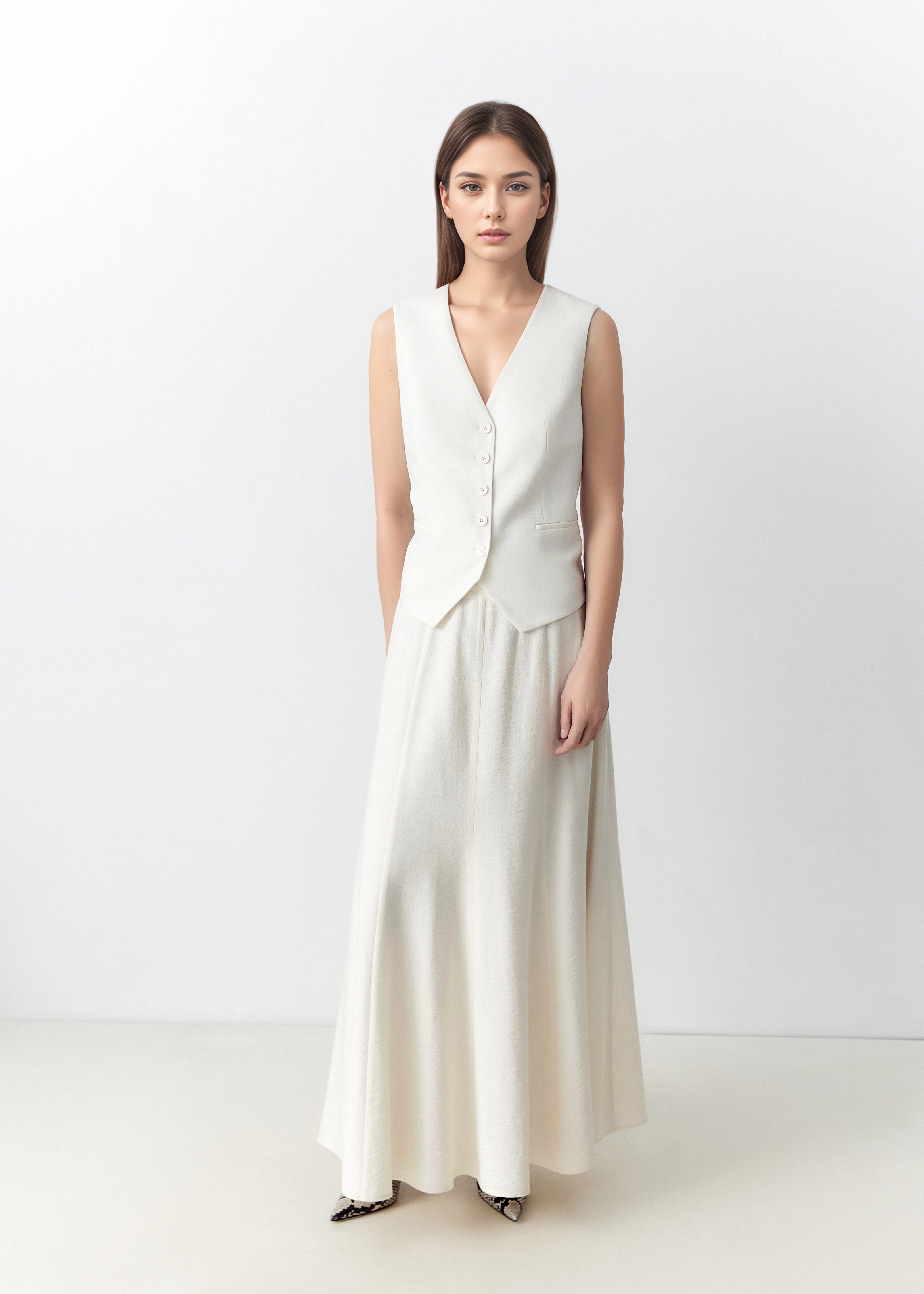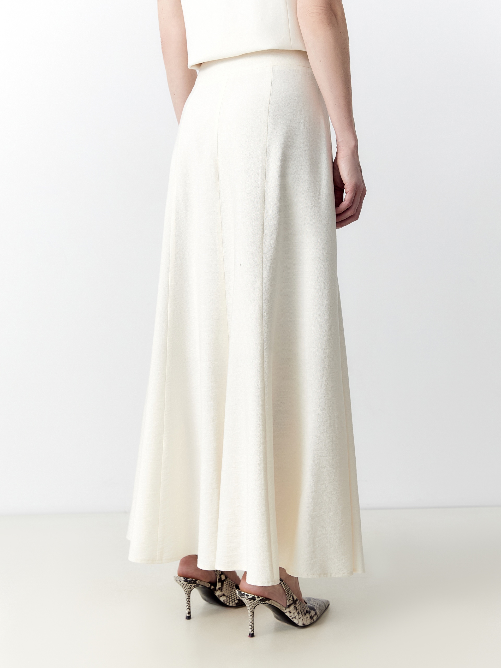 Юбка миди силуэта годе с клиньями на подкройном поясе с потайной молнией в боковом шве. Юбка выполнена из плательной ткань сливочного цвета.