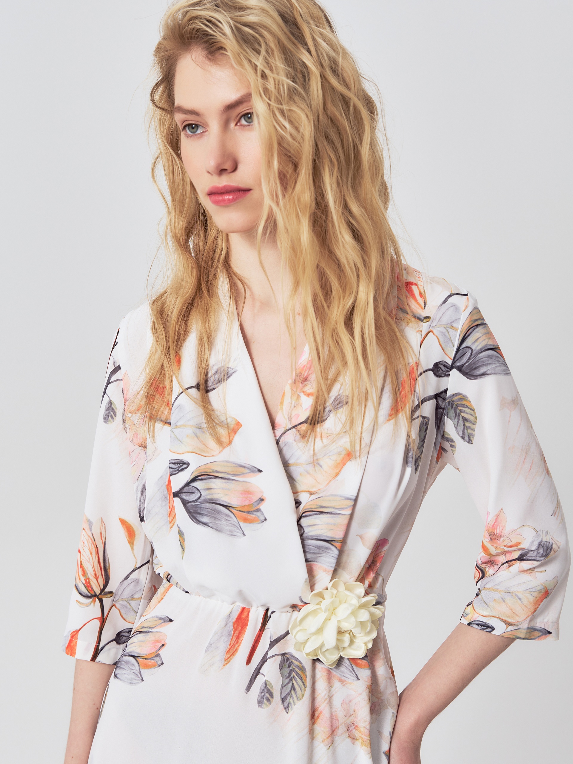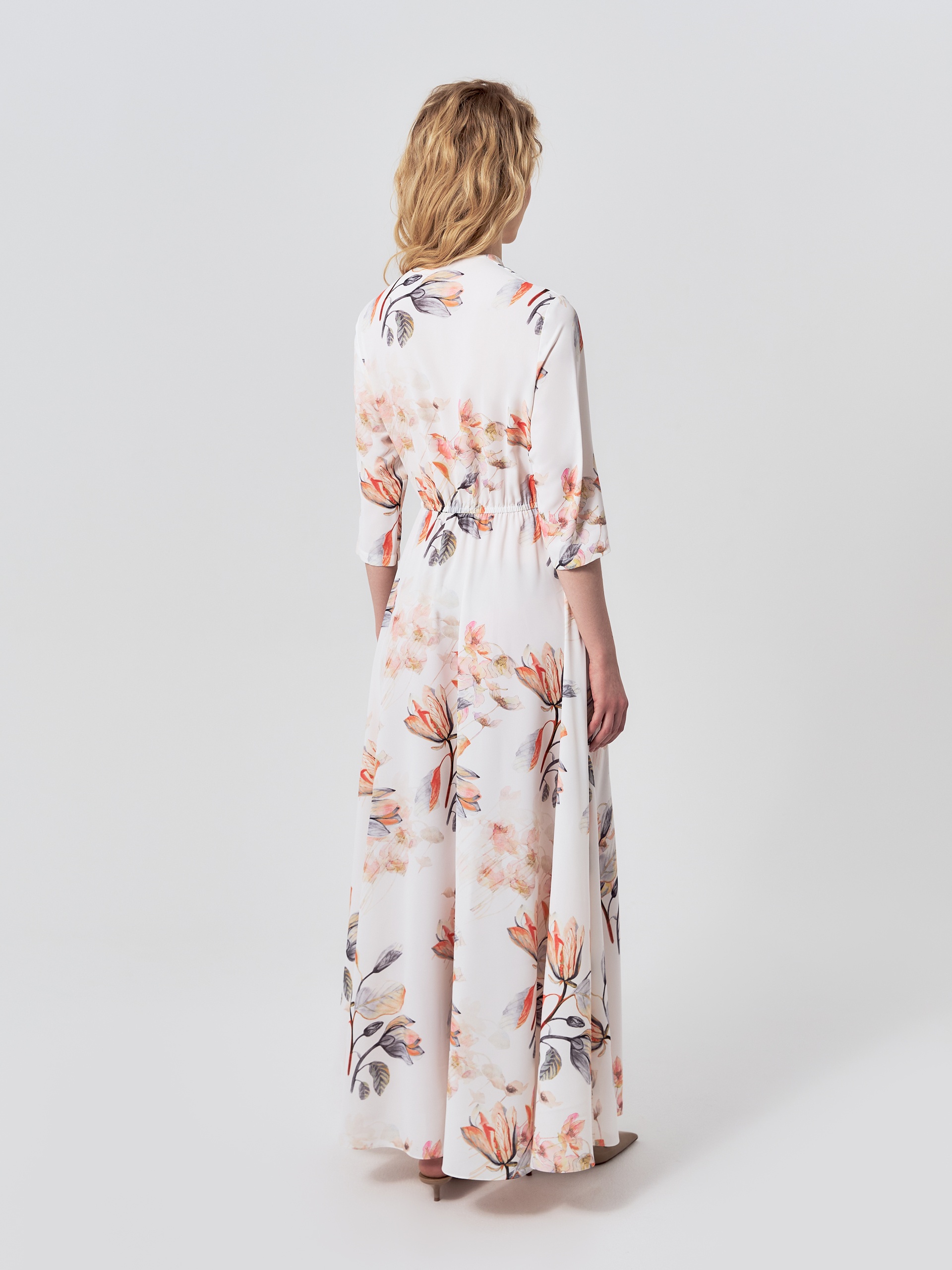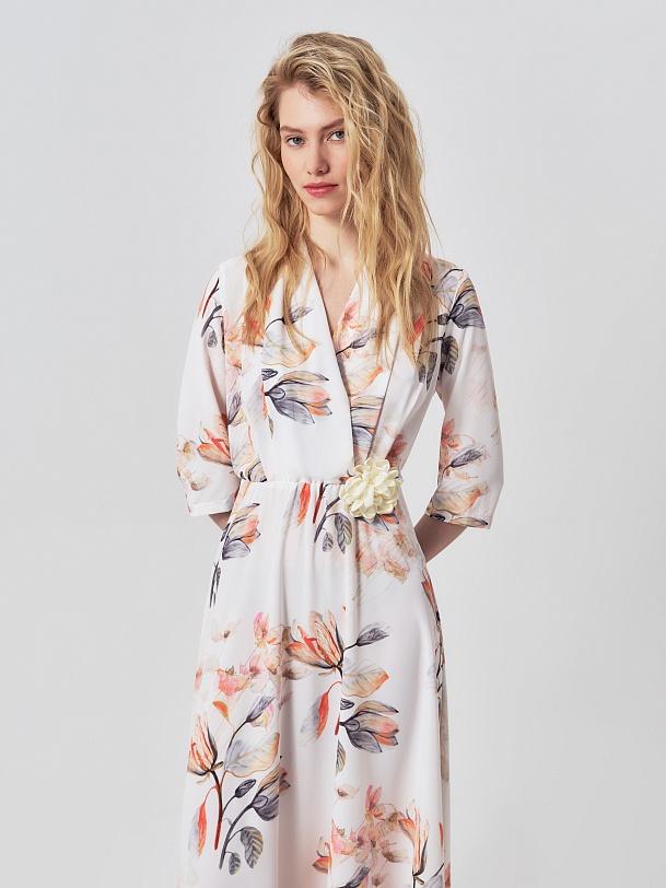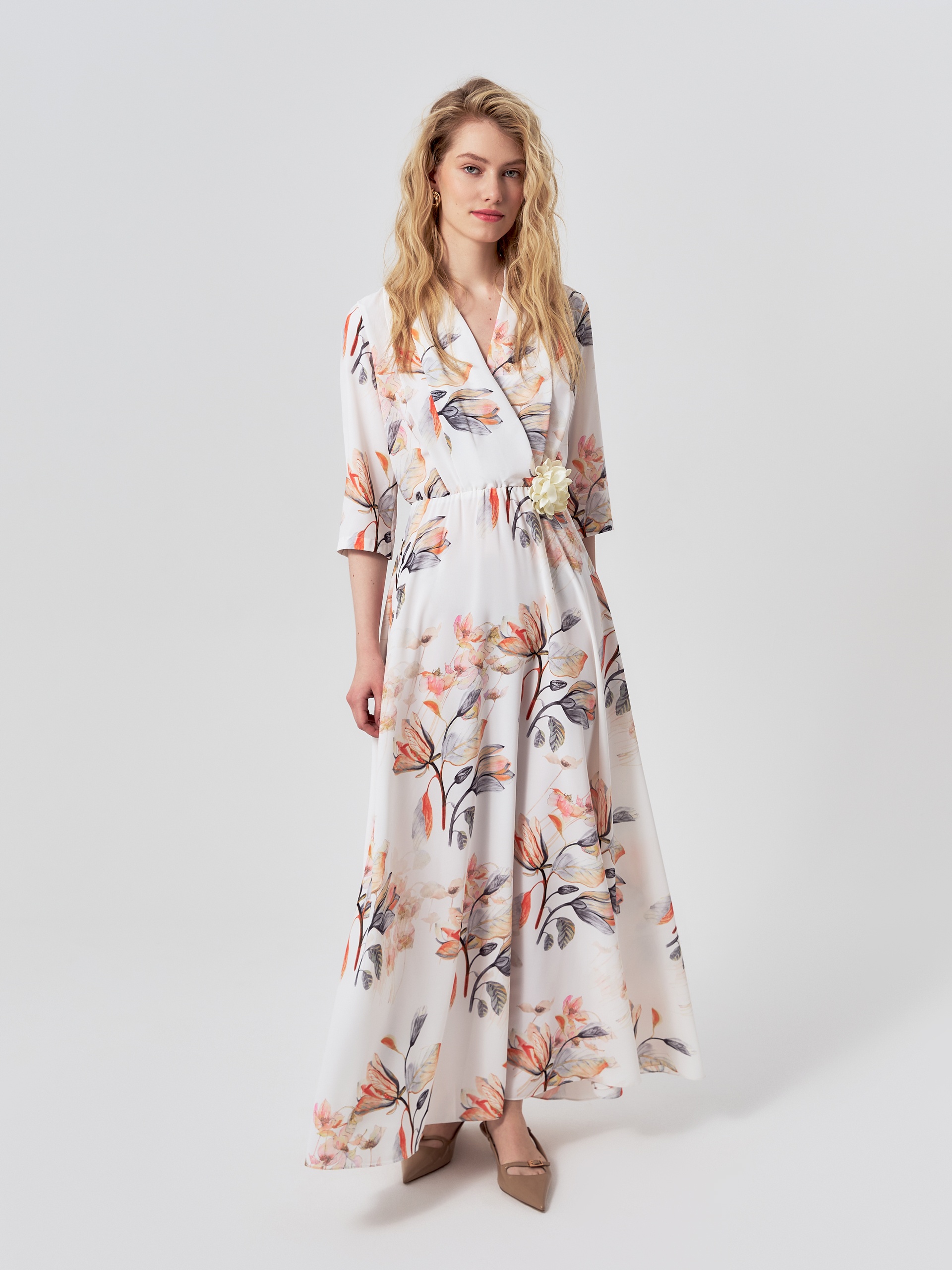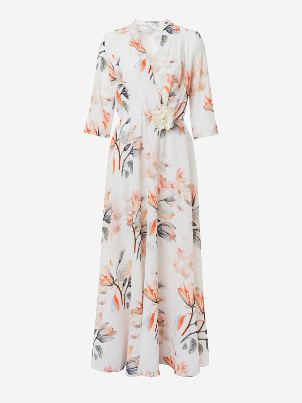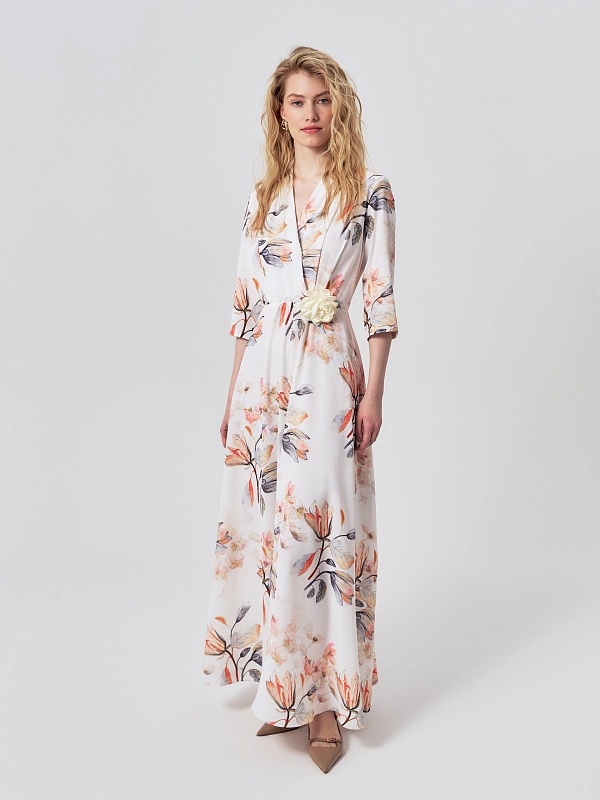 Платье A-силуэта длиной макси с V-образным вырезом с имитацией запаха и складками по плечам, рукав прямой широкий за локоть. Платье выполнено из атласной ткани с романтичным цветочным принтом. На талии есть цветок - брошка.