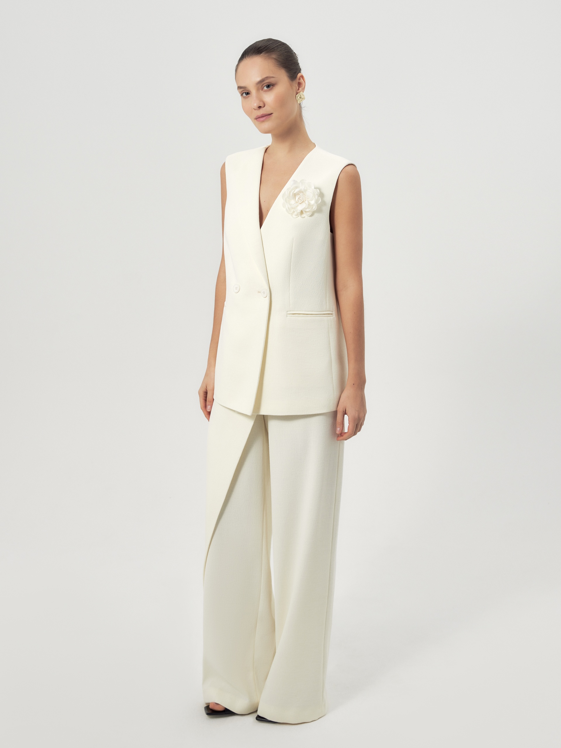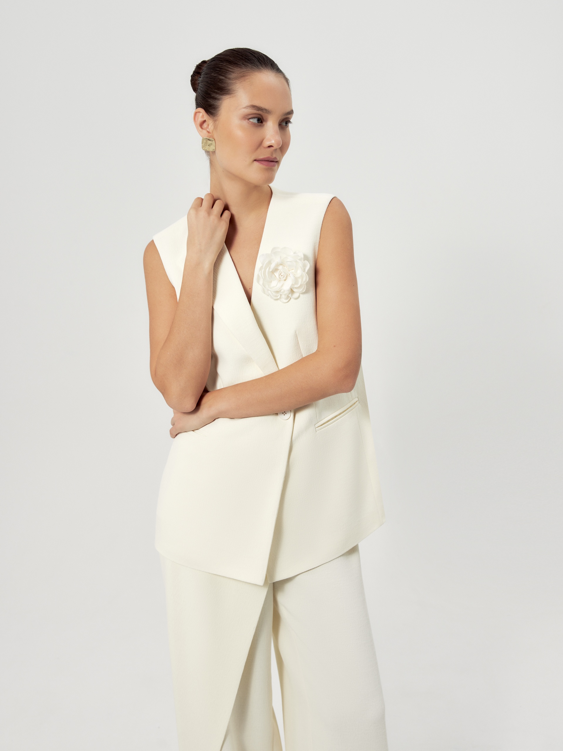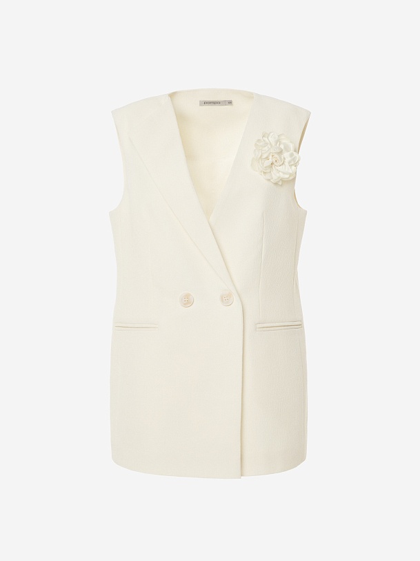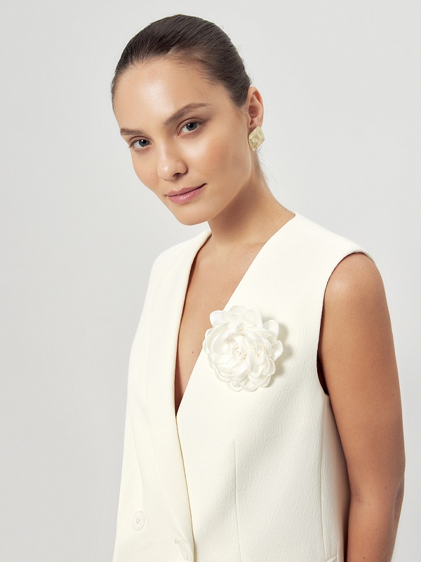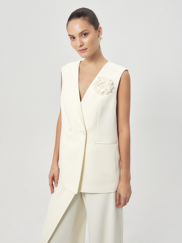 Двубортный жилет прямого силуэта с асимметричным воротником, прорезными карманами и шлицей на спинке. В качестве декоративного элемента изысканная брошь в виде цветочного бутона.