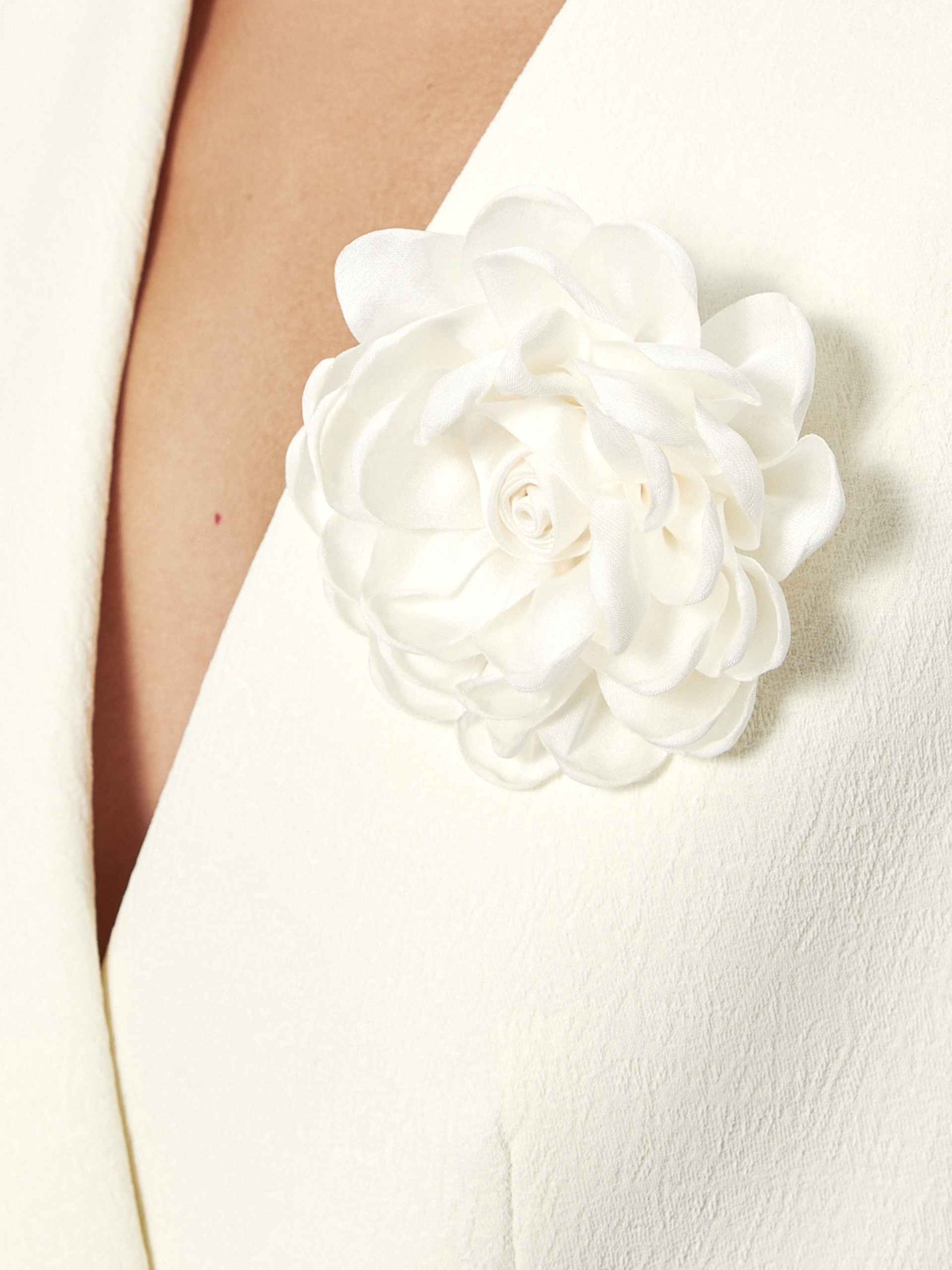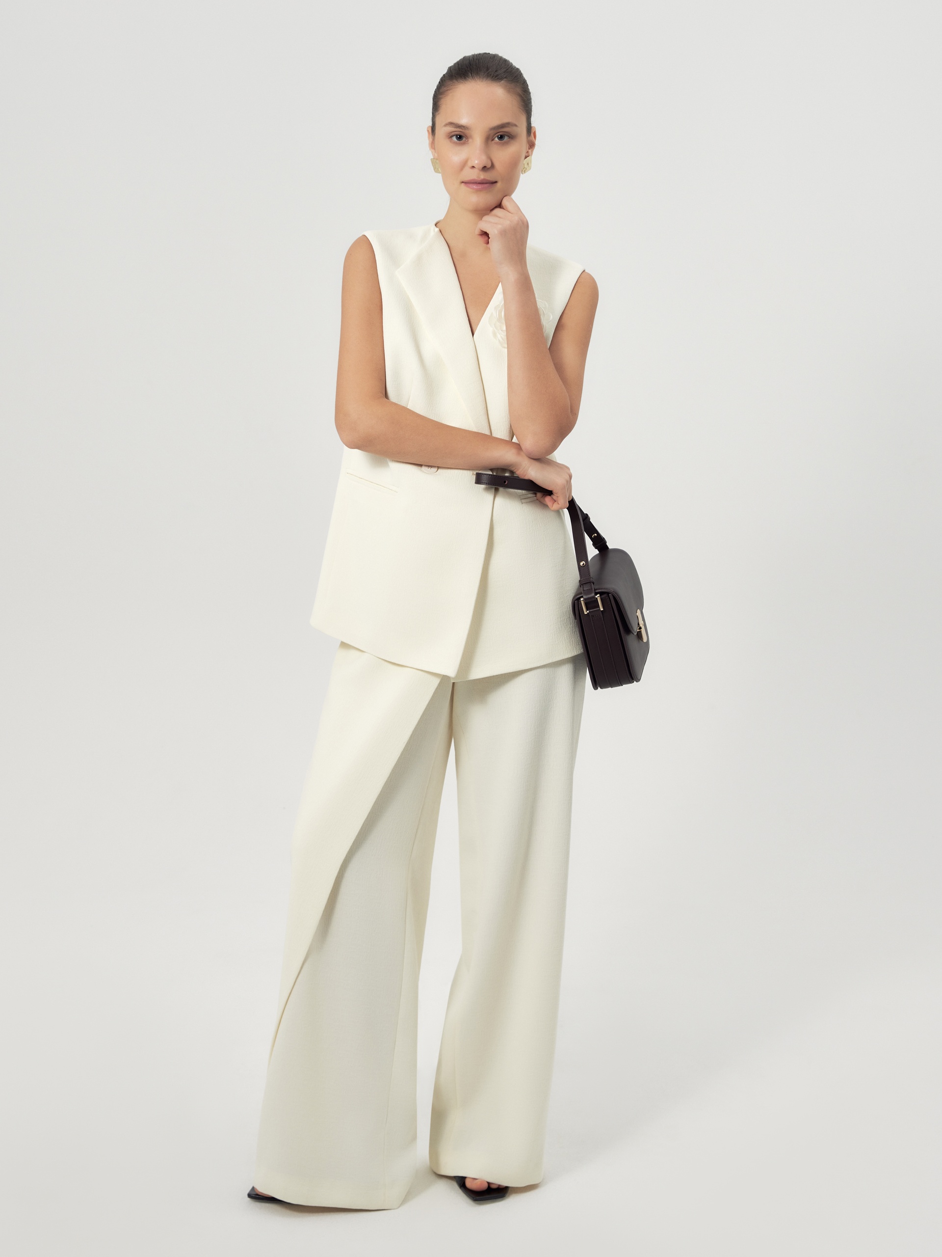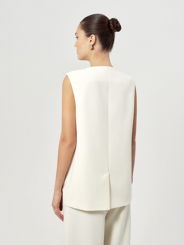 Двубортный жилет прямого силуэта с асимметричным воротником, прорезными карманами и шлицей на спинке. В качестве декоративного элемента изысканная брошь в виде цветочного бутона.